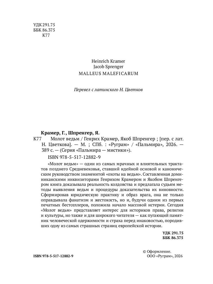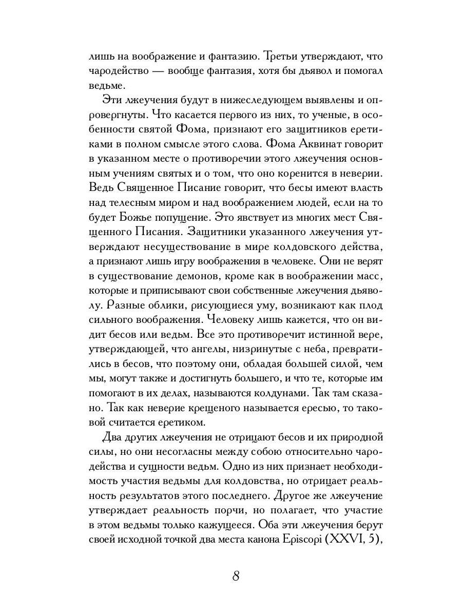 Знаменитый средневековый трактат «Молот ведьм» написан в конце XV века теологами-доминиканцами Я. Шпренгером и Г. Инститорисом. Объединяя в себе методы распознавания сатанинских выходок, способы снятия колдовства и описание процедуры ведения допросов и пыток, трактат стал одним из самых значительных документальных свидетельств средневековой инквизиции. Повествование организовано в виде ответов на вопросы, разделенные на три тематических блока: о силах, составляющих колдовство, о способах околдования и снятия колдовства и о способах искоренения или наказания ведьм и еретиков.| Издательство | Т8 RUGRAM |