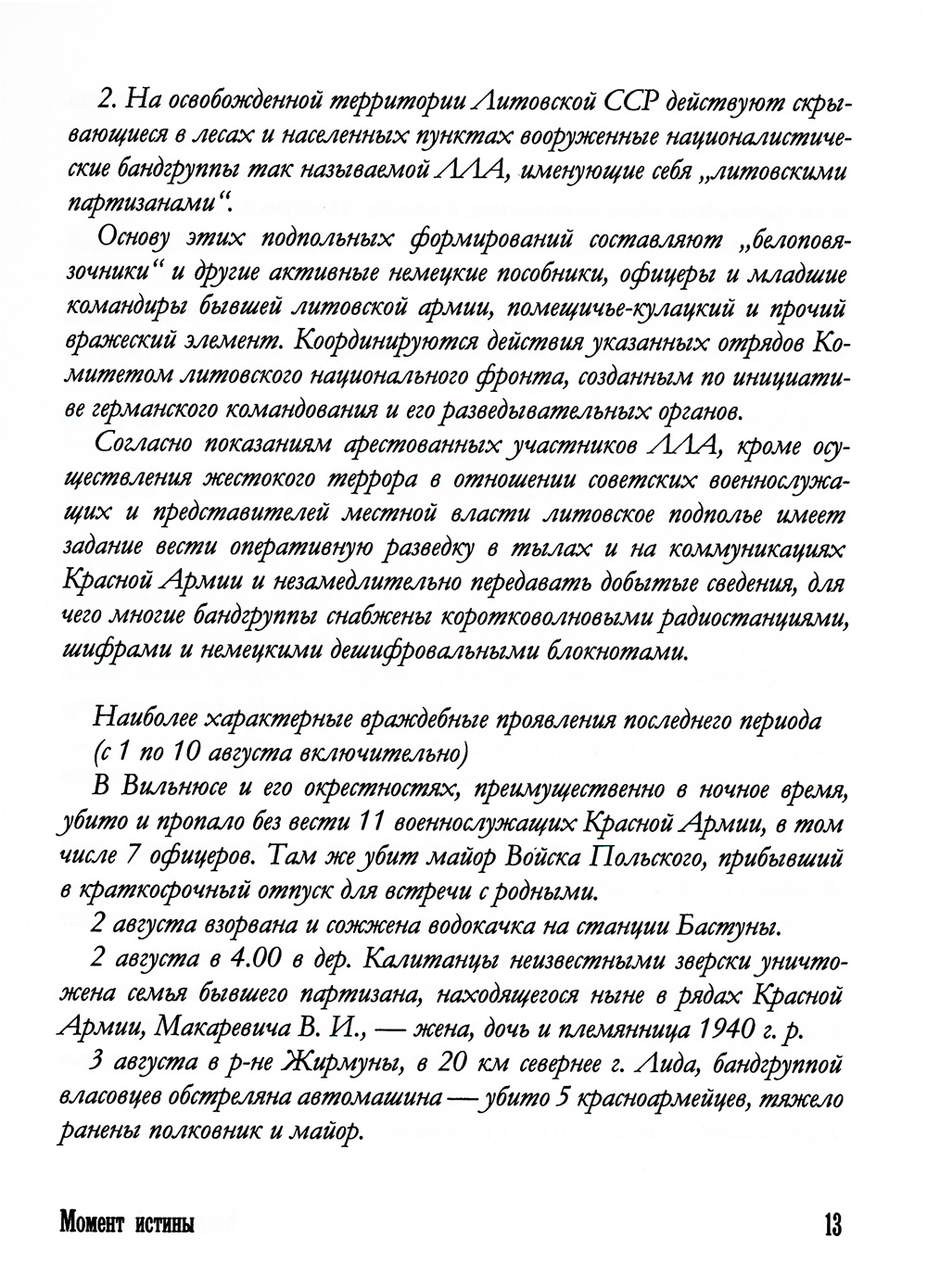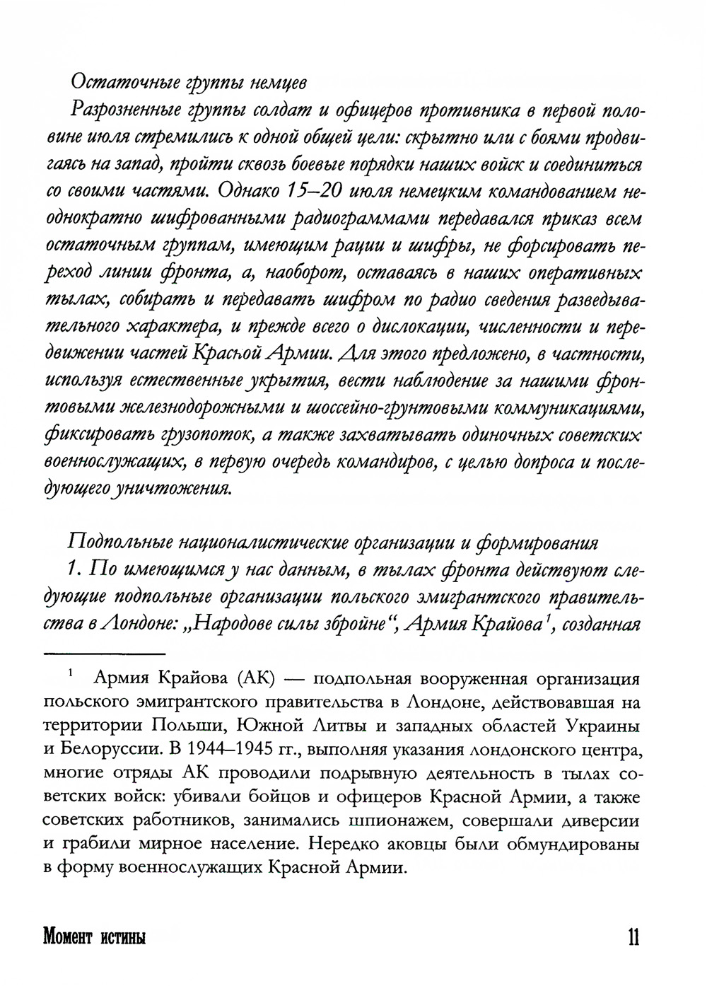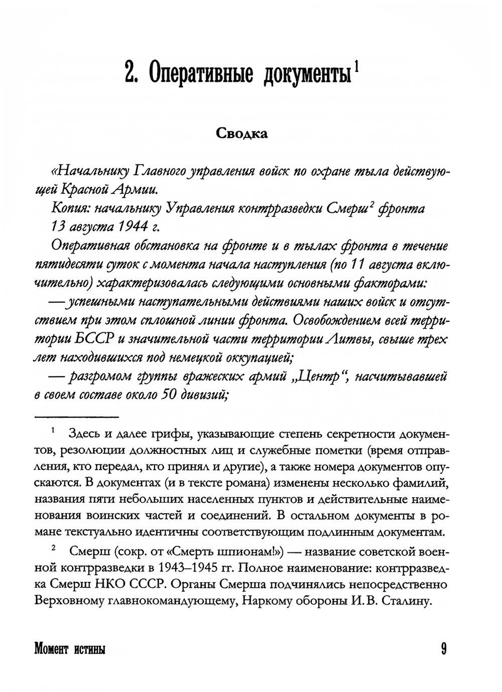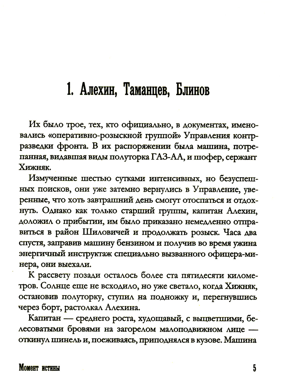 В своем романе "Момент истины" Владимир Богомолов смог "реалистически показать трудную, самоотверженную работу армейских контрразведчиков на фронте". Более того, глубокое понимание темы, сочувствие и любовь к советскому солдату, личный опыт в разведдеятельности помогли автору создать большой роман о большом подвиге. Действие романа происходит в августе 1944 г. на территории Южной Литвы и Западной Белоруссии. Оперативно-розыскная группа во главе с капитаном Павлом Алехиным УКР СМЕРШ 3-го Белорусского фронта разыскивает нацистскую разведывательно-диверсионную группу "Неман" во главе с опаснейшим агентом германской разведки И. Г. Мищенко. Германские агенты создают угрозу рассекретить подготовку важнейшей наступательной операции Красной Армии в Прибалтике.