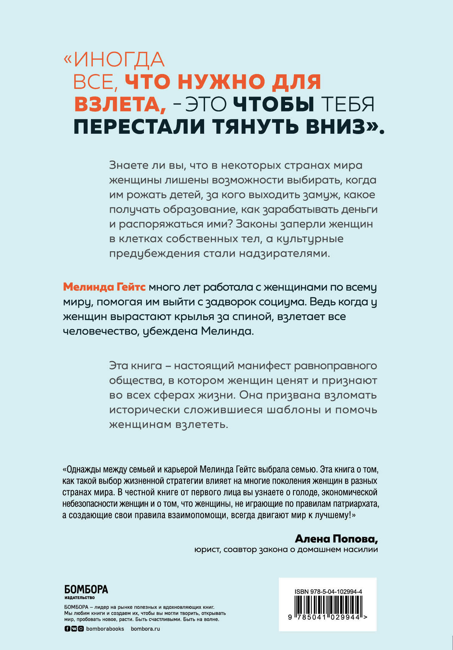 ОБ АВТОРЕ Мелинда Френч Гейтс - филантроп, бизнес-леди и всемирный защитник интересов женщин и девочек. Как сопредседатель Фонда Билла и Мелинды Гейтс, Мелинда задает направление и приоритеты крупнейшей в мире благотворительной деятельности. Она также является основателем Pivotal Ventures, инвестиционной и инкубационной компании, работающей над социальным прогрессом женщин и семей в Соединенных Штатах. ОТЗЫВЫ «Однажды между семьей и карьерой Мелинда Гейтс выбрала семью. Эта книга о том, как такие выборы жизненных стратегий влияют на многих женщин и многие поколения женщин в разных странах мира, о голоде, экономической небезопасности женщин и о многом другом в честной книге от первого лица. А ещё про то, что женщины, не играющие по правилам патриархата, а создающие свои правила взаимопомощи, всегда двигают мир к лучшему!» - Алена Попова, юрист, соавтор закона о домашнем насилии «В своей книге Мелинда рассказывает истории вдохновляющих людей, которых она встретила по всему миру благодаря своей работе. Собрав данные, она убедительно иллюстрирует проблемы, требующие нашего внимания - от детских браков до гендерного неравенства на рабочем месте». - Президент Барак Обама «Мелинда Гейтс много лет работала с женщинами по всему миру. Эта книга - настоятельный манифест равноправного общества, в котором женщин ценят и признают во всех сферах жизни. Прежде всего, это призыв к единству, включению и соединению. Нам это послание нужно больше, чем когда-либо». - Малала Юсуфзай «Вдохновляющий взгляд на необходимость расширения прав и возможностей женщин для изменения мира». - Вашингтон пост ЦИТАТЫ • Когда разрушается доминирующая культура, в каждом из нас появляется сила. • Преодоление потребности выделять изгоев - это величайшая задача для нас как для людей. Это ключ к преодолению неравенства. • Матери, получившие образование, лучше усваивают информацию о правильном питании, вакцинации и других формах поведения, необходимых для воспитания здоровых детей. • Мы должны открыться людям. Мы должны отказаться от желания обособиться или возвыситься над другими людьми. • Мужское доминирование вредно для общества, потому что вредно доминирование любой из сторон.| Издательство | ООО "Издательство "Эксмо" |