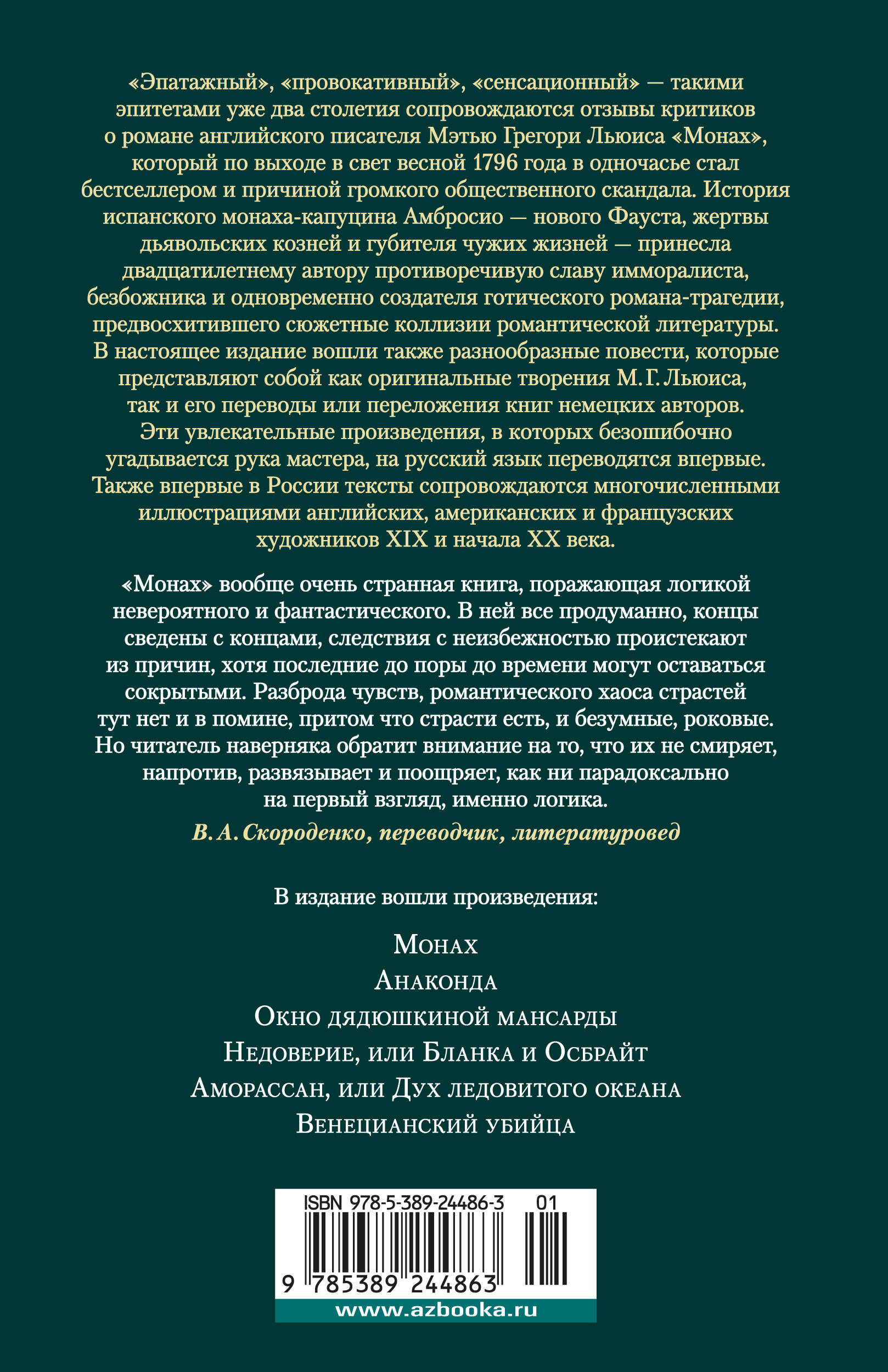 "Эпатажный", "провокативный", "сенсационный" - такими эпитетами уже два столетия сопровождаются отзывы критиков о романе английского писателя Мэтью Грегори Льюиса "Монах", который по выходе в свет весной 1796 года в одночасье стал бестселлером и причиной громкого общественного скандала. История испанского монаха-капуцина Амбросио - нового Фауста, жертвы дьявольских козней и губителя чужих жизней - принесла двадцатилетнему автору противоречивую славу имморалиста, безбожника и одновременно создателя готического романа-трагедии, предвосхитившего сюжетные коллизии романтической литературы. В настоящее издание вошли также разнообразные повести, которые представляют собой как оригинальные творения М. Г. Льюиса, так и его переводы или переложения книг немецких авторов. Эти увлекательные произведения, в которых безошибочно угадывается рука мастера, на русский язык переводятся впервые. Также впервые в России тексты сопровождаются многочисленными иллюстрациями английских, американских и французских художников XIX и начала XX века.| Издательство | Азбука-Аттикус Издат.группа ООО |
