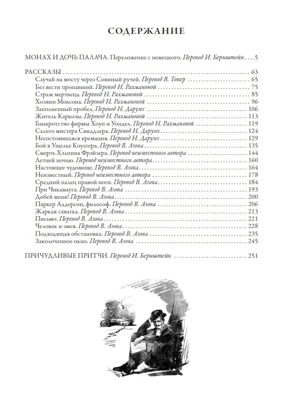 К классикам американской литературы Амброз Бирс был причислен в середине ХХ века; к тому времени писателя давно не было в живых. Вероятно, он бы удивился, узнав, что славу ему принесли мрачные и пропитанные циничным взглядом на жизнь рассказы и повести в стиле «готической прозы». Около дюжины из них вошли в золотой фонд американской классики. Амброз писал их скорее для узкого круга почитателей, чем для широкой публики, которой Бирс был известен прежде всего как талантливый журналист, жестко бичевавший в конце XIX века пороки американского общества. Остатки юношеского романтизма Амброз утратил во время Гражданской войны, на которую он, выходец из бедной многодетной фермерской семьи, отправился добровольцем. Бирс прошел через все главные сражения, убедился в бессмысленности жертв и осел в Сан-Франциско. Возвращаться к прежним случайным заработкам не позволяла гордость - Бирс вышел в отставку в чине офицера. Найти свою, независимую дорогу в жизни помог талант сочинителя. У отца будущего писателя была неплохая библиотека - благодаря ей Амброз познакомился с литературной классикой. Позже он внес в нее свой вклад, став автором лаконичной новаторской прозы, которая оказала огромное влияние на развитие американской «темной литературы». Последователем Бирса на этом пути стал американский писатель Говард Филлипс Лавкрафт, чьи сочинения тоже полны ужасов, мистики и фатализма. Ими пропитана повесть Бирса «Монах и дочь палача», с которой начинается данный сборник. Она считается одной из вершин «готической литературы». В конце жизни обладавший неуживчивым и независимым характером писатель в каком-то смысле стал одним из своих героев-фаталистов. Бирс не захотел встречаться с немощной старостью. Достигнув возраста семидесяти лет, он пересек границу с охваченной революционным пламенем Мексикой. В ее огне он и сгинул без следа. Наверное, не просто так один из своих рассказов Бирс назвал «Без вести пропавший». Книга проиллюстрирована рисунками современной петербургской художницы Татьяны Косач. Она окончила исторический факультет Санкт-Петербургского государственного университета и является специалистом по искусству Средневековья. Ее иконописные и графические работы можно встретить в частных коллекциях любителей живописи в России, США, Италии и Франции. В серии «Библиотека мировой литературы» ее иллюстрации украшают романы «Американская трагедия» , «Финансист», «Титан», «Стоик» Теодора Драйзера, «Доктор Живаго» Бориса Леонидовича Пастернака и «Белая гвардия» Михаила Афанасьевича Булгакова.| Издательство | СЗКЭО |
