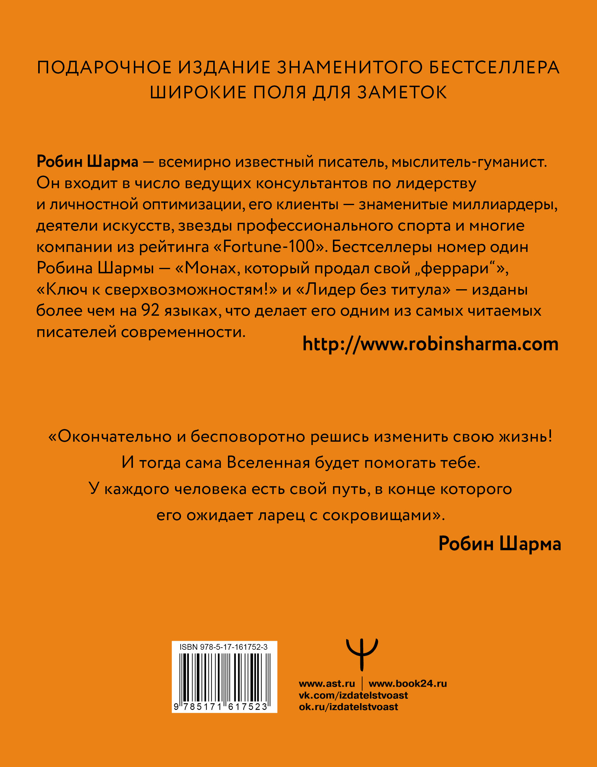 Робин Шарма - всемирно известный писатель, мыслитель-гуманист. Он входит в число ведущих консультантов по лидерству и личностной оптимизации, его клиенты - знаменитые миллиардеры, деятели искусств, звезды профессионального спорта и многие компании из рейтинга "Fortune-100". Что такое подлинный успех и как его достичь? Можно ли обрести счастье, которое не зависит ни от карьерного роста, ни от мировых кризисов? Как избавиться от бесконечной заботы о том, что будет завтра, и начать получать удовольствие от каждого прожитого дня? Существуют ли простые рецепты, позволяющие обрести духовные дары, не отказываясь от привычного комфорта? Как развить сверхспособности и подчинить себе судьбу? И, пожалуй, самое главное: как найти свое призвание и стать самим собой? Ответ - в этой книге! Вместе с бывшим миллионером Джулианом Мэнтлом вы совершите удивительное путешествие в Сивану - страну, где исполняются мечты! Это уникальное издание делает знакомство с мировым бестселлером максимально удобным и увлекательным. Качественное подарочное издание в твердом переплете станет несомненным украшением любой библиотеки. Плотная белая бумага и большие удобные поля для заметок помогут не потерять нужную информацию.| Издательство | Издательство "АСТ" |