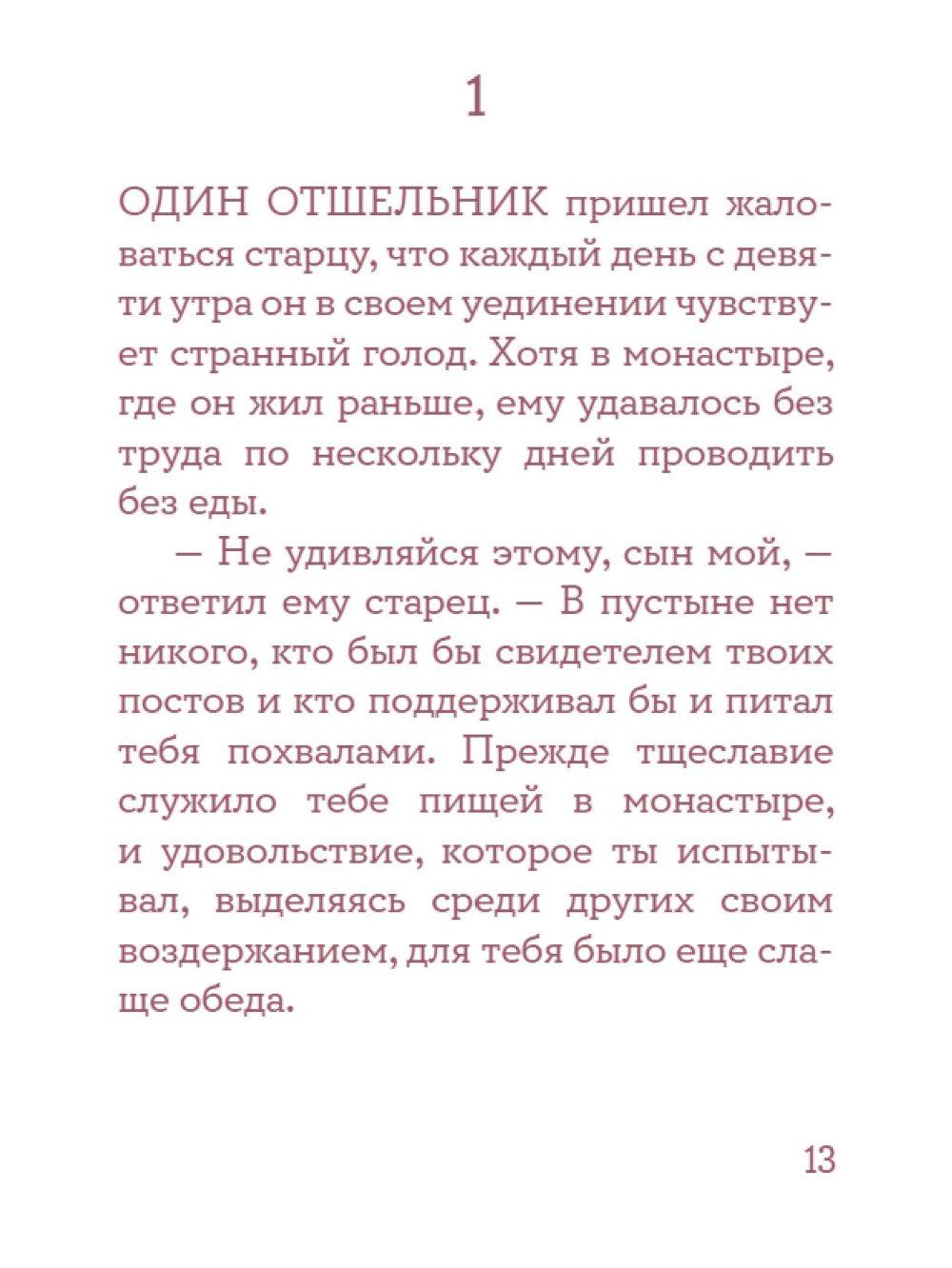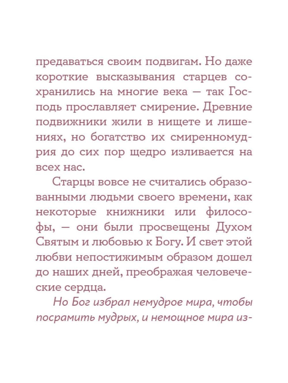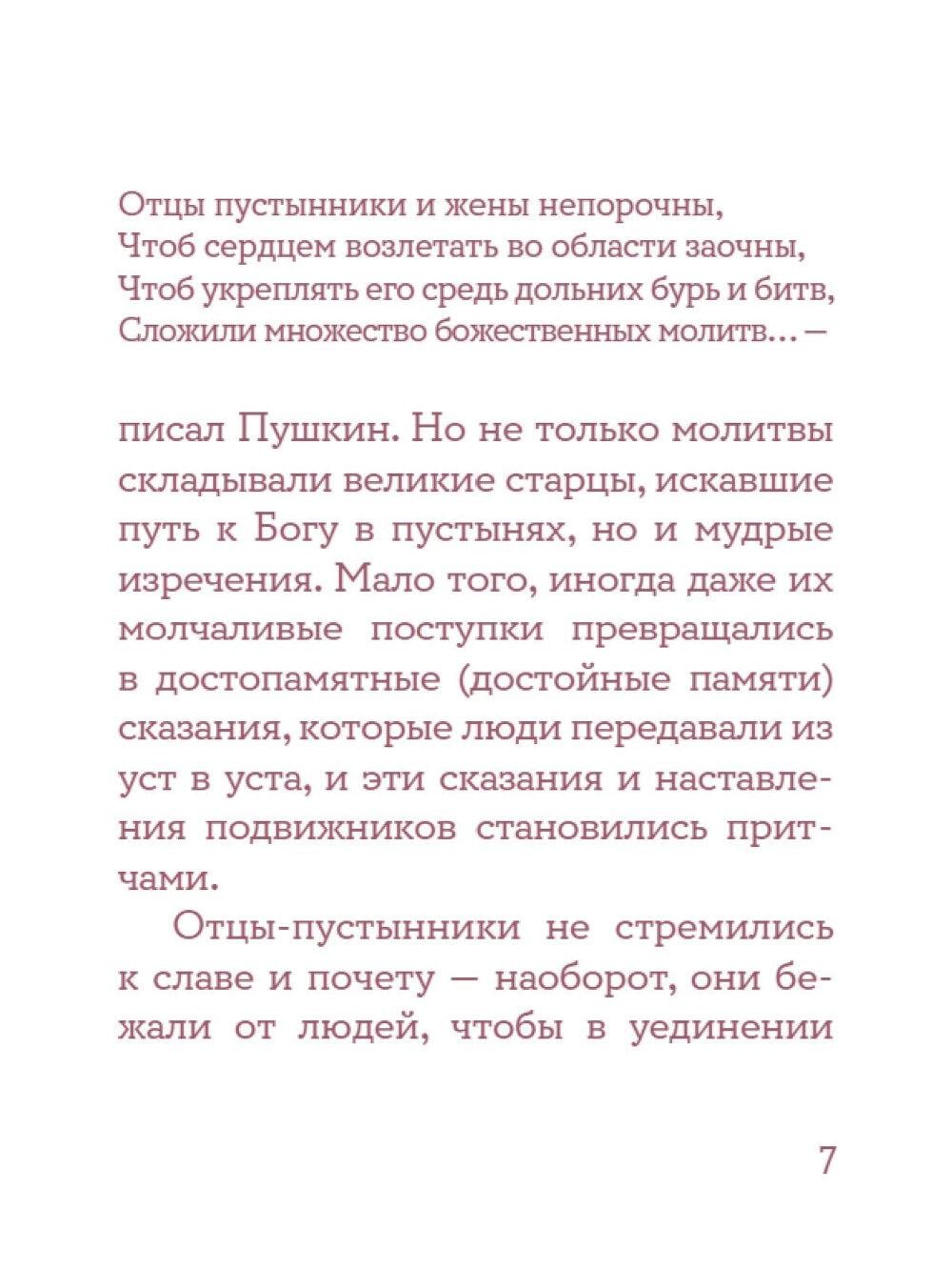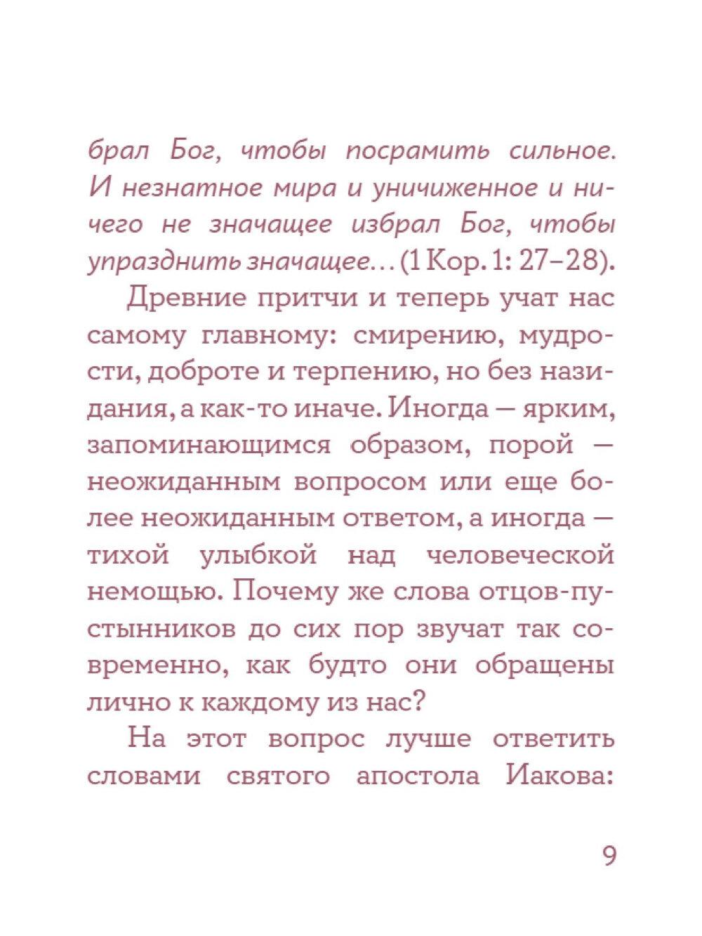 Притча - это короткий иносказательный, поучительный рассказ. В сборник вошла сто одна притча о древних отцах-пустынниках, живших начиная с IV века в пустынях Египта, Палестины и других уединенных местах. Этот таинственный, малознакомый нам мир подвижников открывается в их мудрых поступках и высказываниях. Старцы были просвещены Духом Святым и любовью к Богу. И свет этой любви непостижимым образом дошел до наших дней, преображая человеческие сердца.