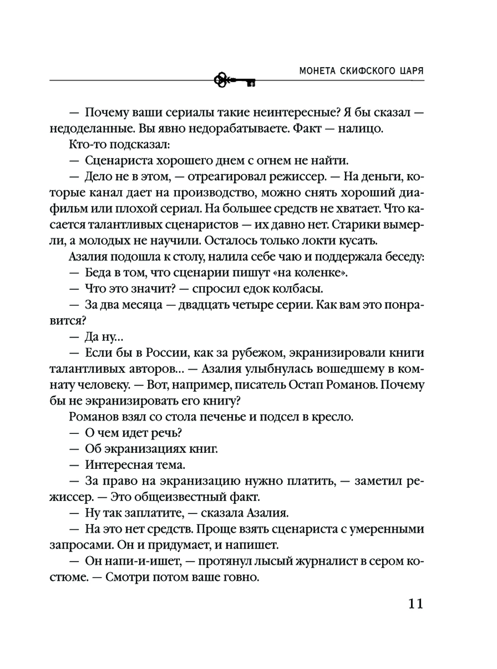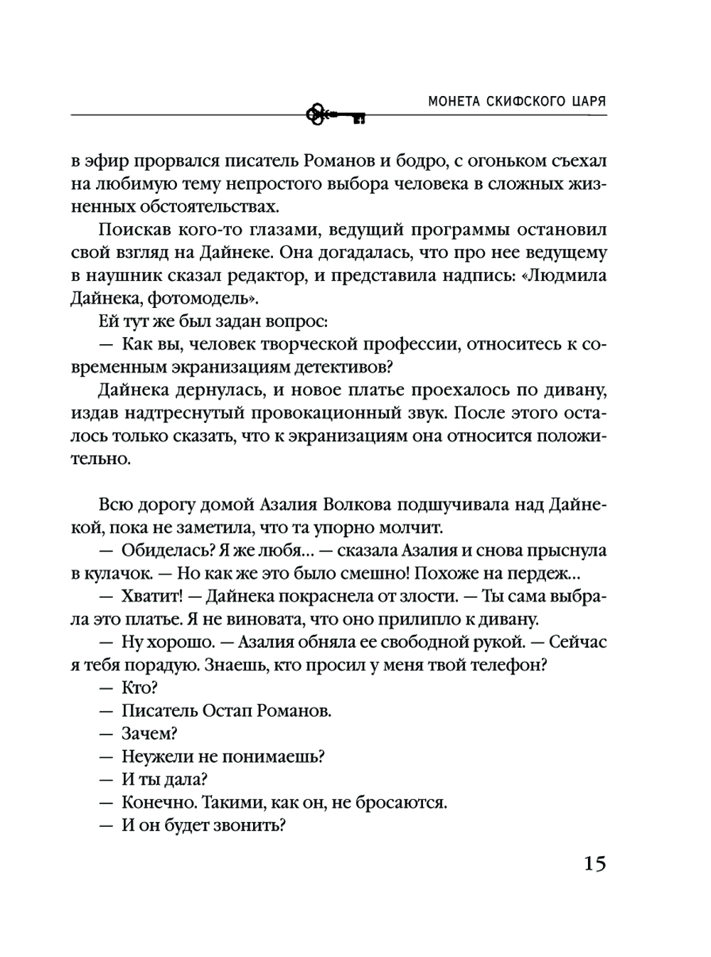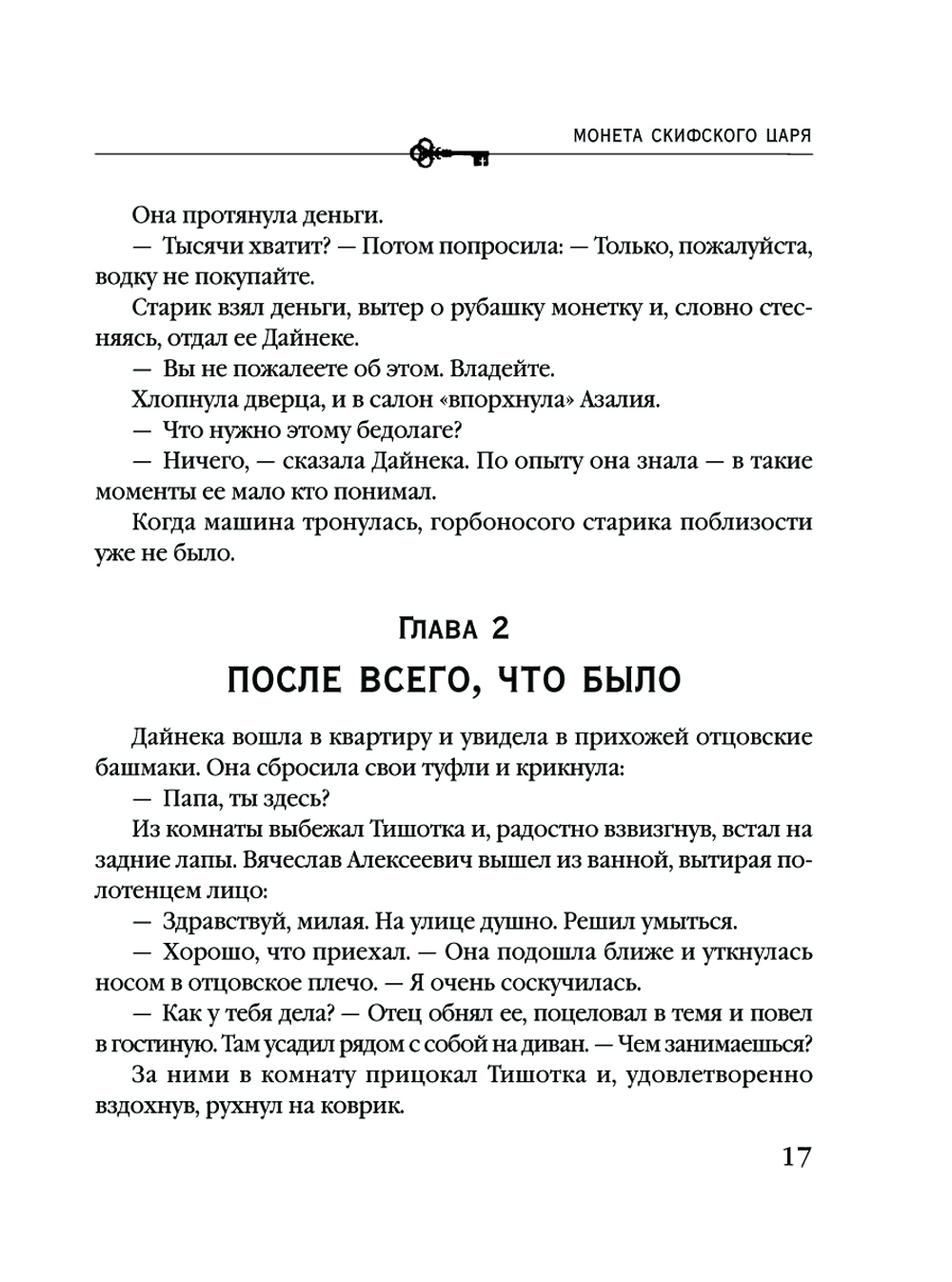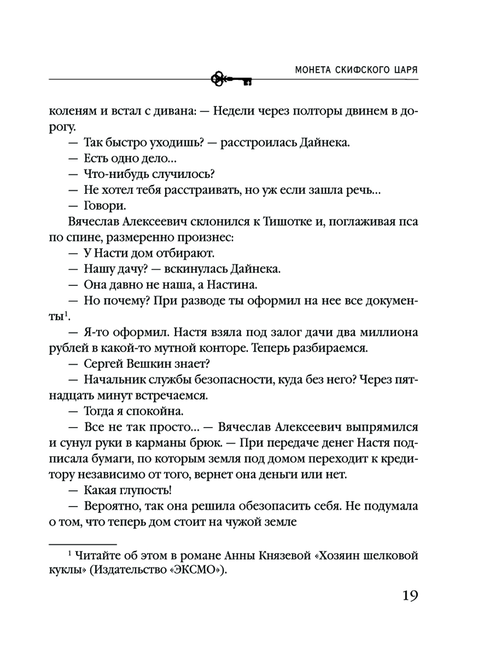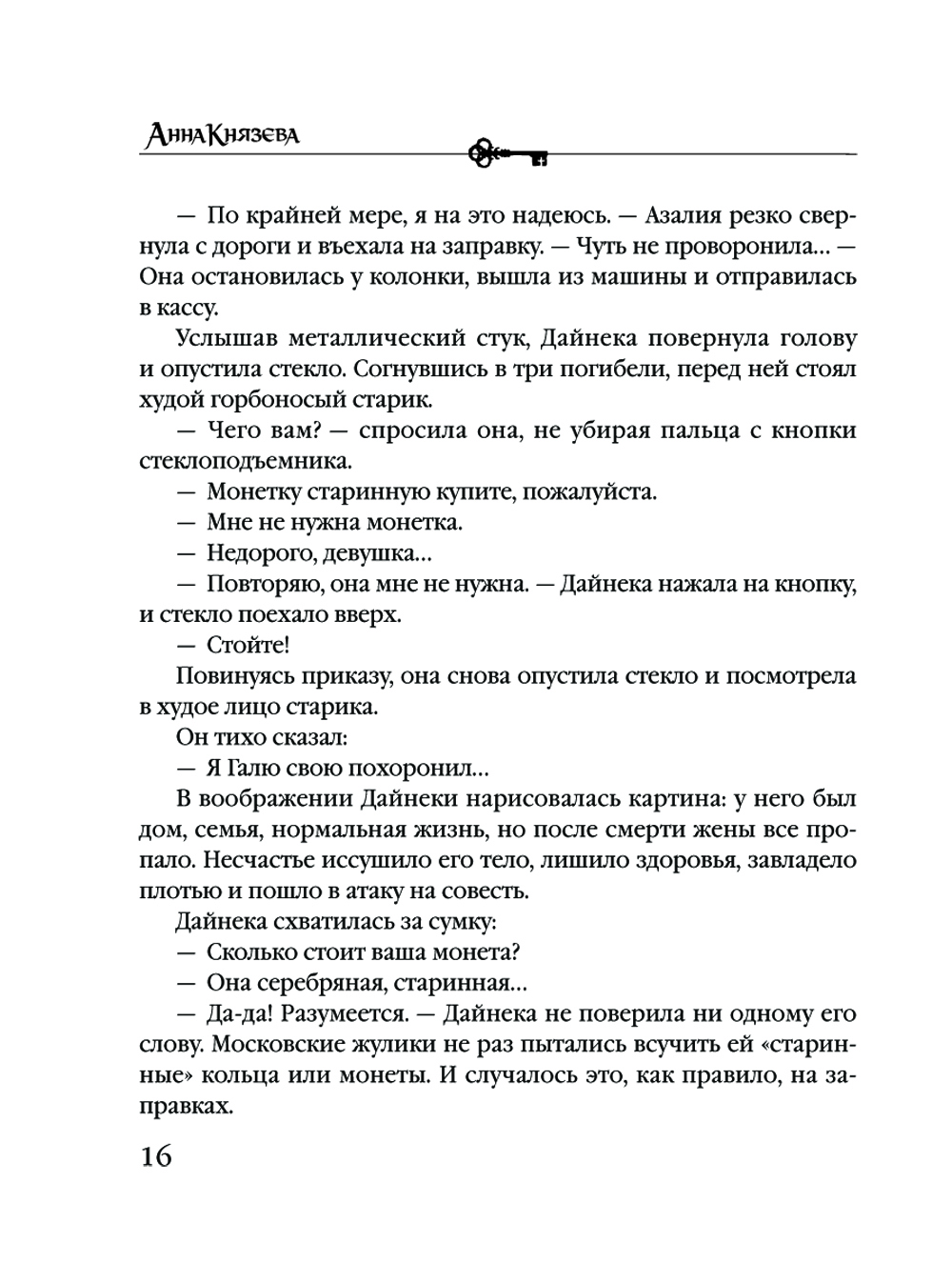 Поддавшись жалости, Дайнека купила у бездомного старика, подошедшего к ее машине на заправке, старую монетку. Ей казалось, что это просто дешевая безделушка, но она решила проверить возникшие подозрения... Эксперты установили, что монета датируется временем правления скифов и поистине бесценна. Пытаясь разобраться в этой таинственной истории, Дайнека решила найти и расспросить о монетке странного старика. Идя по его следу, она зашла в заброшенный, давно расселенный дом, и... пол провалился прямо под ее ногами. Она с ужасом полетела вниз, а очнулась рядом с мертвым телом хозяина удивительного клада...| Издательство | Эксмо |