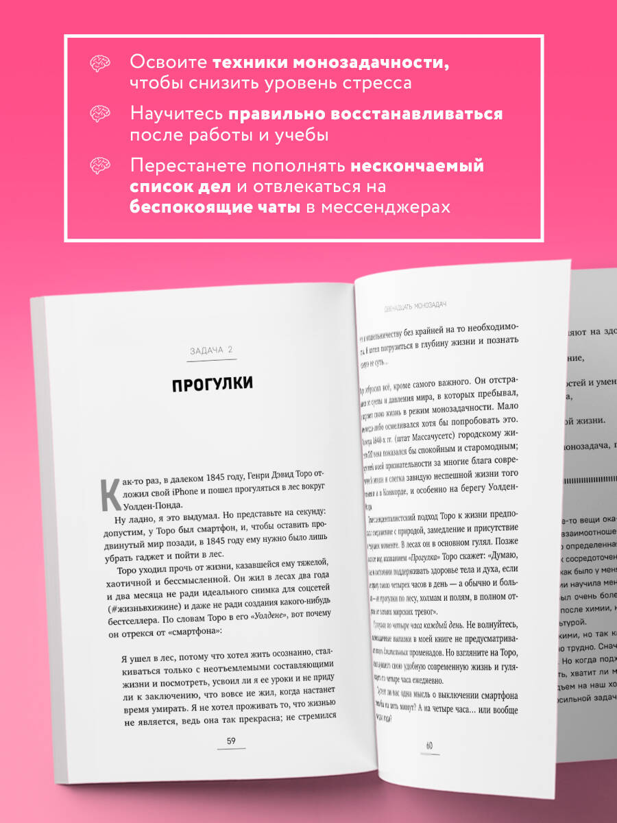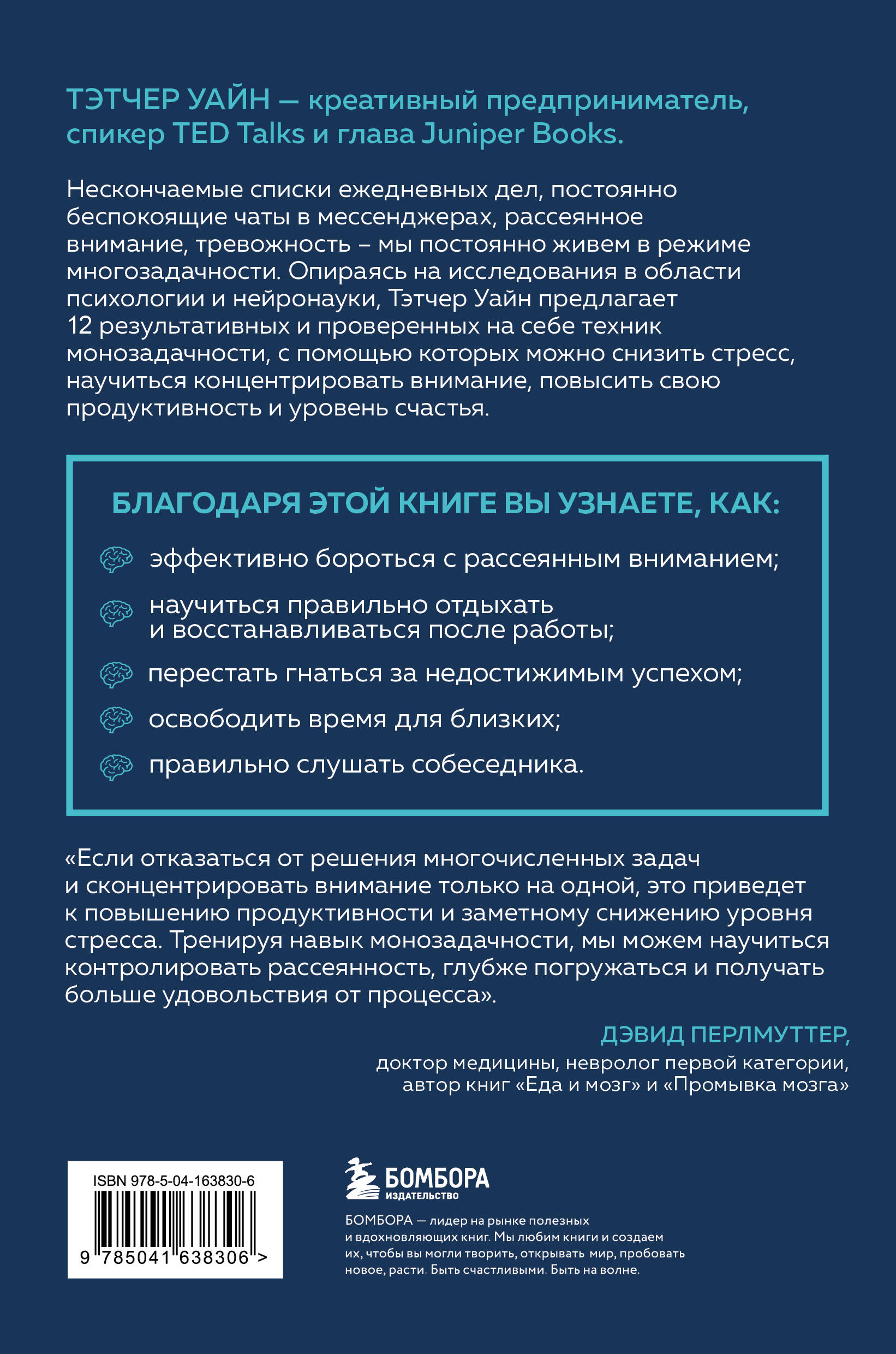 Нескончаемые списки ежедневных дел, постоянно беспокоящие чаты в мессенджерах, рассеянное внимание, тревожность - мы постоянно живем в режиме многозадачности. Опираясь на исследования в области психологии и нейронауки, Тэтчер Уайн предлагает 12 результативных и проверенных на себе техник монозадачности, с помощью которых можно снизить стресс, научиться концентрировать внимание, повысить свою продуктивность и уровень счастья. БЛАГОДАРЯ ЭТОЙ КНИГЕ ВЫ УЗНАЕТЕ, КАК: - эффективно бороться с рассеянным вниманием; - научиться правильно отдыхать и восстанавливаться после работы; - перестать гнаться за недостижимым успехом; - освободить время для близких; - правильно слушать собеседника. Об авторе Тэтчер Уайн - креативный предприниматель, спикер TED Talks и глава Juniper Books.| Издательство | ООО "Издательство "Эксмо" |