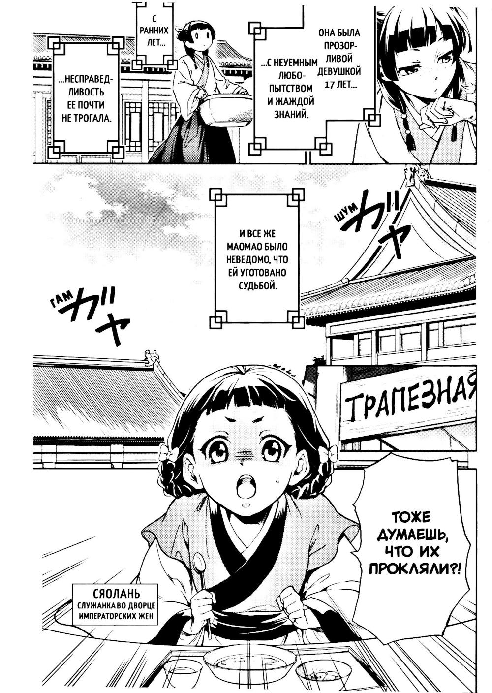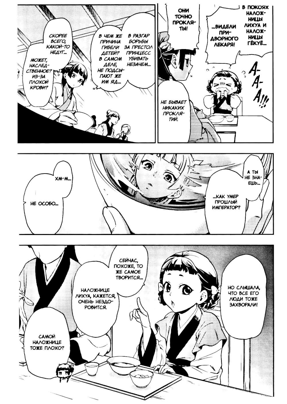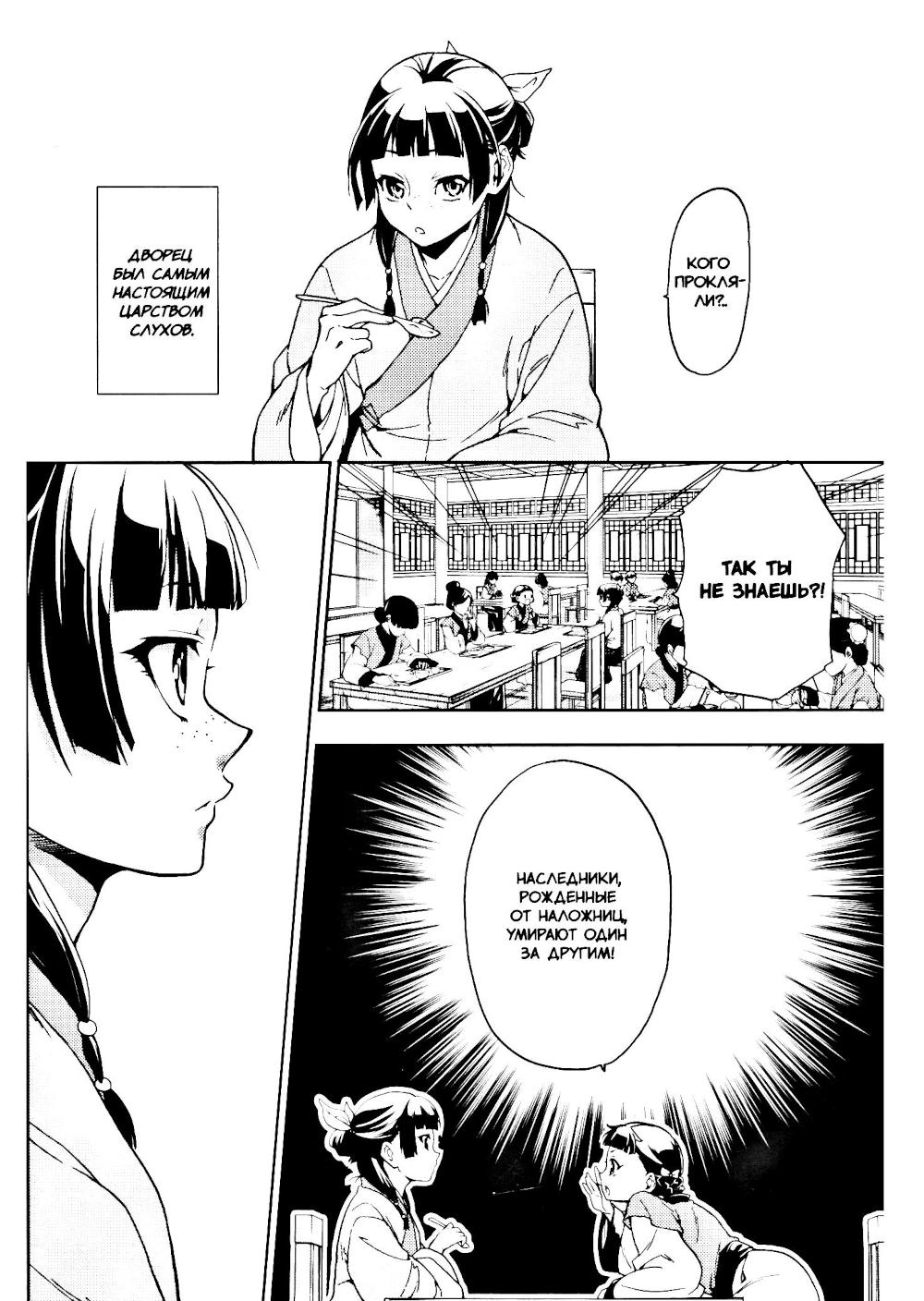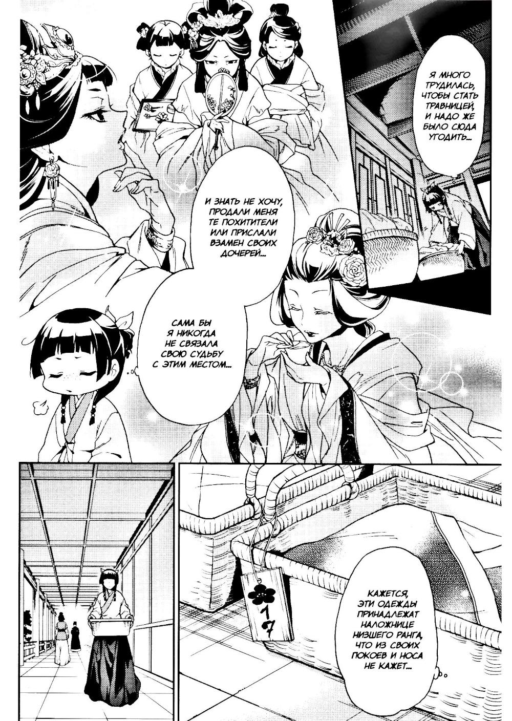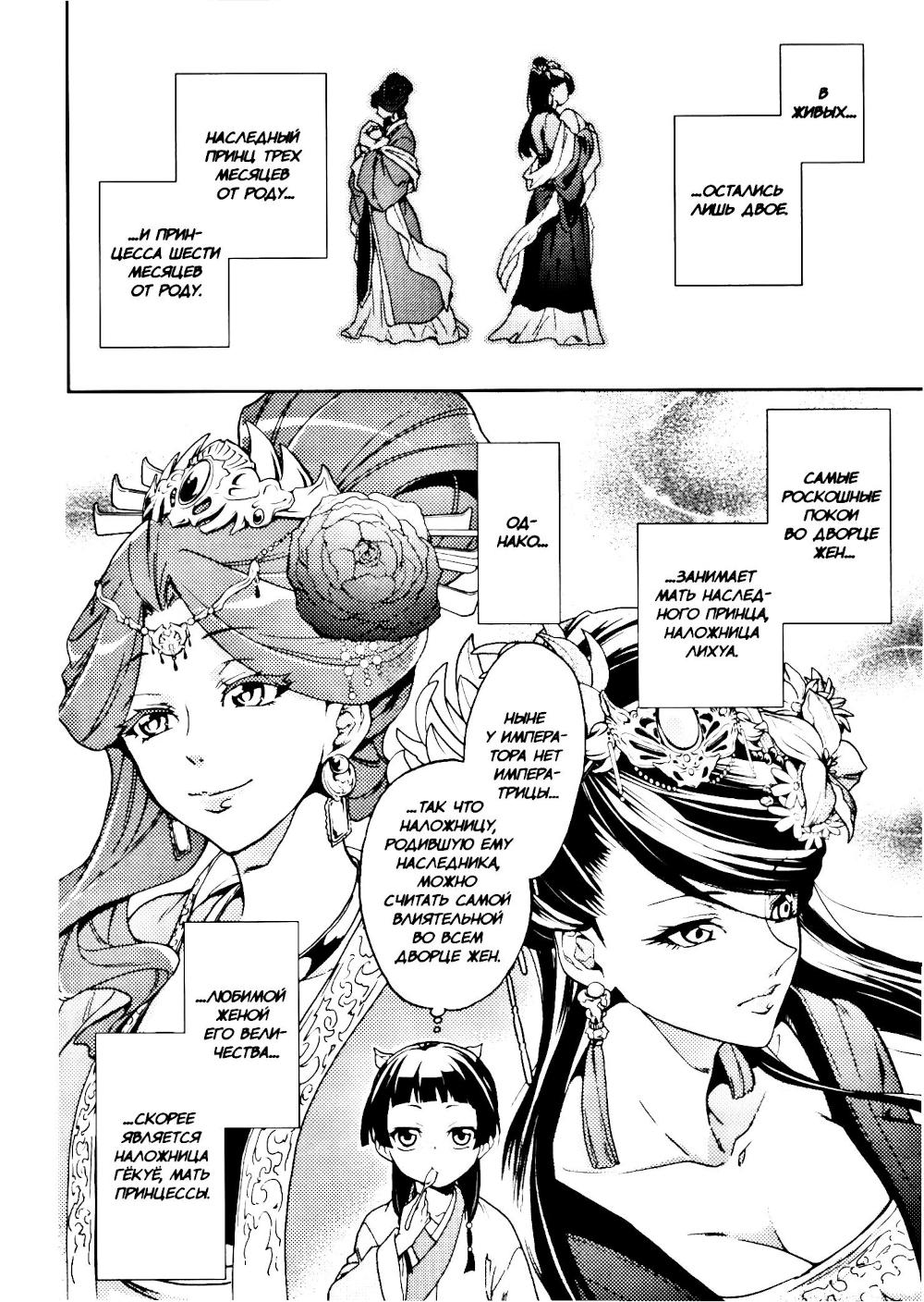 Юная травница Маомао ведет жизнь тихую и бедную, пока в один день ее не похищают, дабы продать во дворец императорских жен. Став дворовой прислугой, она мучительно выжидает, когда ее отпустят со службы. Однако, к своему несчастью, она замечает, что новорожденные дети наложниц погибают далеко не случайно. Неужели чей-то заговор? Или государственная измена? И Маомао против воли оказывается втянута в хитросплетенную сеть дворцовых интриг.| Издательство | ЭксЭл Медиа |