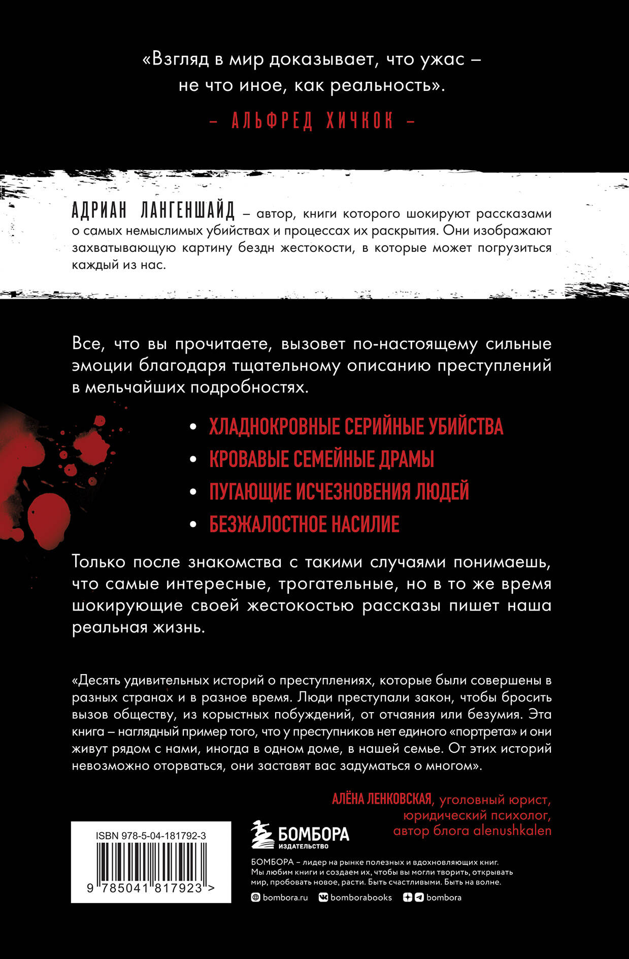 Настоящая жемчужина творчества Адриана Лангеншайда, собравшая в себе 10 его самых невероятных и ярких историй, основанных на реальных уголовных делах. Книга, читая которую, понимаешь, что самые интересные, трогательные, но в то же время шокирующие своей жестокостью рассказы пишет реальная жизнь. Вы подвергнете сомнению все, что, как вам кажется, знаете о человеческой природе! В этой книге вы найдете: - описания преступлений в мельчайших подробностях; - шокирующие истории серийных маньяков, врачей-убийц и религиозных фанатиков, совершающих страшные грехи; - факты и доказательства, отчеты с судебных заседаний, психологические портреты и допросы; - комментарии о тонкостях уголовного права, криминалистики, криминологии от уголовного юриста, юридического психолога и автора популярного блога @alenushkalen АЛЁНЫ ЛЕНКОВСКОЙ| Издательство | ООО "Издательство "Эксмо" |