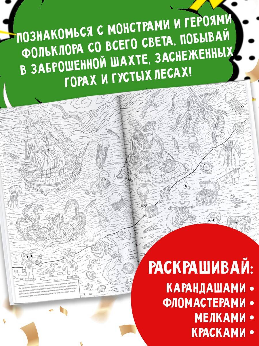 Это не просто виммельбух-раскраска,это - весёлое и увлекательное приключение для детей и взрослых. Вместе с искателями приключений познакомьтесь с монстрами и героями фольклора со всего света. Заброшенная шахта, морские просторы, заснеженные горы и густые леса - кто же прячется там в темноте? В этой раскраске тебя ждёт: - 9 интересных локаций; - Задания на каждом развороте; - Забавные персонажи, которые готовы рассказать свои истории. Приготовь фломастеры, карандаши и краски и вперёд, к приключениям!| Издательство | Издательство "АСТ" |