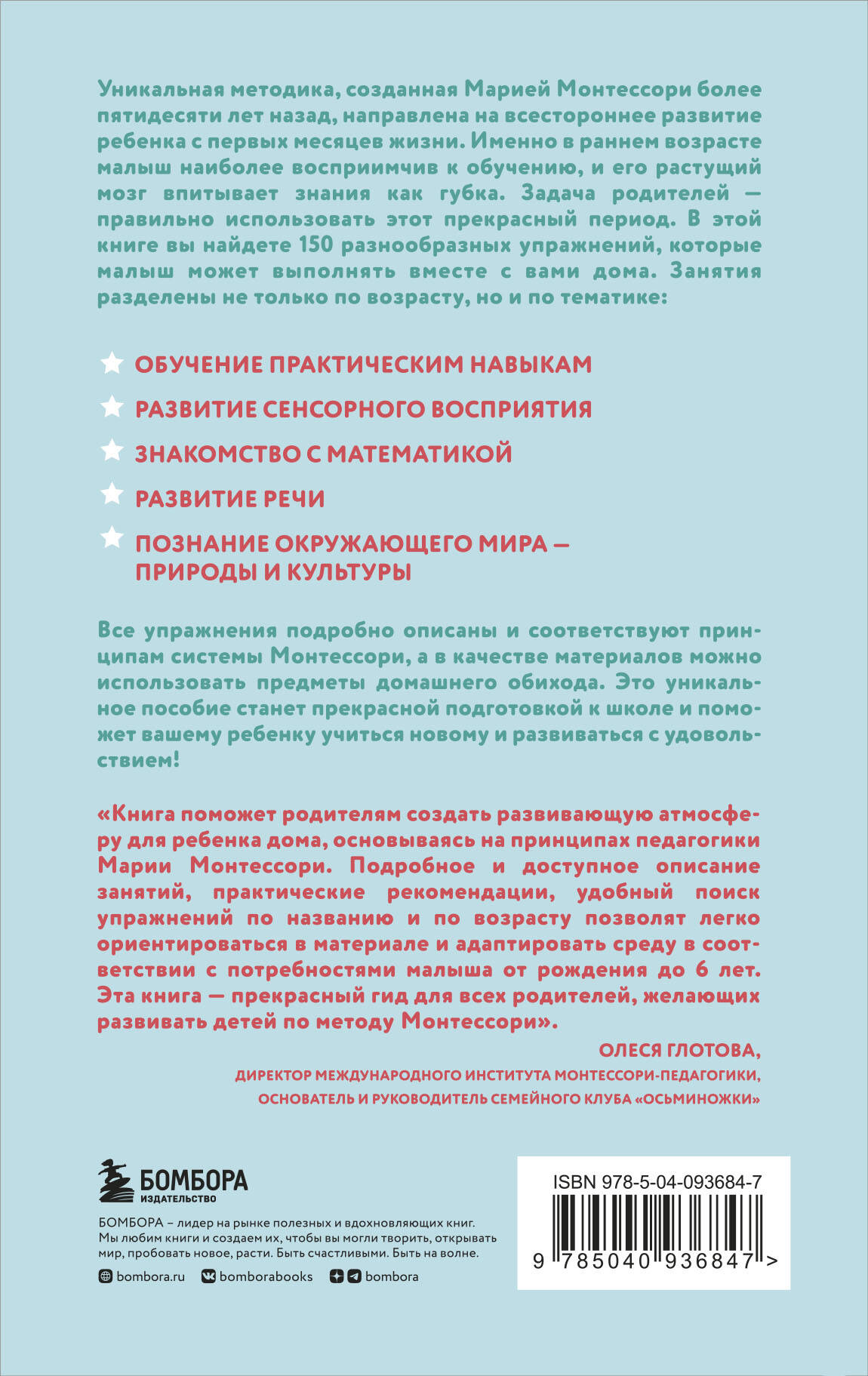 Уникальная методика, созданная Марией Монтессори более пятидесяти лет назад, направлена на всестороннее развитие ребенка с первых месяцев жизни. Именно в раннем возрасте малыш наиболее восприимчив к обучению, и его растущий мозг впитывает знания как губка. Задача родителей - правильно использовать этот прекрасный период. В этой книге вы найдете 150 разнообразных упражнений, которые малыш может выполнять вместе с вами дома. Занятия разделены не только по возрасту, но и по тематике: обучение практическим навыкам, развитие сенсорного восприятия, знакомство с математикой, развитие речи и познание окружающего мира. Все упражнения подробно описаны и соответствуют принципам системы Монтессори, а в качестве материалов можно использовать предметы домашнего обихода. Это уникальное пособие поможет вашему ребенку учиться новому и развиваться с удовольствием!| Издательство | Форс Украина ООО |