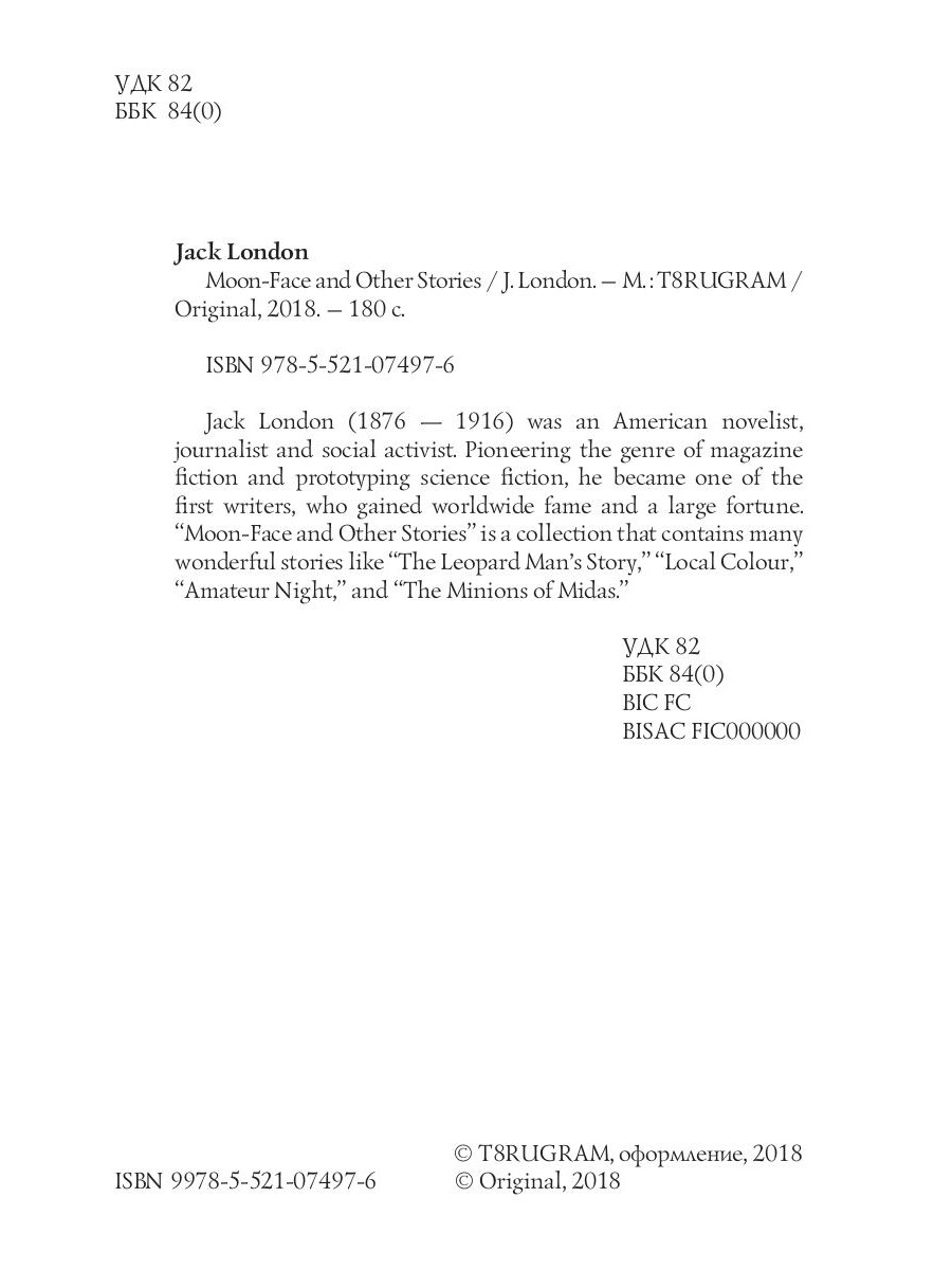 Jack London (1876 - 1916) was an American novelist, journalist and social activist. Pioneering the genre of magazine fiction and prototyping science fiction, he became one of the first writers, who gained worldwide fame and a large fortune. "Moon-Face'and Other Stories" is a collection that contains many wonderful stories like "The Leopard Man's Story", "Local Colour", "Amateur Night", and "The Minions of Midas".