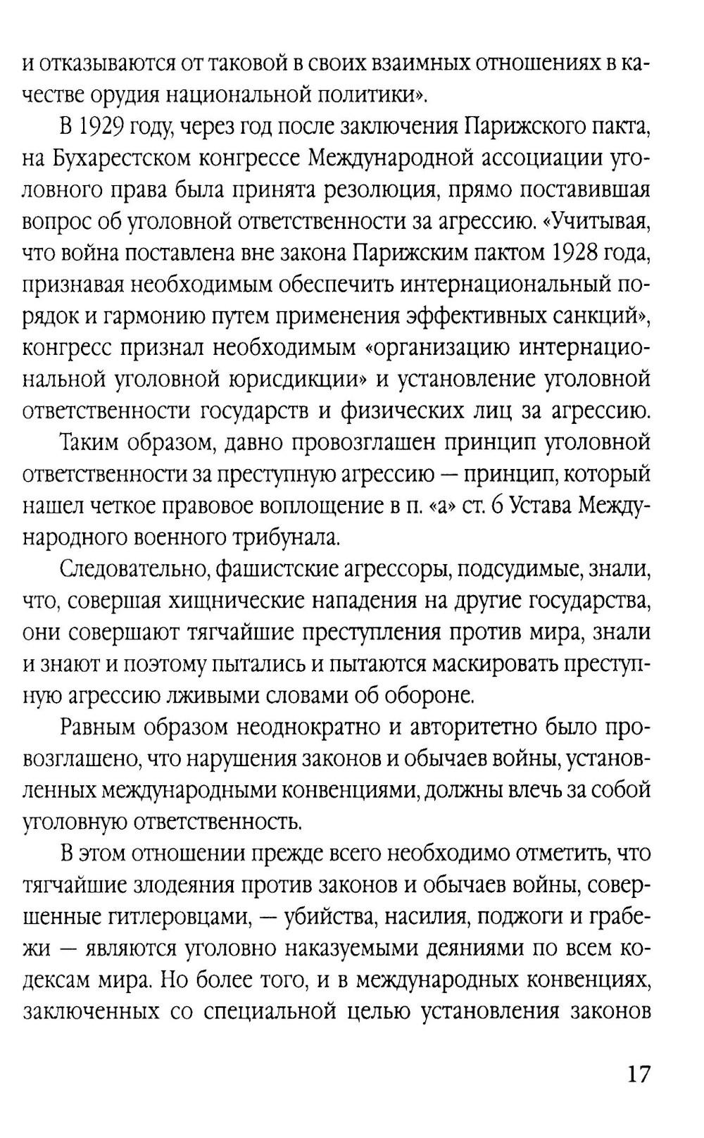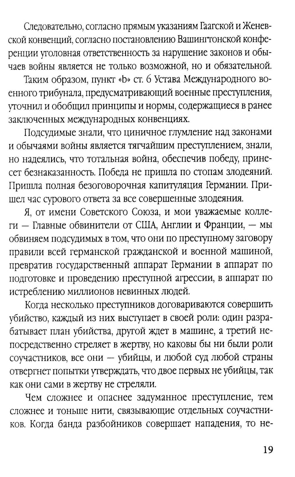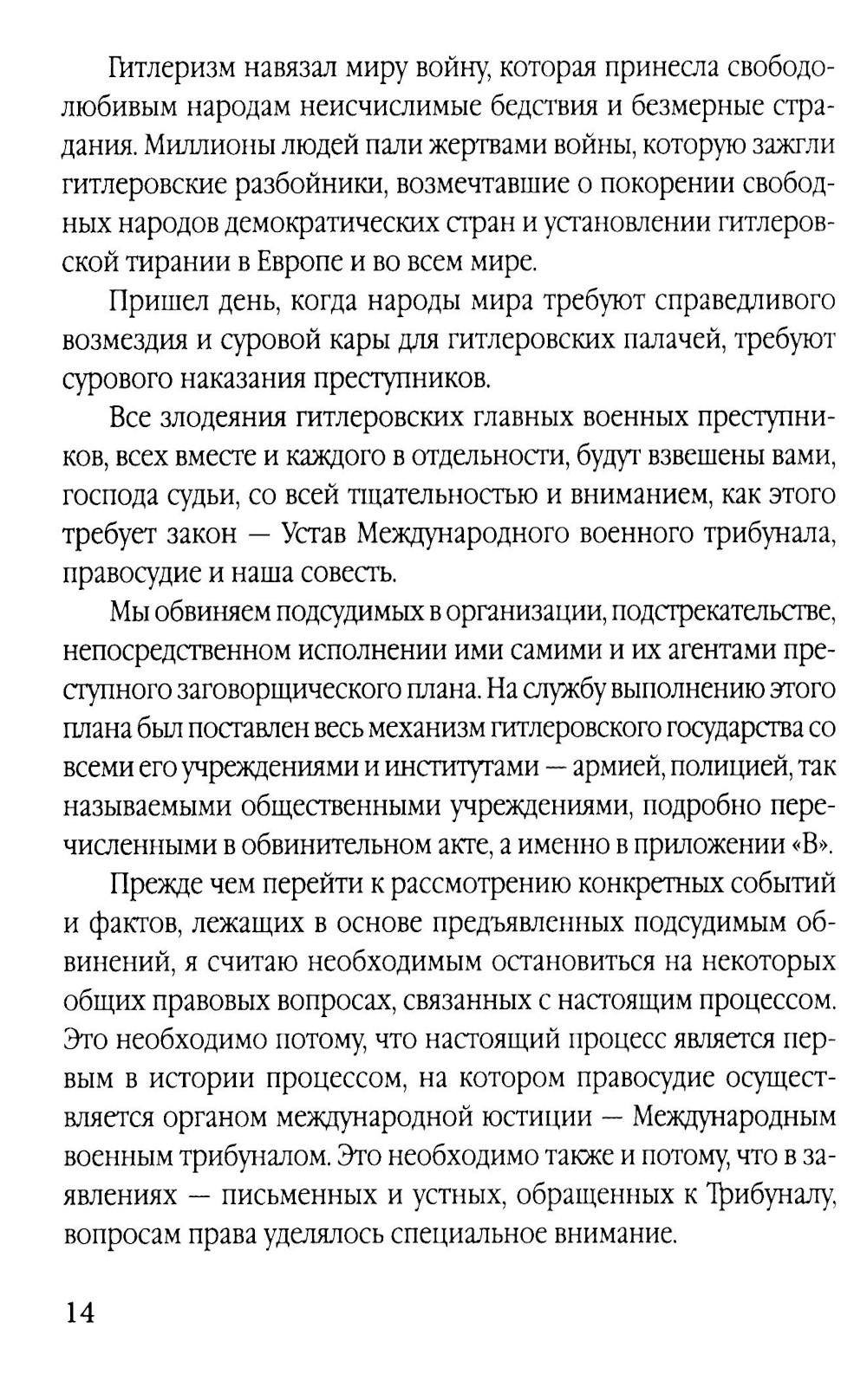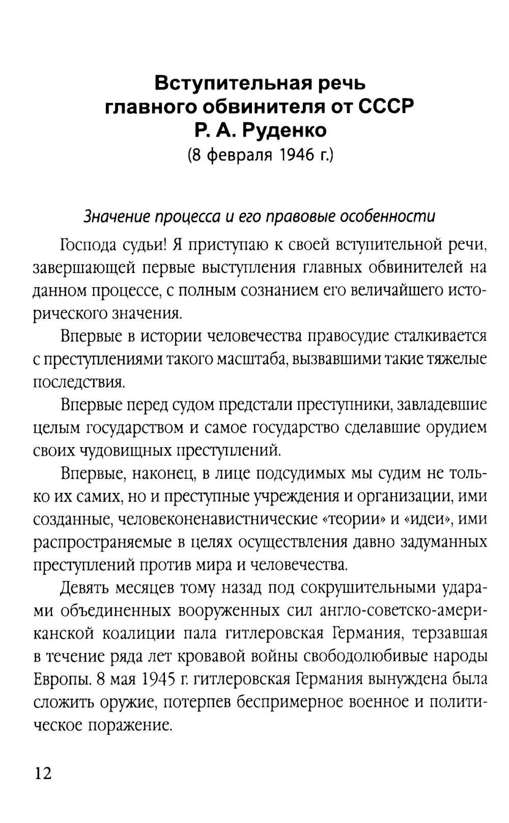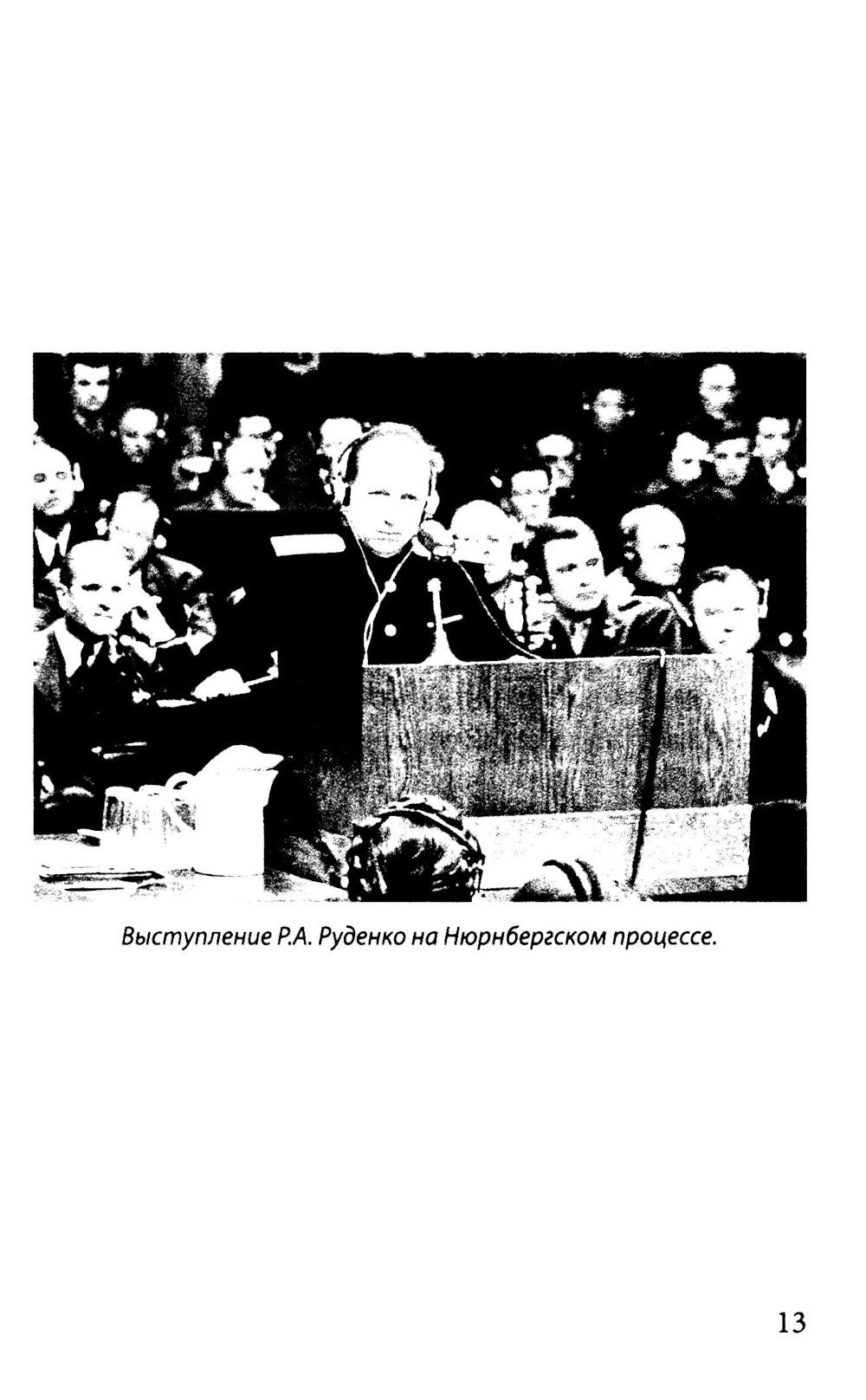 С 20 ноября 1945 г. по 1 октября 1946 г. в Нюрнберге проходил процесс по делу гитлеровских военных преступников. Главным обвинителем от СССР выступил Р. А. Руденко, который, в частности, говорил: «Когда банда оказывается в центре государственного аппарата, когда банда совершает тягчайшие международные преступления, когда цветущие области превращались в зоны пустыни, - это было дело их рук, их подстрекательства, их руководства. Подсудимые годами отравляли совесть и разум целого поколения немцев, воспитывая в них мораль людоедов и алчность грабителей». В своих речах он показал, как действовал фашистский государственный аппарат, включая правительственные, военные, пропагандистские структуры, особое внимание уделив нападению гитлеровской Германии на СССР. Р. А. Руденко убедительно доказал, что это не был «превентивный удар», как утверждал Гитлер, но прямая агрессия, направленная на захват чужих территорий.| Издательство | Родина |