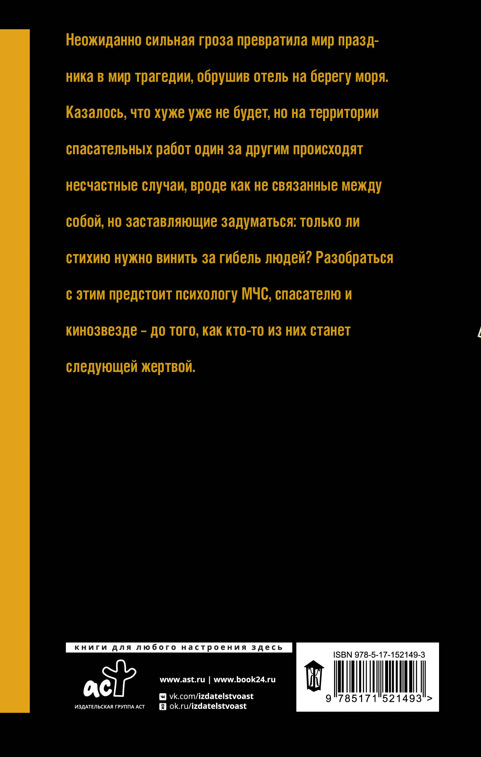 Неожиданно сильная гроза превратила мир праздника в мир трагедии, обрушив отель на берегу моря. Казалось, что хуже уже не будет, но на территории спасательных работ один за другим происходят несчастные случаи, вроде как не связанные между собой, но заставляющие задуматься: только ли стихию нужно винить за гибель людей? Разобраться с этим предстоит психологу МЧС, спасателю и кинозвезде - до того, как кто-то из них станет следующей жертвой.| Издательство | ИЗДАТЕЛЬСТВО "АСТ" |