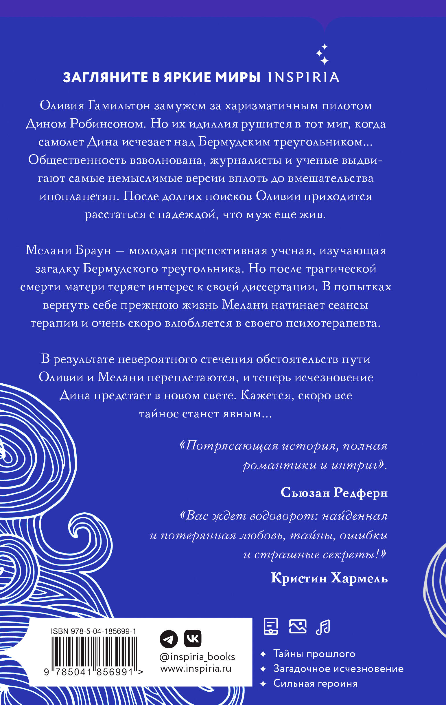 Оливия Гамильтон замужем за харизматичным пилотом Дином Робинсоном. Но их идиллия рушится в тот миг, когда самолет Дина исчезает над Бермудским треугольником… Общественность взволнована, журналисты и ученые выдвигают самые немыслимые версии вплоть до вмешательства инопланетян. После долгих поисков Оливии приходится расстаться с надеждой, что муж еще жив. Мелани Браун - молодая перспективная ученая, изучающая загадку Бермудского треугольника. Но после трагический смерти матери теряет интерес к своей диссертации. В попытках вернуть себе прежнюю жизнь, Мелани начинает сеансы терапии и очень скоро влюбляется в своего психотерапевта. В результате невероятного стечения обстоятельств пути Оливии и Мелани переплетаются, и теперь исчезновение Дина предстает в новом свете. Кажется, скоро все тайное станет явным... Трогательный и внушающий надежду роман о поиске ответов, искуплении и всепоглощающей любви - от финалистки RITA, самой значимой премии за вклад в романтическую прозу. «В этом романе блестяще переплетаются мифы и наука, и в итоге получается потрясающая история, полная романтики и интриг. Джулианна Маклин - мастер своего дела, и эта захватывающая книга, возможно, ее лучшая работа». - Сьюзан Редферн, автор бестселлеров по версии Amazon «Бермудский треугольник - идеальный сеттинг для "Моря лунного света". Вас ждет водоворот: найденная и потерянная любовь, тайны, ошибки и страшные секреты!» - Джессика Страузер, автор романов «Джулианна Маклин превзошла саму себя! В этой захватывающей дух саге о любви, потере и искуплении ничего не подозревающая жена пытается разгадать тайну исчезновения своего мужа и обнаруживает, что самая необъяснимая сила природы - это сила непреходящей любви». - Памела Кэллоу, автор бестселлеров| Издательство | ООО "Издательство "Эксмо" |