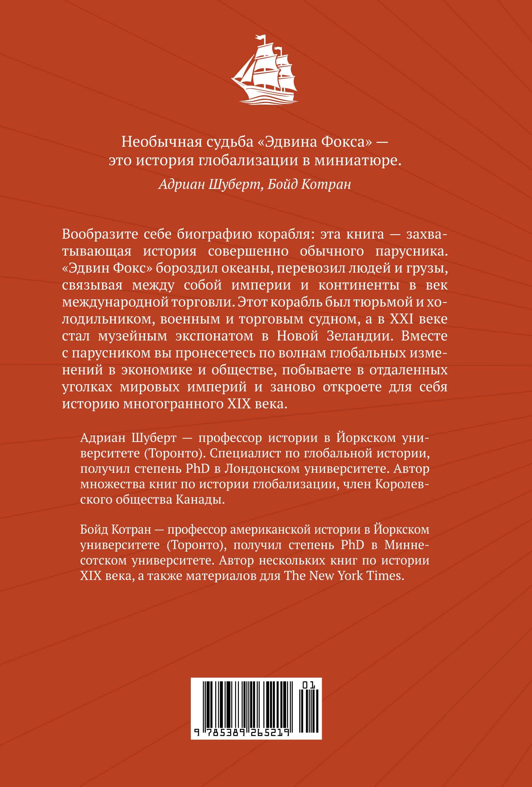 XIX век - время расширения империй, кровавой освободительной борьбы в колониях, глобализации и стремительного роста международной торговли. Что общего у столь масштабных событий и непримечательного парусника? В 1853 году в Калькутте был построен совершенно обычный корабль, которому было суждено войти в историю. "Эдвин Фокс" перевозил солдат, участвовавших в Крымской войне, наемных рабочих из Китая на Кубу, преступников со всей Британской империи в Австралию и даже замороженную баранину из Новой Зеландии в Англию. Парусник объединил судьбы людей разных национальностей, вероисповедования и цвета кожи. За полвека "Эдвин Фокс" совершил множество удивительных плаваний от Норвегии до Юго-Восточной Азии и стал символом глобализации. В ХХ веке захватывающие приключения корабля остались в прошлом, оборудование пришло в негодность, судно пестрело пробоинами. "Эдвин Фокс" стал угольным складом, его бросили гнить у причала. Теперь он обосновался в музее в Новой Зеландии и известен как старейший из сохранившихся торговых кораблей. Наблюдая с палубы морского судна за быстро менявшимся миром, вы совершите захватывающее путешествие по XIX столетию. "Начиная с многообещающего спуска на воду на верфи Томаса Ривза в Калькутте и заканчивая унизительной и совершенно неподобающей судьбой в гавани Пиктон 50 лет спустя, начиная с капитанов и экипажей и заканчивая грузами товаров, кули и заключенных, а также поселенцами, которых он перевозил, "Эдвин Фокс" сыграл главную роль в объединении мира в первую настоящую эпоху глобализации" (Адриан Шуберт, Бойд Котран).