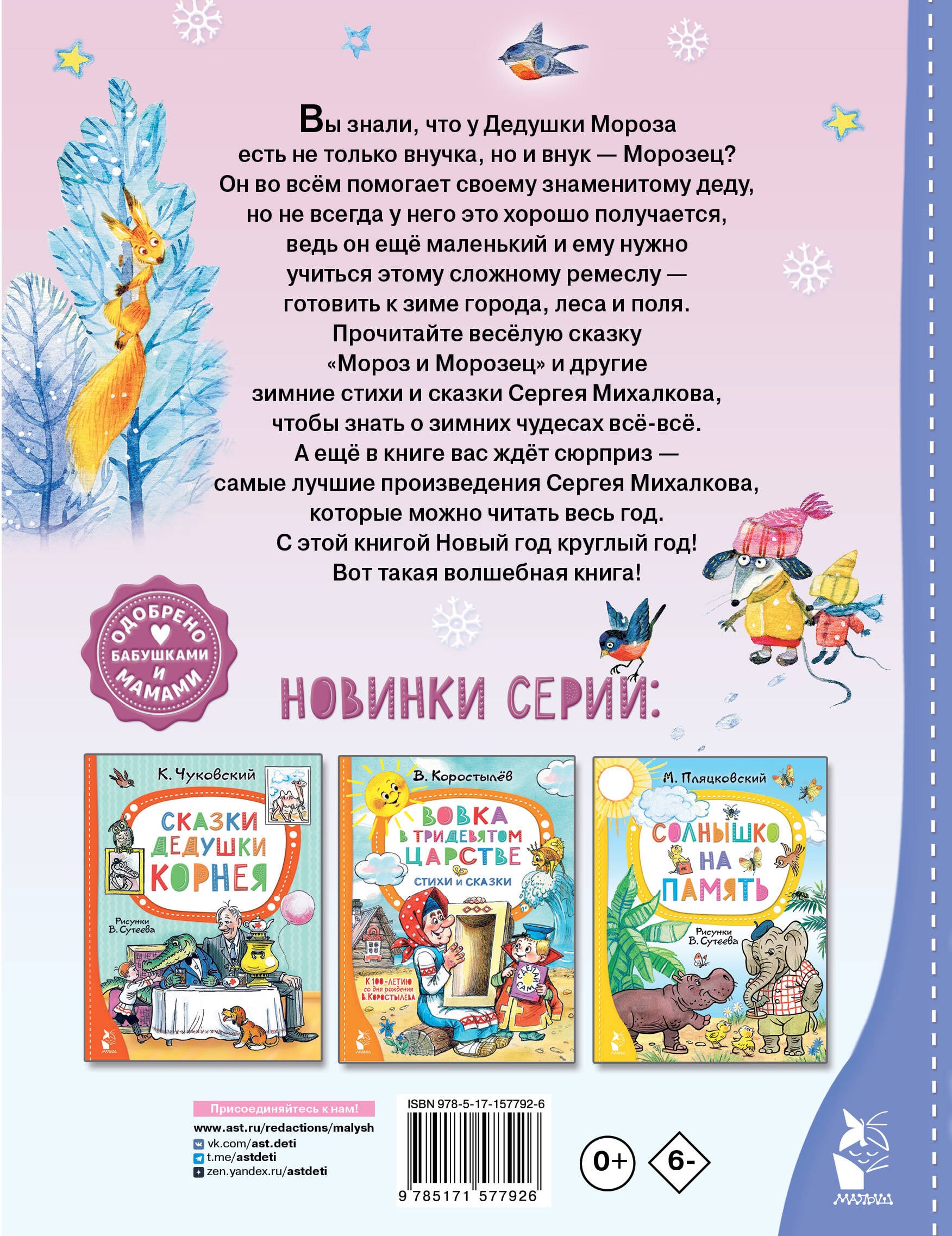 Вы знали, что у Дедушки Мороза есть не только внучка, но и внук - Морозец? Он во всём помогает своему знаменитому деду, но не всегда у него это хорошо получается, ведь он ещё маленький и ему нужно учиться этому сложному ремеслу - готовить к зиме города, леса и поля. Прочитайте весёлую сказку «Мороз и Морозец» и другие зимние стихи и сказки Сергея Михалкова, чтобы знать о зимних чудесах всё-всё. А ещё в книге вас ждёт сюрприз - самые лучшие произведения Сергея Михалкова, которые можно читать весь год. С этой книгой Новый год круглый год! Вот такая волшебная книга!| Издательство | ИЗДАТЕЛЬСТВО "АСТ" |