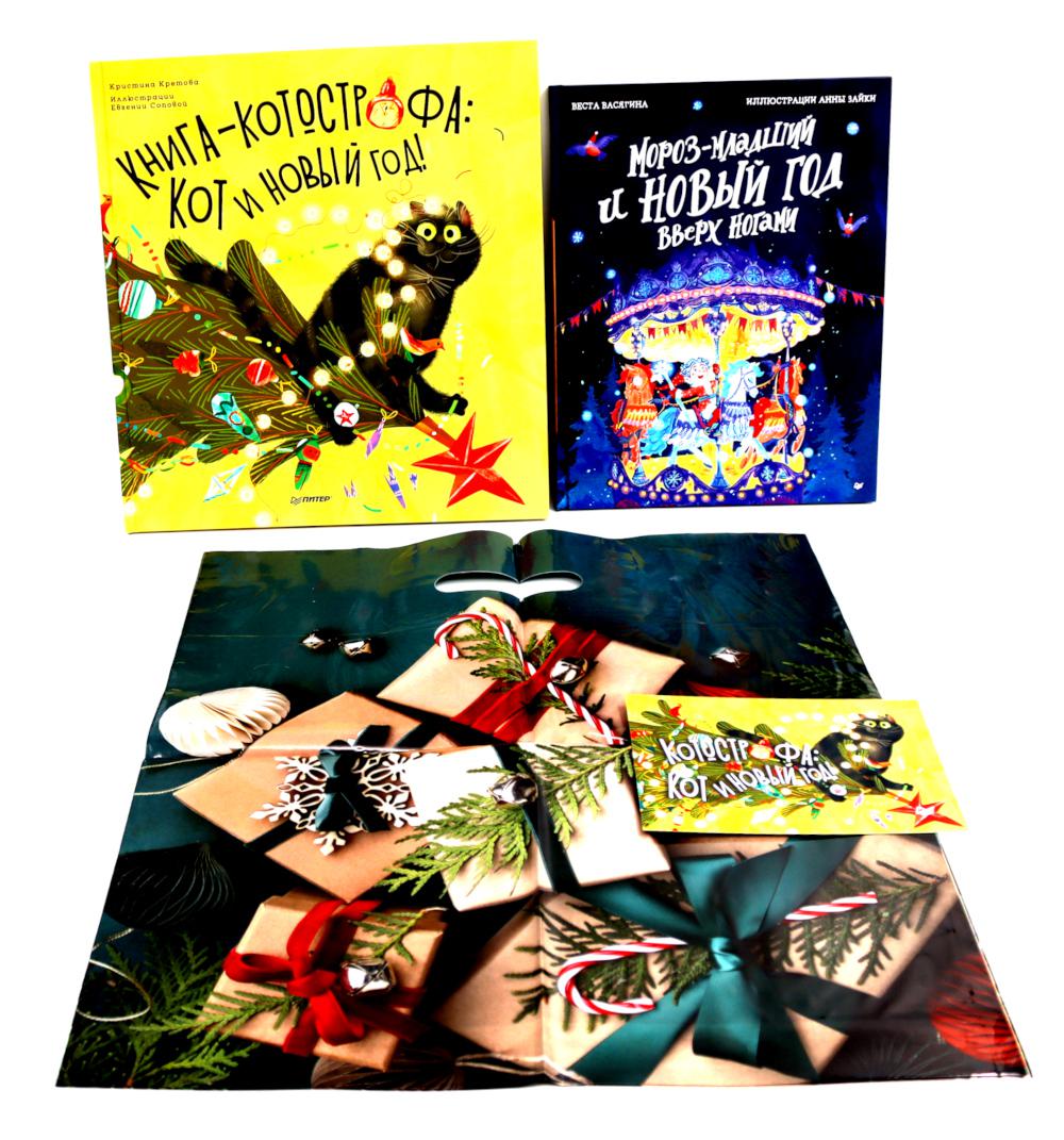 Комплект содержит книги: «Мороз-младший и Новый год вверх ногами» В. Васягина Первоклассник Мороз-младший - не самый послушный мальчик, хоть и потомственный зимний волшебник. У него, как у каждого ребёнка, есть мечта. Ему хочется хотя бы одну ночь побыть Дедом Морозом! Впереди его ждёт путешествие по зимнему лесу, полёт на огромном вороне, знакомство с чудесным городком Тишь-да-Гладь и его жителями. Но, оказывается, творить волшебство на благо других не так-то просто! Удастся ли Морозу-младшему исполнить детские желания? И при этом не перевернуть городок вверх ногами? Весёлая история об ответственности, добрых поступках и, конечно же, новогоднем чуде. Книга-котострофа: «Кот и Новый год!» К. Кретова Кто в доме хозяин? «Конечно же, кот!» - уверен кот Василий, живущий в Петербурге с хозяйкой Настей и ее дочкой Полиной. Но привычный уклад нарушается, когда в квартиру переезжает Александр. Тогда Василий решает любыми способами восстановить свои права! Удастся ли семье справиться с надвигающейся КОТтострофой и встретить Новый год вместе? В этой веселой новогодней истории есть все - юмор, праздничная атмосфера, красивые елочные игрушки и интересные факты о них. А еще, конечно же, любовь и немного волшебства! Книга предназначена для чтения взрослыми детям.| Издательство | Питер |