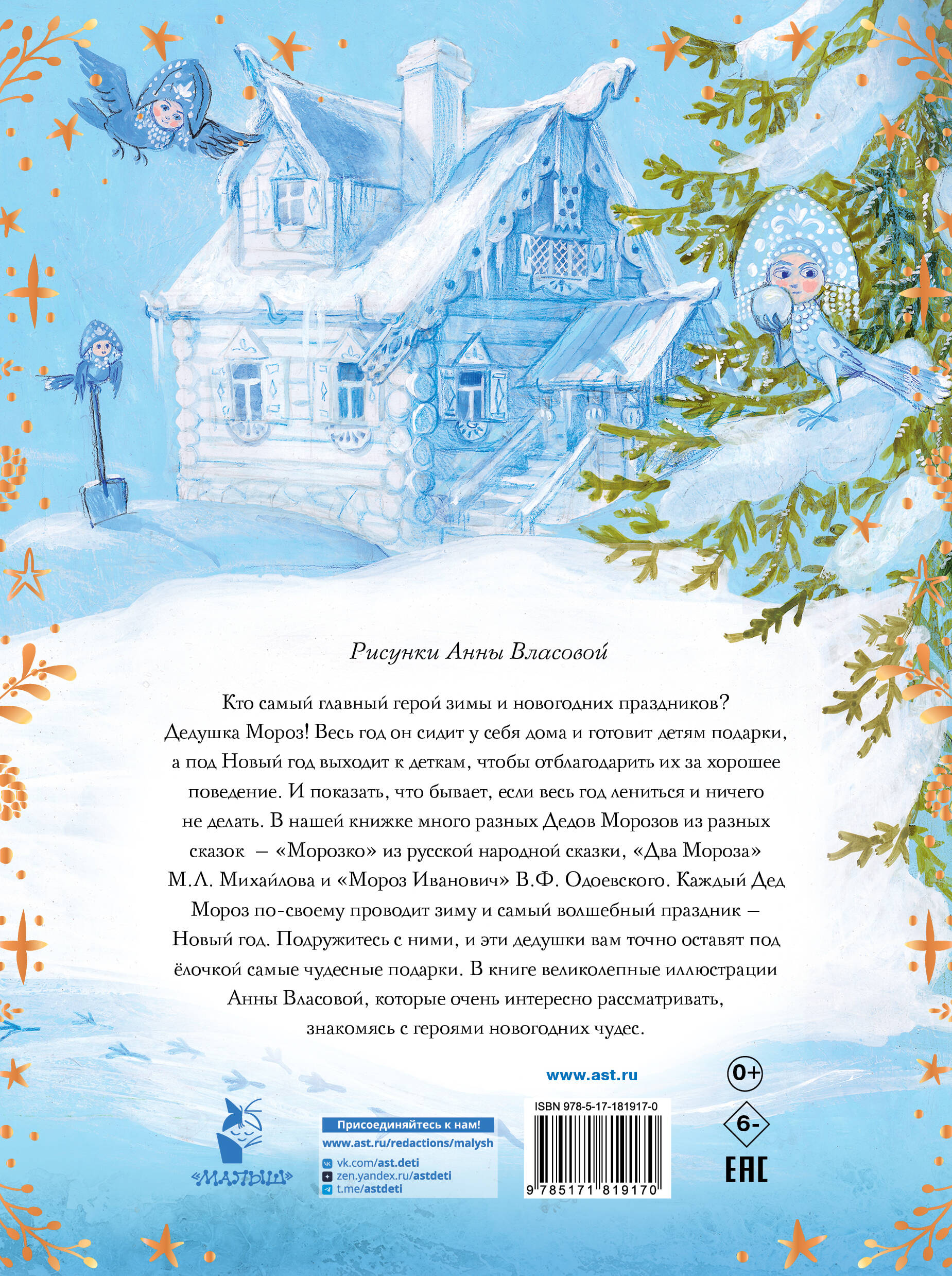 Кто самый главный герой зимы и новогодних праздников? Дедушка Мороз! Весь год он сидит у себя дома и готовит детям подарки, а под Новый год выходит к деткам, чтобы отблагодарить их за хорошее поведение. И показать, что бывает, если весь год лениться и ничего не делать. В нашей книжке много разных Дедов Морозов из разных сказок - «Морозко» из русской народной сказки, «Два Мороза» М.Л. Михайлова и «Мороз Иванович» В.Ф. Одоевского. Каждый Дед Мороз по-своему проводит зиму и самый волшебный праздник - Новый год. Подружитесь с ними, и эти дедушки вам точно оставят под ёлочкой самые чудесные подарки. В книге великолепные иллюстрации Анны Власовой, которые очень интересно рассматривать, знакомясь с героями новогодних чудес.| Издательство | Издательство "АСТ" |