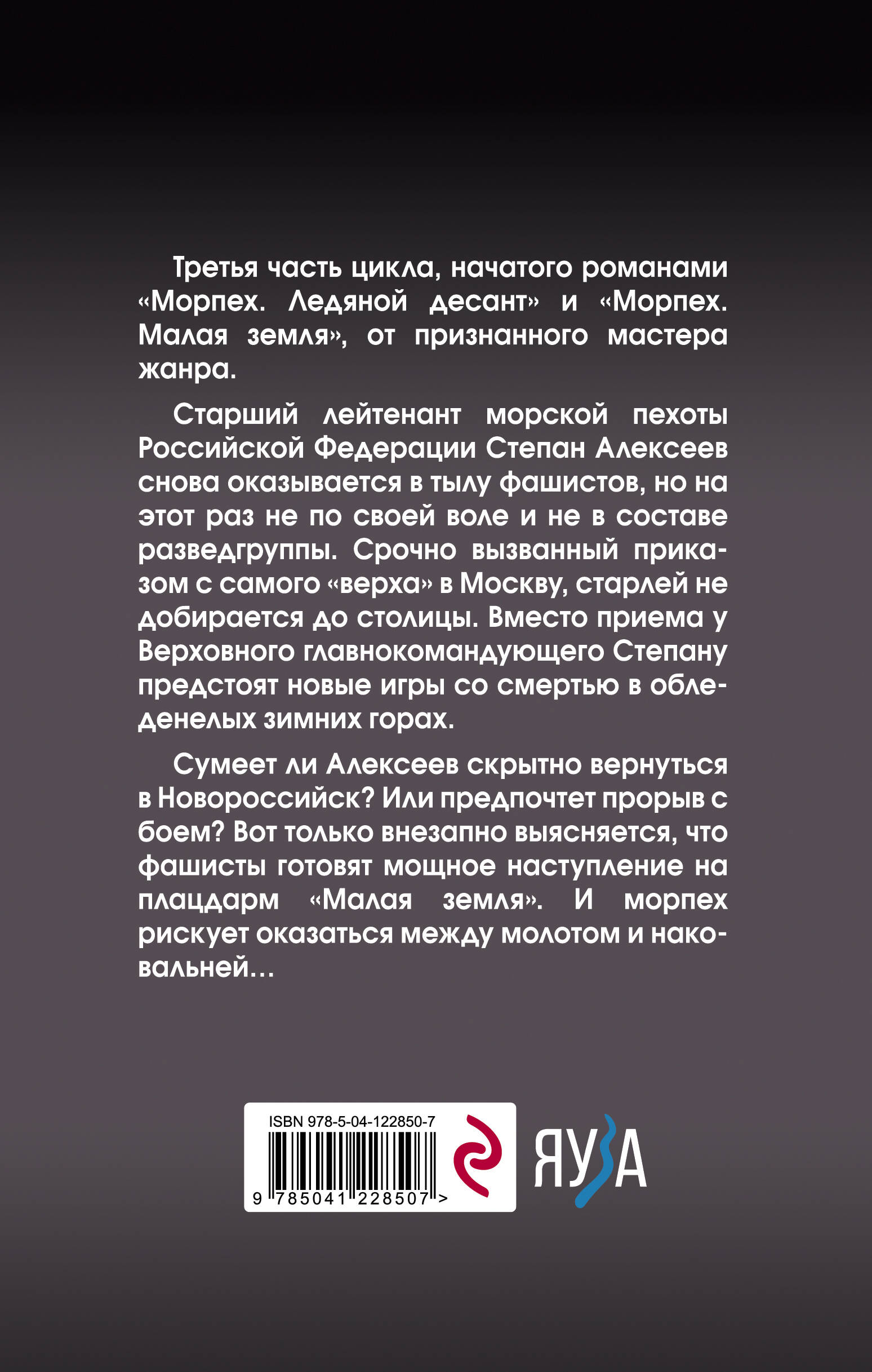 Третья часть цикла, начатого романами «Морпех. Ледяной десант» и «Морпех. Малая земля» от признанного мастера жанра. Старший лейтенант морской пехоты Российской Федерации Степан Алексеев снова оказывается в тылу фашистов, но в этот раз не по своей воле и не в составе разведгруппы. Срочно вызванный приказом с самого «верха» в Москву, старлей не добирается до столицы. Вместо приема у Верховного главнокомандующего Степану предстоят новые игры со смертью в обледенелых зимних горах. Сумеет ли Алексеев скрытно вернуться в Новороссийск? Или предпочтет прорыв с боем? Вот только внезапно выясняется, что фашисты готовят мощное наступление на плацдарм «Малая земля». И морпех рискует оказаться между молотом и наковальней…| Издательство | ООО "Издательство "Эксмо" |