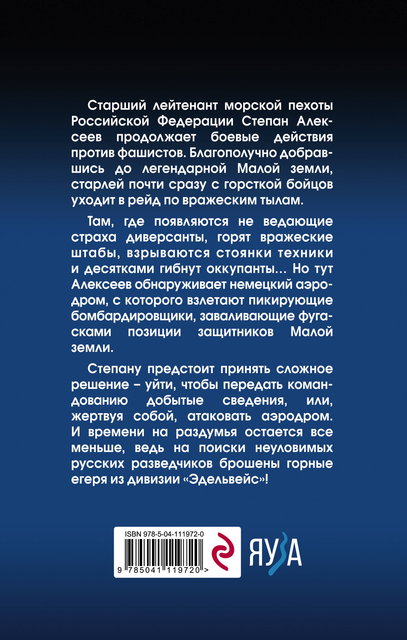 Старший лейтенант морской пехоты Российской Федерации Степан Алексеев продолжает боевые действия против фашистов. Благополучно добравшись до легендарной «Малой земли», старлей почти сразу с горсткой бойцов уходит в рейд по вражеским тылам. Там, где появляются не ведающие страха диверсанты, горят вражеские штабы, взрываются стоянки техники и десятками гибнут оккупанты… Но тут Алексеев обнаруживает немецкий аэродром, с которого взлетают пикирующие бомбардировщики, заваливающие фугасками позиции защитников «Малой земли». Степану предстоит принять сложное решение - уйти, чтобы передать командованию добытые сведения или, жертвуя собой, атаковать аэродром. И времени на раздумья остается все меньше, ведь на поиски неуловимых русских разведчиков брошены горные егеря из дивизии «Эдельвейс»! Продолжение увлекательного цикла от признанного мастера жанра альтернативной истории! Офицер морской пехоты Российской Федерации обороняет плацдарм «Малая земля»!| Издательство | ООО "Издательство "Эксмо" |