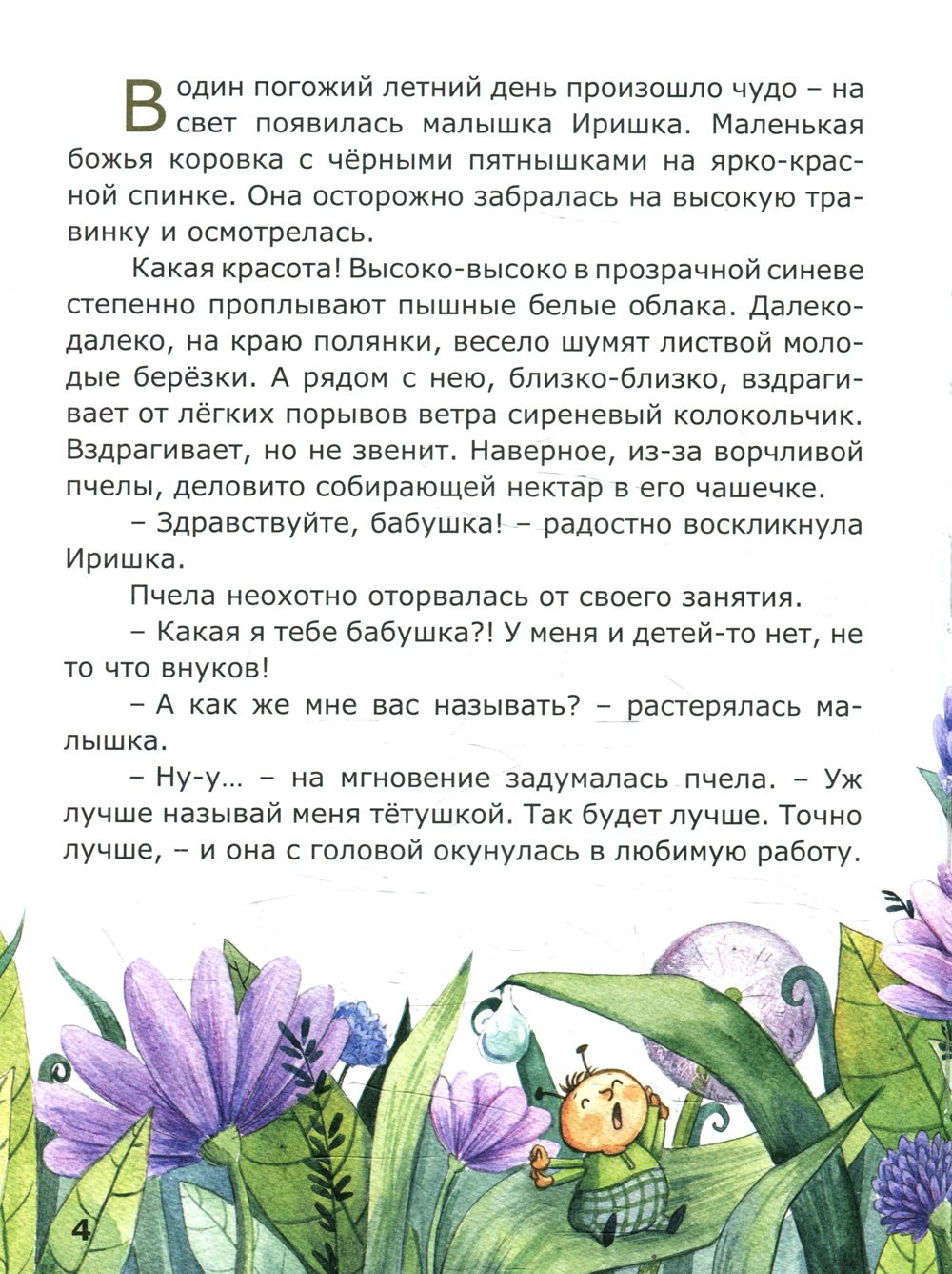 Так не бывает! - скажете вы и будете правы. Не бывает морских приключений на лесных полянках. Зато бывают приключения по дороге к морю. И они не менее увлекательные! Тем более что дорога проходит по очень красивой полянке. А на ней маленькая божья коровка встретит и верных друзей, и добрых помощников, и недружелюбных обитателей тех мест. Её ждут удивительные открытия и опасные приключения. Но малышка Иришка ничего не боится, потому что у неё есть тётушка Пчела. И она ей обязательно поможет! Скажете, так не бывает? В сказках всё бывает! Так что усаживайтесь поудобнее и отправляйтесь в сказочное путешествие вместе с божьей коровкой Иришкой и её друзьями!| Издательство | РуДа |