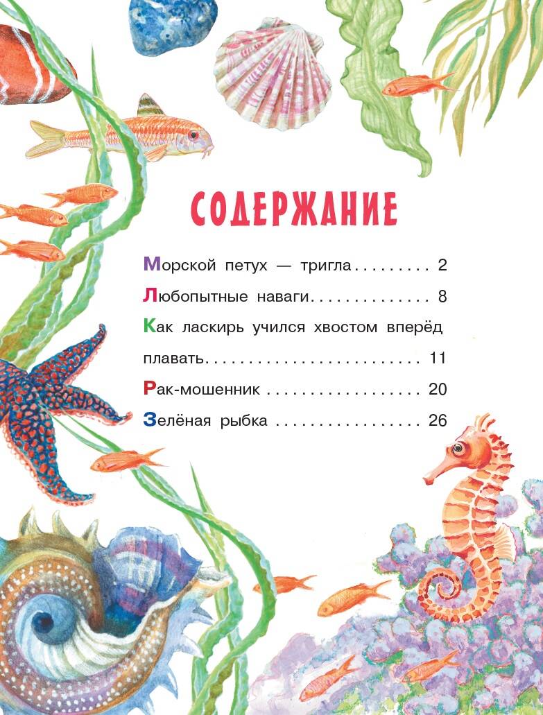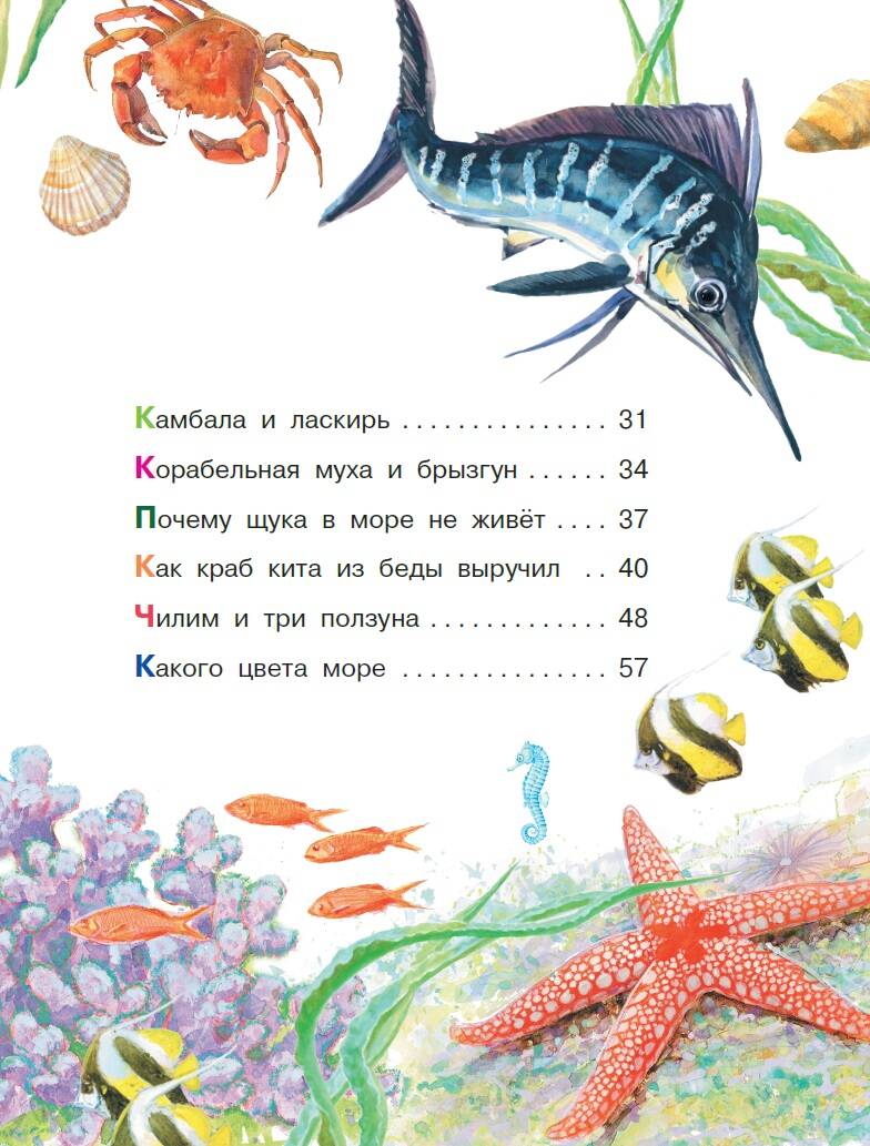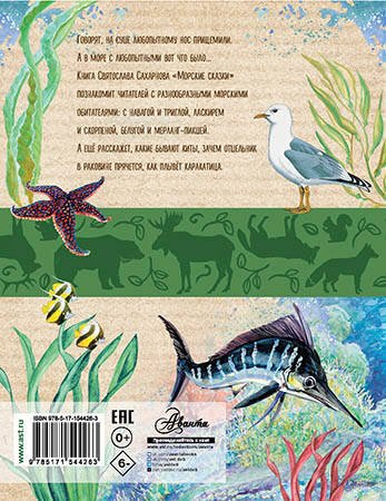 Книга Святослава Сахарнова "Морские сказки" познакомит читателей с самыми разными обитателями морей и океанов: с навагой и триглой, ласкирем и скорпеной, белугой и мерланг-пикшей. Расскажет, какие бывают киты, зачем отшельник в раковине прячется, как плывёт каракатица, осьминог и морской конёк. Для младшего школьного возраста.| Издательство | ИЗДАТЕЛЬСТВО "АСТ" |