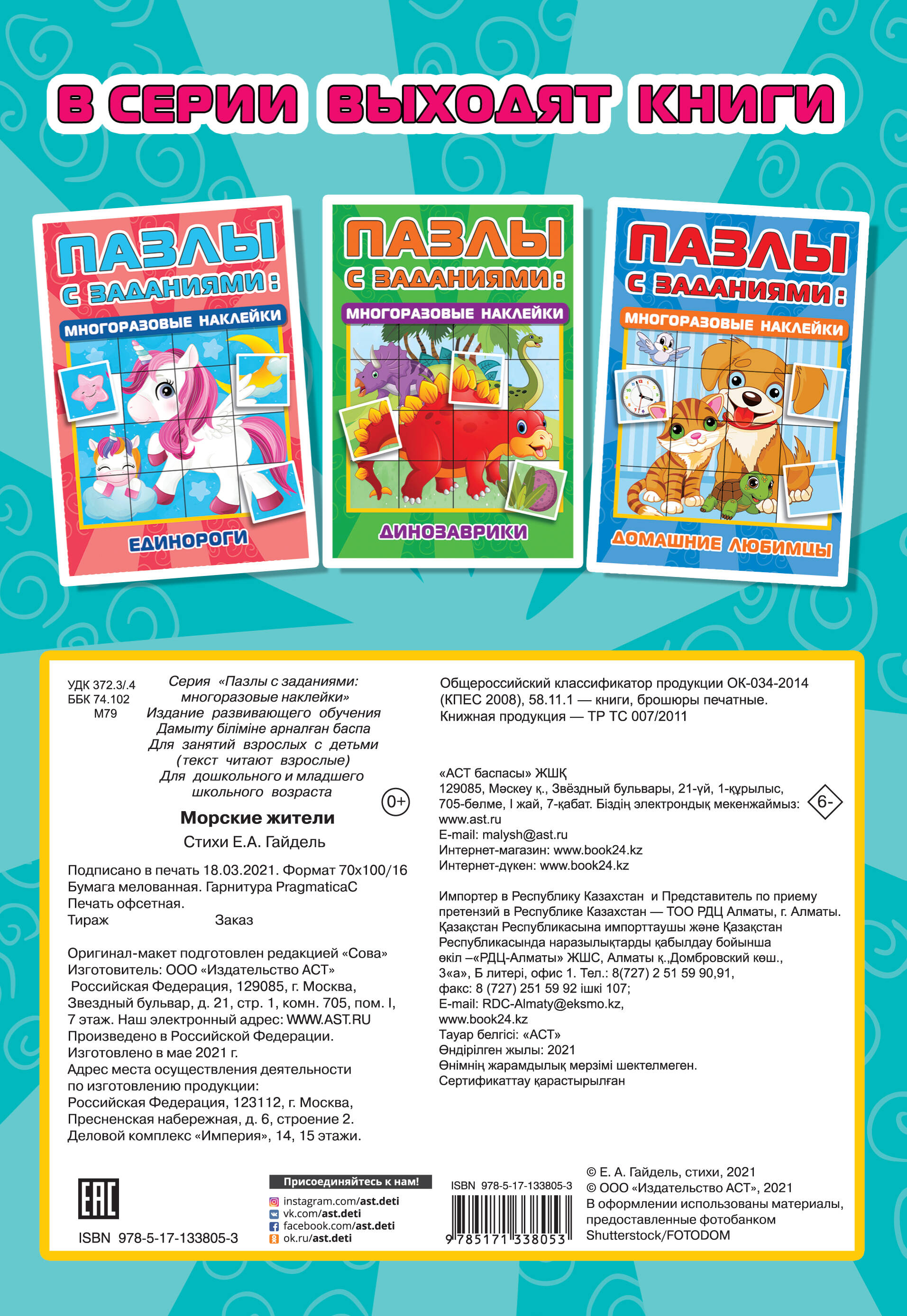 О чем эта книга Это прекрасно иллюстрированная книга весёлых загадок с многоразовыми наклейками для любознательных малышей. Ребёнок сможет сам дополнить картинки морских обитателей пазлами-стикерами. Кому эта книга будет интересна Весёлые загадки с картинками + набор многоразовых наклеек для любознательных малышей. Каковы особенности этой книги • Яркие иллюстрации и многоразовые пазлы-наклейки, которые можно приклеивать и отклеивать 100 раз. • Каждая книжка этой серии - занимательная, полезная игра с многоразовыми наклейками. • Малышу очень интересно искать нужные наклейки, правильно подбирать фрагменты картинок. • Отгадывание веселых загадок и поиск наклеек сделают игры с книжками увлекательными и полезными: помогут ребёнку тренировать пальчики, развивать речь, внимание, память. • Это отличное решение для семейного отдыха, ведь собирать картинки интересно и увлекательно не только малышам, но и их родителям. Играя с пазлами-наклейками, малыш может создать картинки морских обитателей своими руками!
