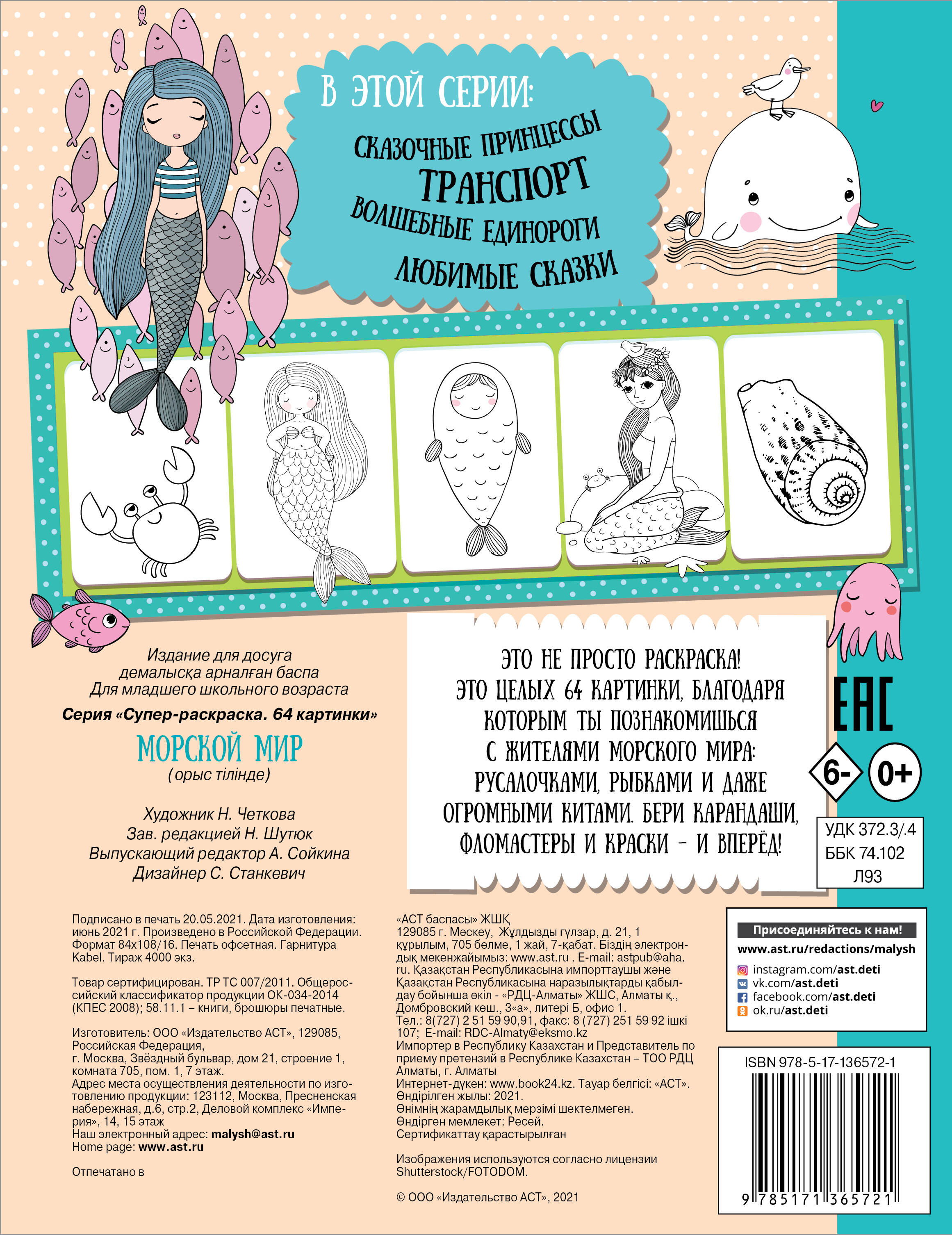 Это не просто раскраска! Это целых 64 картинки, благодаря которым ты познакомишься с жителями морского мира: русалочками, рыбками и даже огромными китами. Бери карандаши, фломастеры и краски - и вперёд| Издательство | ИЗДАТЕЛЬСТВО "АСТ" |
