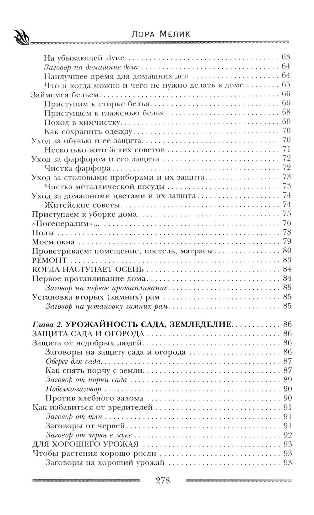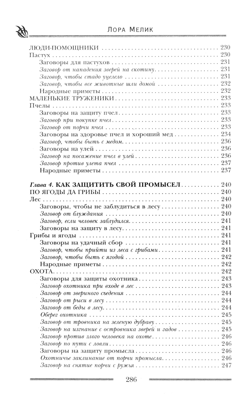 Ведение хозяйства - огромный, непростой, ответственный труд, идет ли речь о домашних хлопотах, об уходе за домашними питомцами, о возделывании земли, о походах за добычей в лес или о постройке нового жилища. Подмога в этом деле никогда не лишняя, и наши предки понимали это как никто, оставив нам, своим потомкам, богатое наследство народной мудрости. Даже в наше время, когда человек не обделен помощью разнообразной техники, хочется, чтобы труду сопутствовала удача и дело спорилось само собой, да и люди худые не сглазили. И тут не обойтись без молитв и заговоров, которых Лора Мелик знает бесчисленное множество: для урожая, для чистоты и уюта, на надежную постройку дома, от нечистой силы, от дурного глаза, от болезней и для здоровья животных, для удачи на охоте, в том числе и ягодногрибной... Все это ждет вас в новой книге, как и полезные народные приметы, и житейские советы по ведению хозяйства, связанные с влиянием Луны.