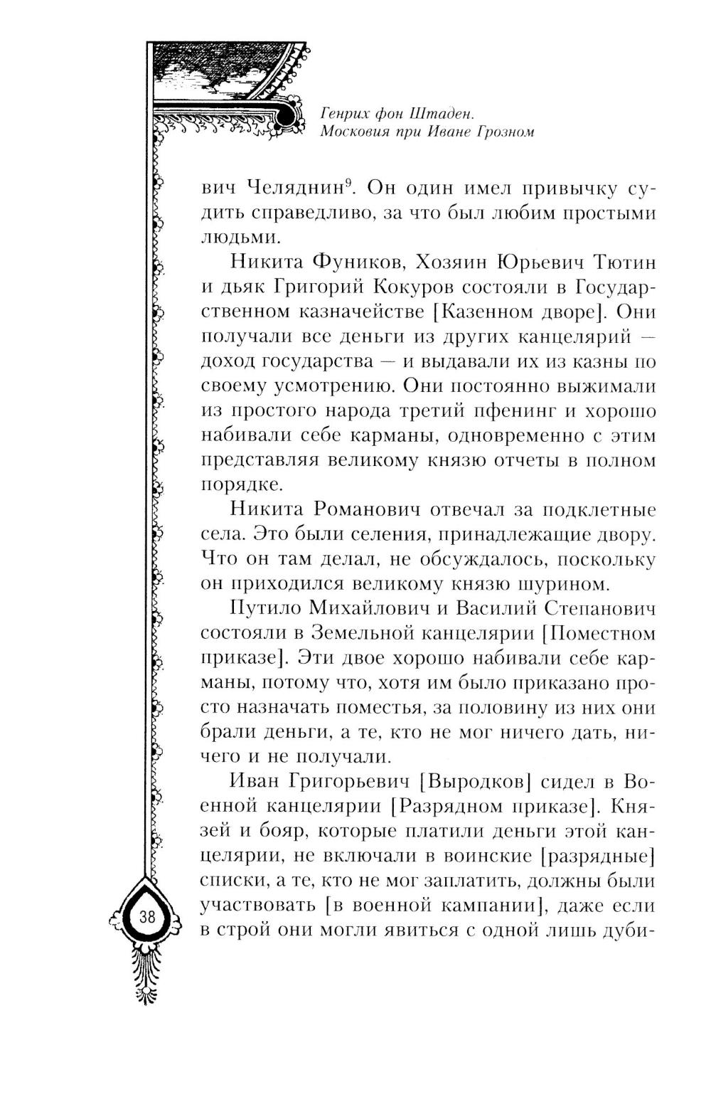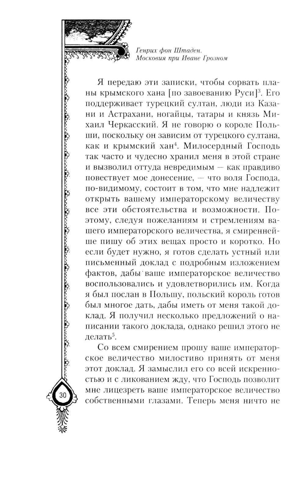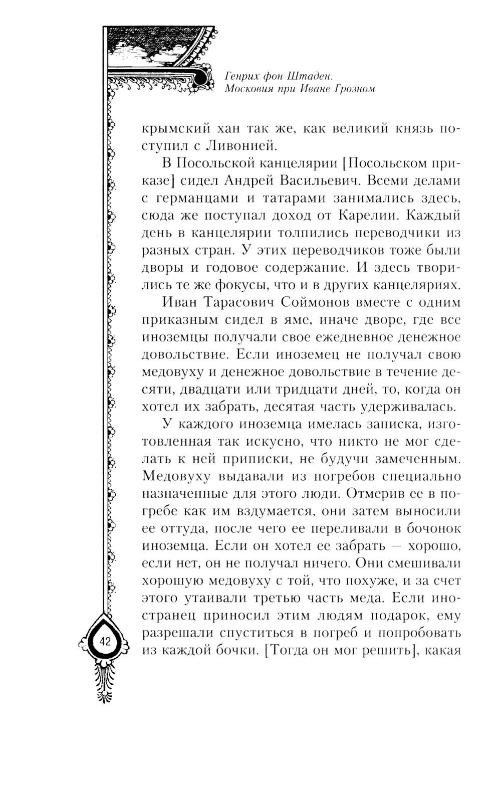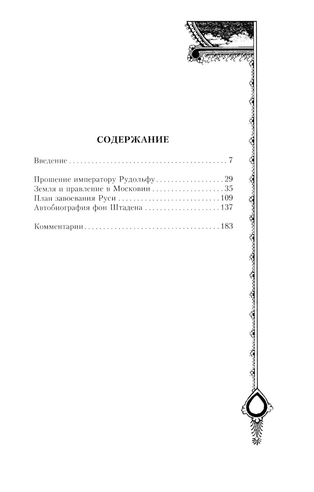 Немецкий искатель приключений, живший в Московской Руси в XVI столетии, оставил редкие исторические свидетельства. Его записки, найденные в архивах только в ХХ веке, в значительной степени изменили прежние представления об эпохе Ивана Грозного. Особо они ценны тем, что автор был непосредственным участником событий, служил царским опричником, находился в гуще происходящего и даже, по его утверждению, лично встречался с государем. Фон Штаден дает описание административного устройства Московии тех времен, ее судебной системы и войска. Приводит перечень наиболее важных «канцелярий» - приказов, ярко и образно воспроизводит принципы их функционирования, называет имена самых влиятельных в то время князей и бояр. Достаточно подробно характеризует Москву и Кремль, а его описание опричного двора, просуществовавшего менее пяти лет до того, как в 1571 году был полностью сожжен крымским ханом, поистине уникально.| Издательство | Центрполиграф |