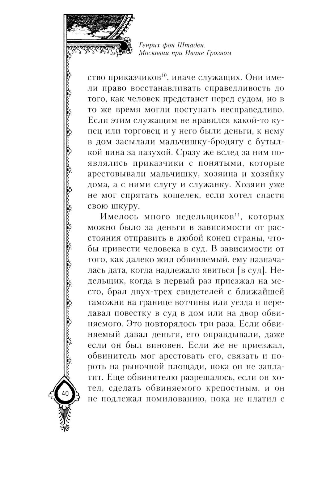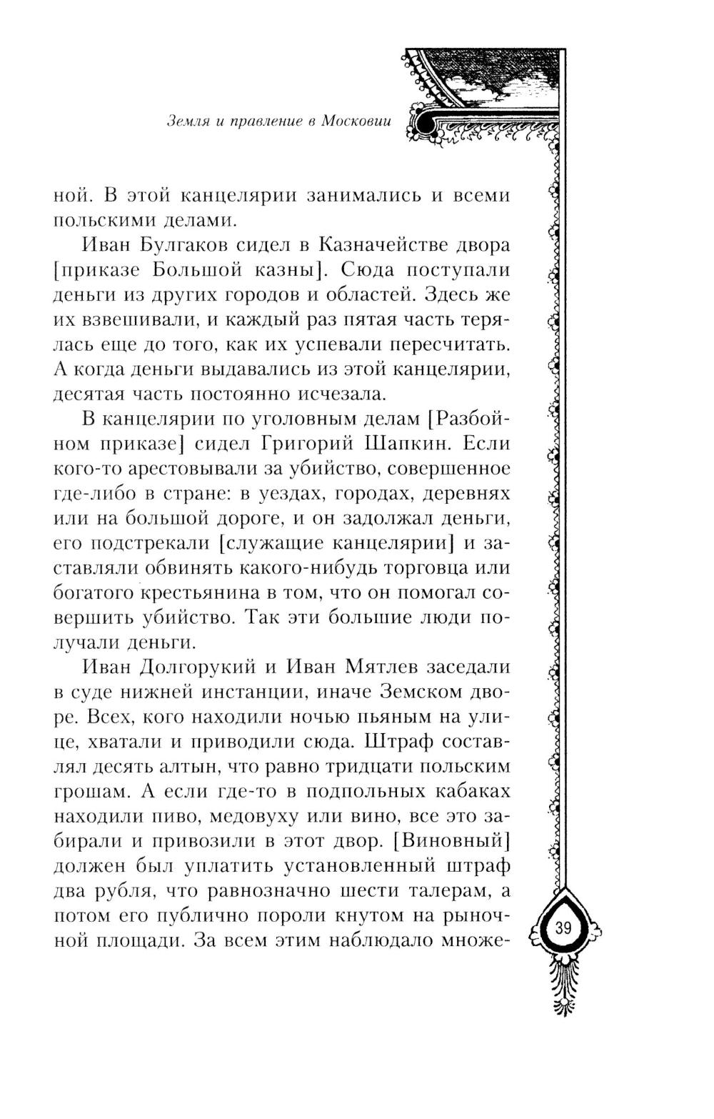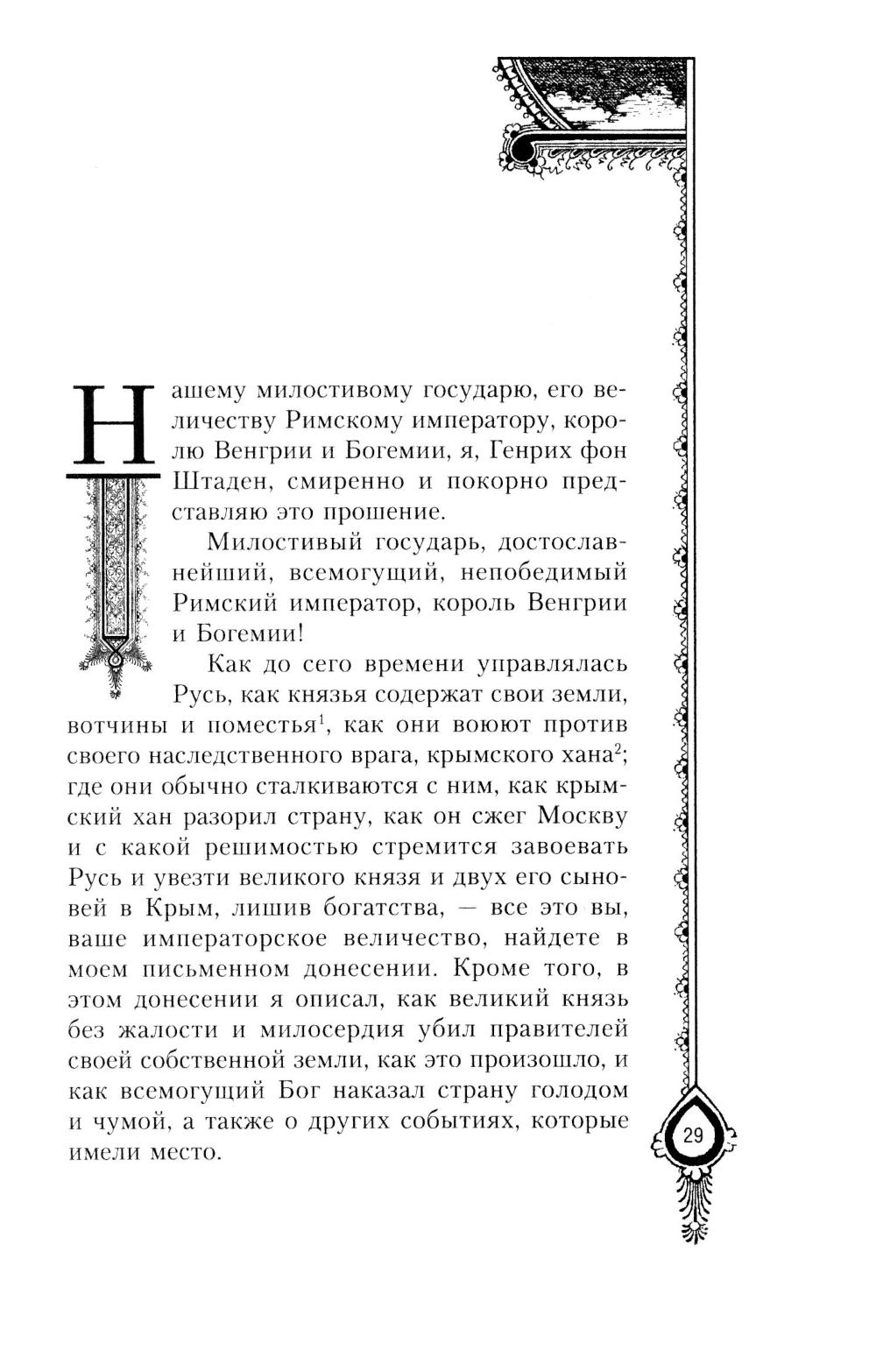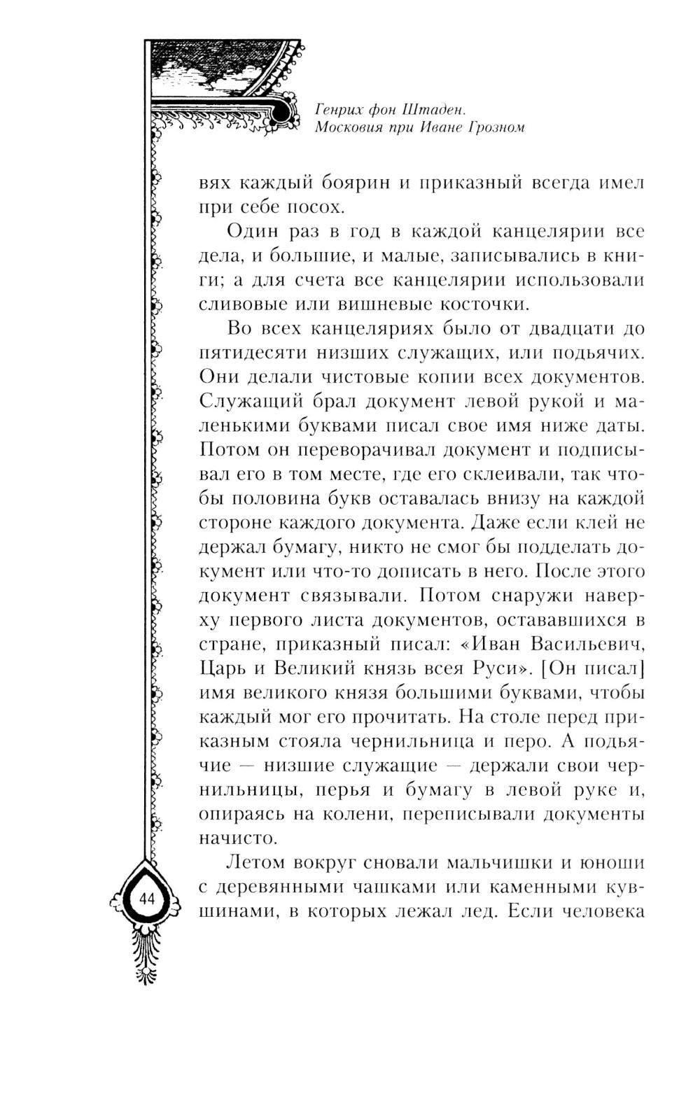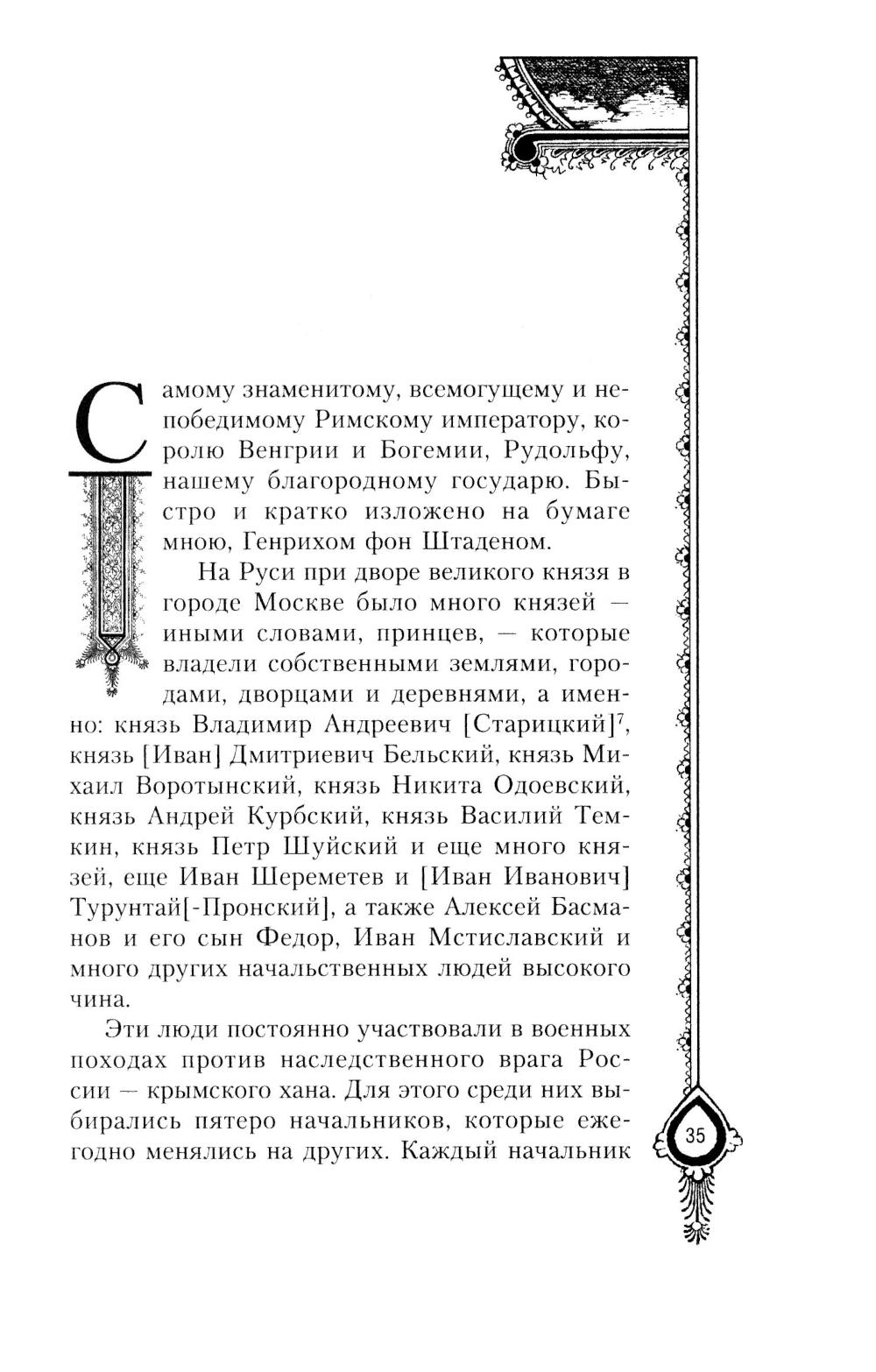 Немецкий искатель приключений, живший в Московской Руси в XVI столетии, оставил редкие исторические свидетельства. Его записки, найденные в архивах только в ХХ веке, в значительной степени изменили прежние представления об эпохе Ивана Грозного. Особо они ценны тем, что автор был непосредственным участником событий, служил царским опричником, находился в гуще происходящего и даже, по его утверждению, лично встречался с государем. Фон Штаден дает описание административного устройства Московии тех времен, ее судебной системы и войска. Приводит перечень наиболее важных «канцелярий» - приказов, ярко и образно воспроизводит принципы их функционирования, называет имена самых влиятельных в то время князей и бояр. Достаточно подробно характеризует Москву и Кремль, а его описание опричного двора, просуществовавшего менее пяти лет до того, как в 1571 году был полностью сожжен крымским ханом, поистине уникально.| Издательство | Центрполиграф |