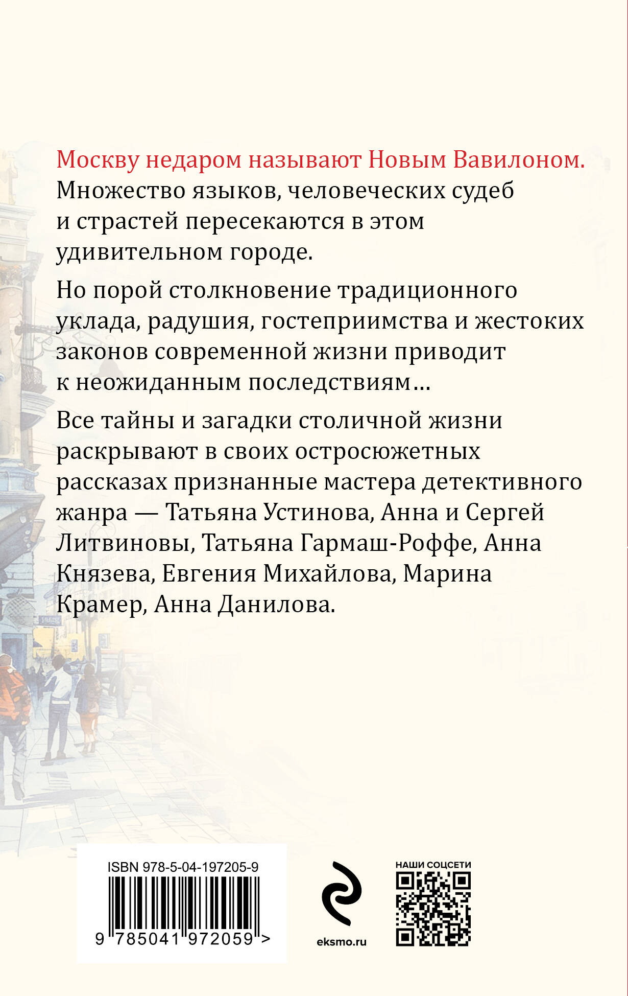 Москву недаром называют Новым Вавилоном. Множество языков, человеческих судеб и страстей пересекаются в этом удивительном городе. Но порой столкновение традиционного уклада, радушия, гостеприимства и жестоких законов современной жизни приводит к неожиданным последствиям… Все тайны и загадки столичной жизни раскрывают в своих остросюжетных рассказах признанные мастера детективного жанра - Татьяна Устинова, Анна и Сергей Литвиновы, Татьяна Гармаш-Роффе, Анна Князева, Евгения Михайлова, Марина Крамер, Анна Данилова.| Издательство | ООО "Издательство "Эксмо" |