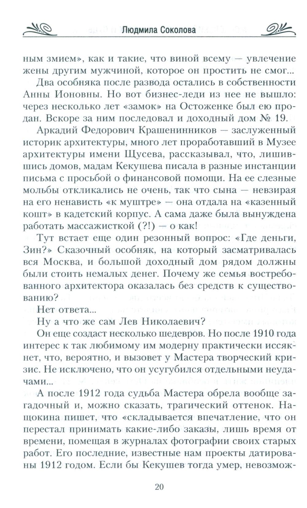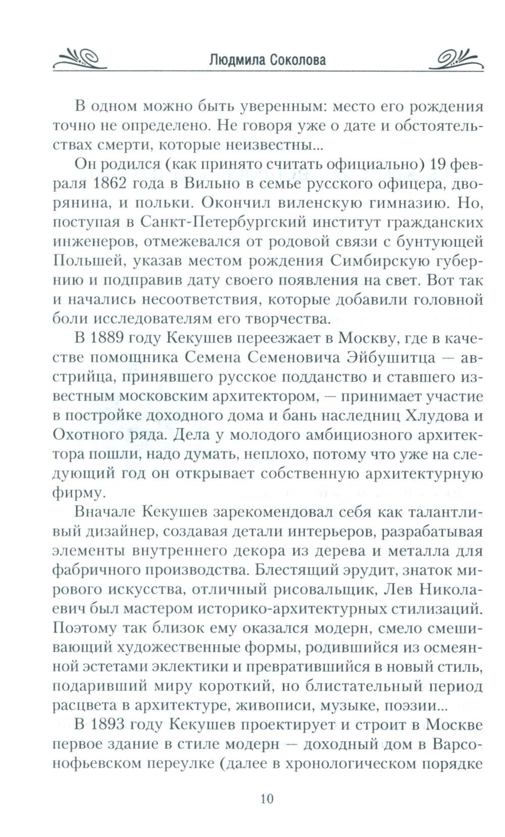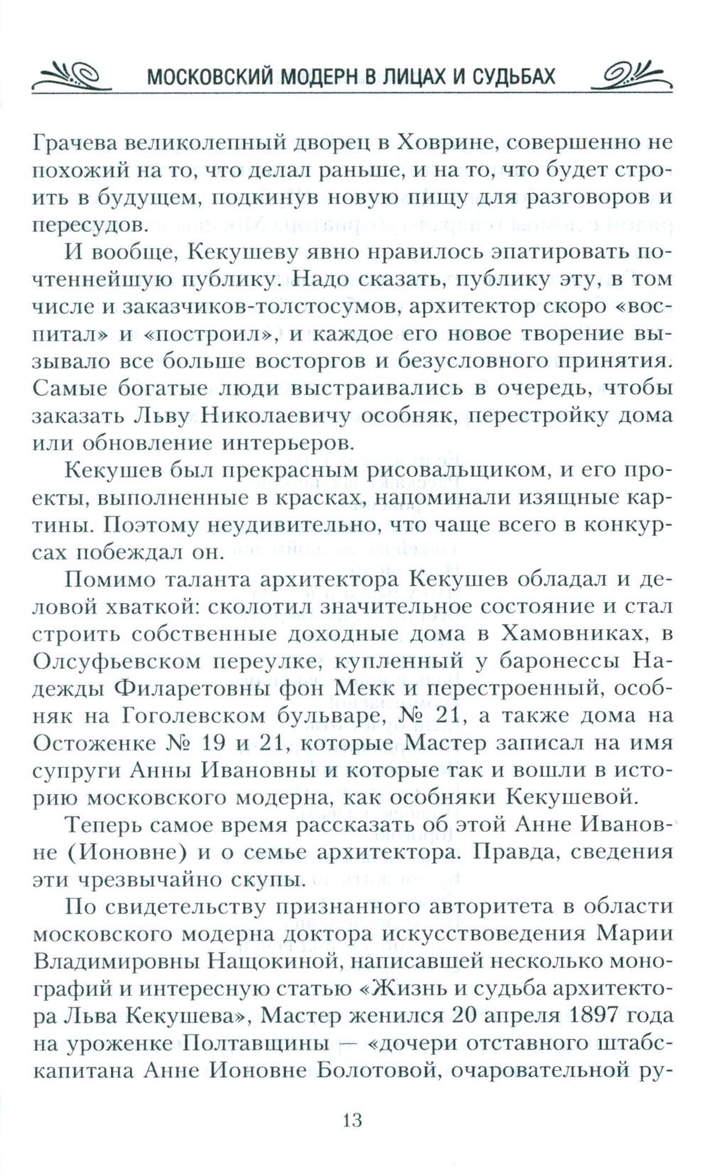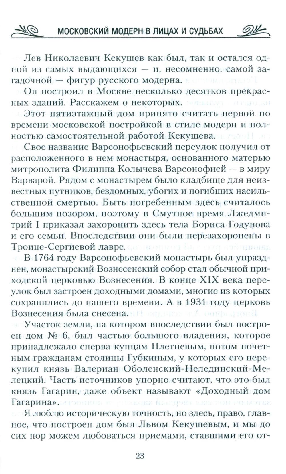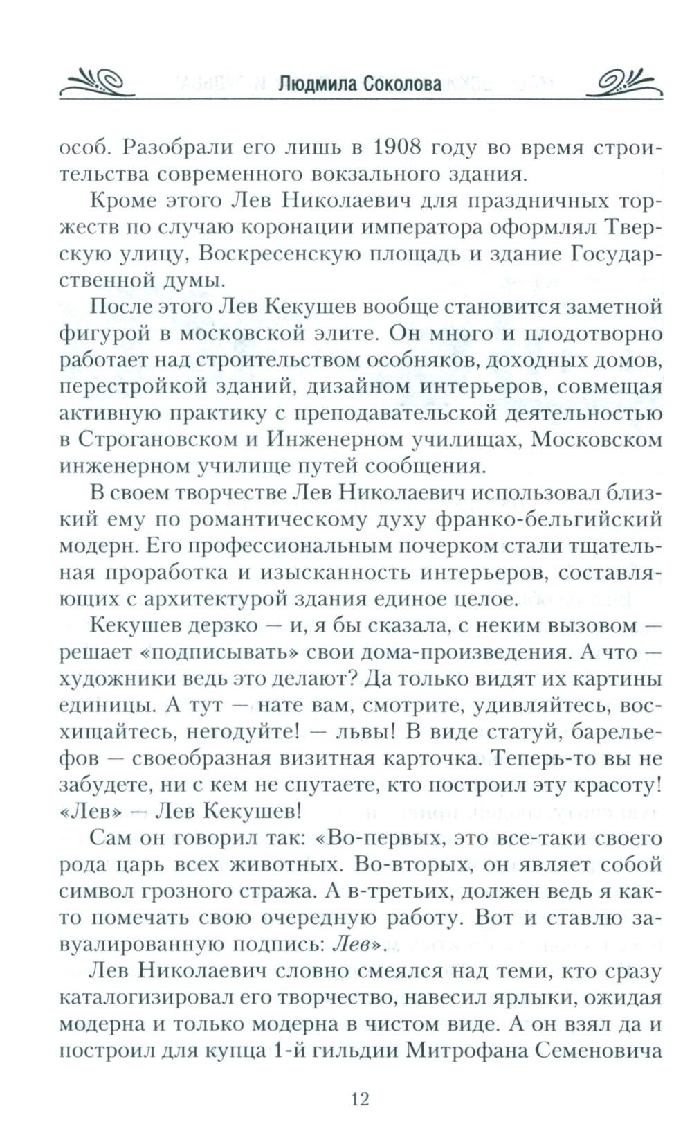 Короткая эпоха расцвета модерна была довольно резко прервана. Классический стиль в искусстве с его плавностью и текучестью форм, растительными орнаментами вряд ли бы прижился в молодом социалистическом государстве. Но, несмотря на строительство коммунизма и воцарение новых порядков, шедевры модерна на улицах Москвы сохранились: многие из них в превосходном состоянии дошли до наших дней. И сегодня мы имеем возможность любоваться ими. Так уж случилось, что самые яркие здания в стиле модерн не принесли счастья ни тем, кто их создал, ни тем, кто в них жил. В этой книге мы совершим увлекательное путешествие не только по улицам Москвы, но и во времени: вернемся назад, чтобы лучше понять день сегодняшний.| Издательство | Центрполиграф |