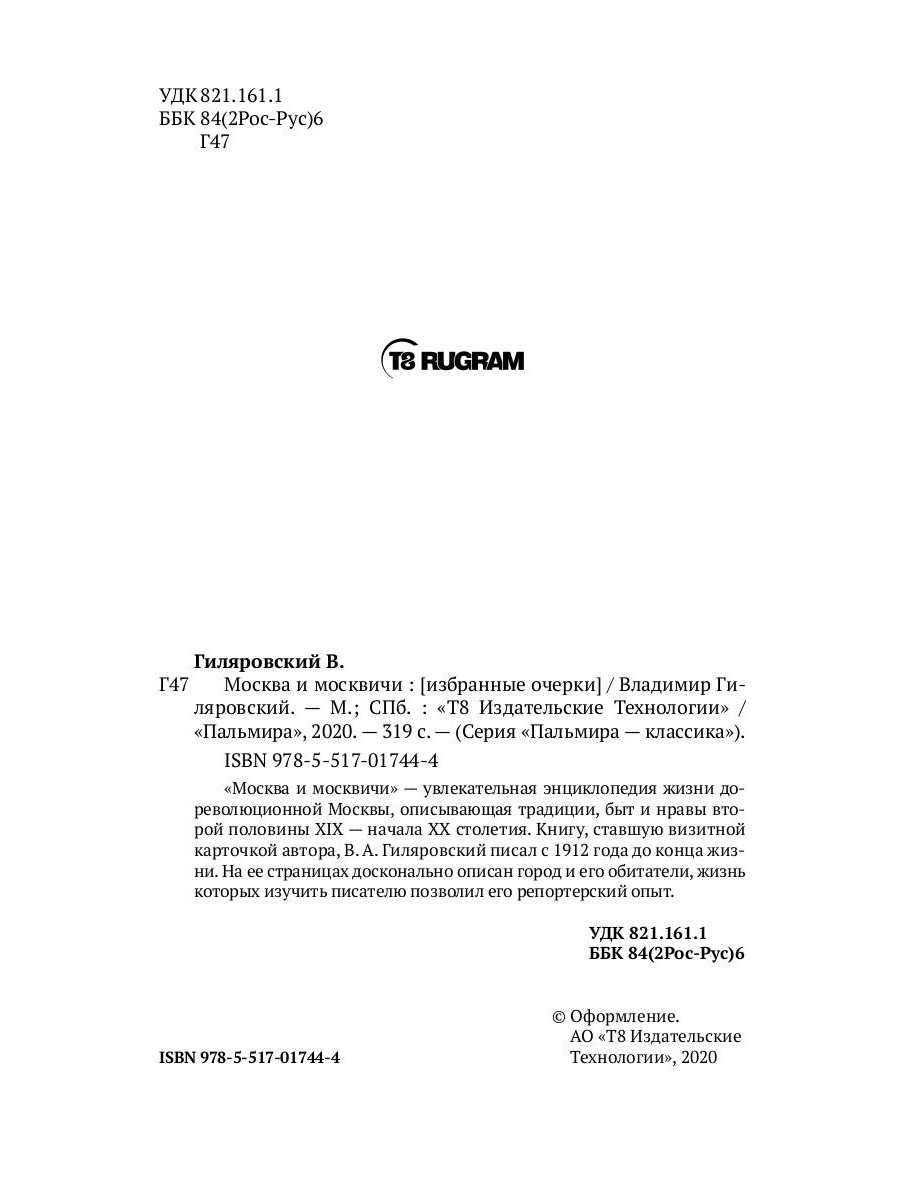 «Москва и москвичи» - увлекательная энциклопедия жизни дореволюционной Москвы, описывающая традиции, быт и нравы второй половины XIX - начала XX столетия. Книгу, ставшую визитной карточкой автора, В. А. Гиляровский писал с 1912 года до конца жизни. На ее страницах досконально описан город и его обитатели, жизнь которых изучить писателю позволил его репортерский опыт.| Издательство | Т8 RUGRAM |