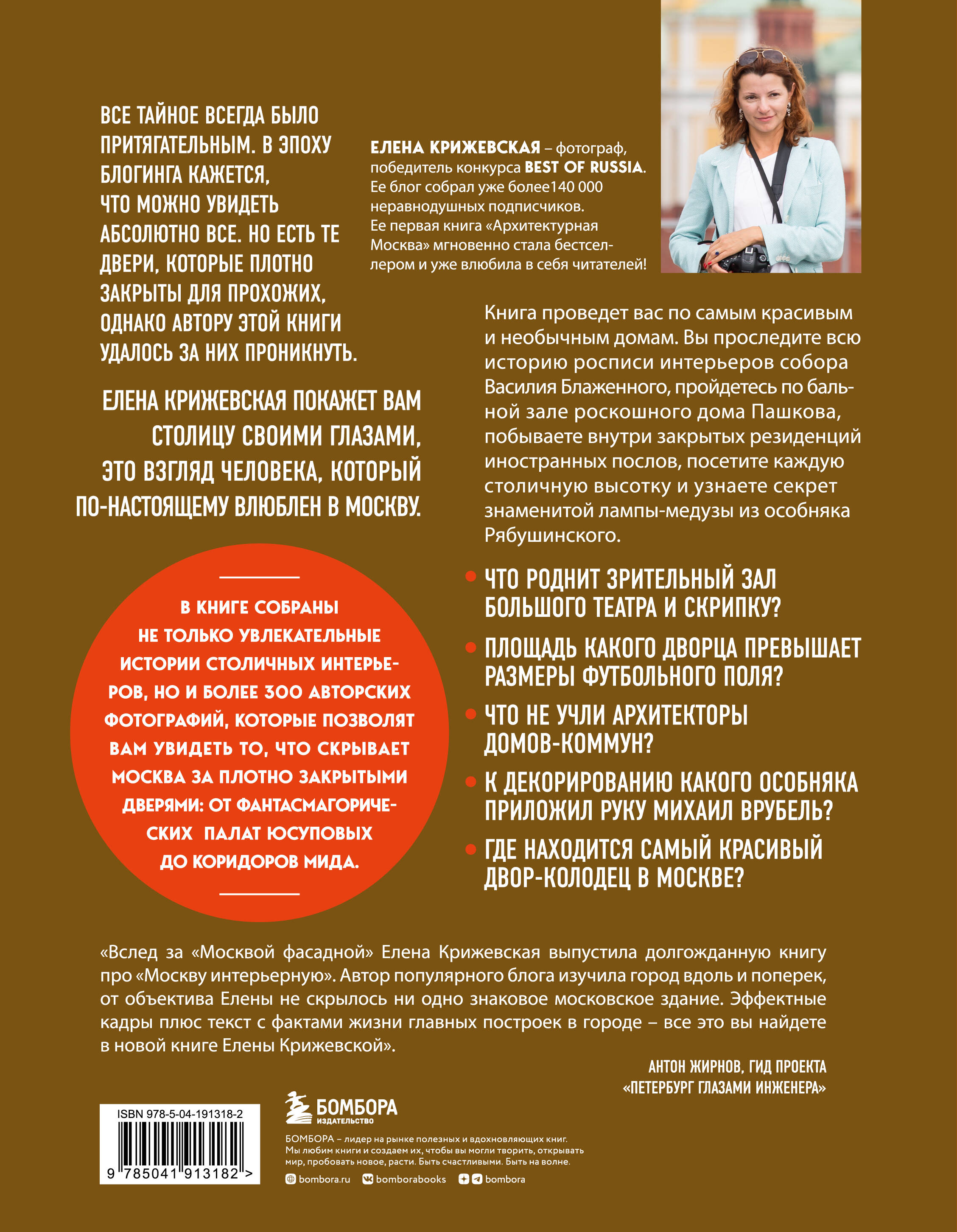 Любимая книга в новом оформлении! Прогулки по интерьерам Москвы с блогером Еленой Крижевской - это путешествия для тех, кто влюблен в Москву или хочет в нее влюбиться. Погружение в удивительный мир стилей, исторических памятников и человеческих судеб. Это возможность узнать, кто разместил цитату Ницше на одном из красивейших зданий белокаменной столицы, как связаны кадрилью балерина Балашова, танцовщица Дункан и Главное управление по обслуживанию дипкорпуса МИДа, чем эклектика отличается от неостиля и чего не учли архитекторы домов-коммун. А главное - открыть для себя даже самые закрытые интерьеры Москвы. И, конечно, составить свои, индивидуальные маршруты прогулок по любимому городу. В книге использованы уникальные фотографии автора, сделанные ею в потрясающих по своей архитектуре особняках и домах столицы, многие из которых не доступны для посещения обычным прохожим. Новое издание выходит с обновленной редакцией и добавленными фотографиями.| Издательство | ООО "Издательство "Эксмо" |
