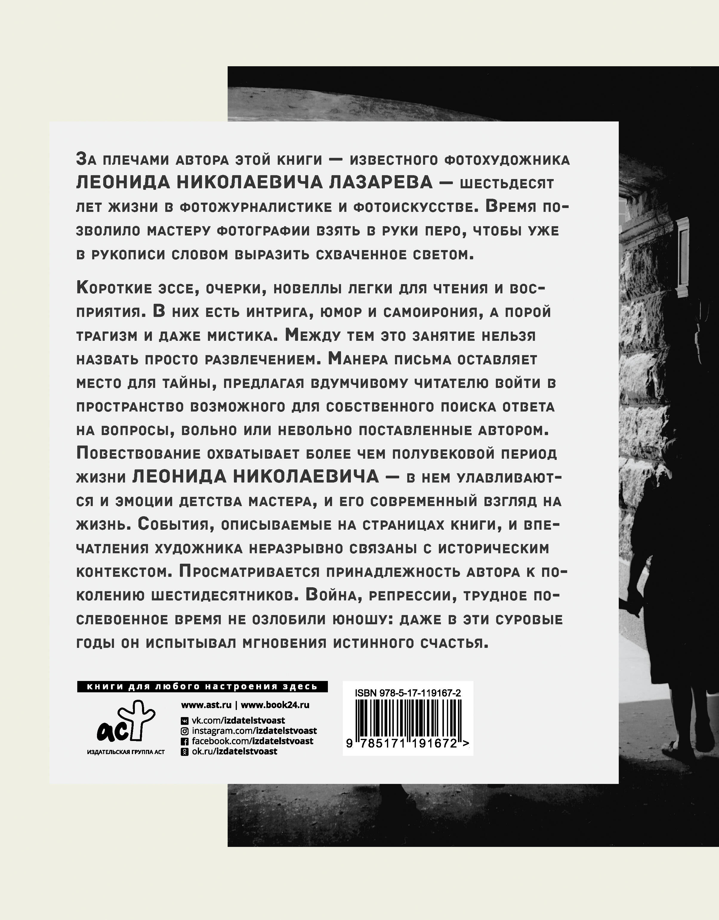 За плечами автора этой книги - известного фотохудожника Леонида Николаевича Лазарева - шестьдесят лет жизни в фотожурналистике и фотоискусстве. Время позволило мастеру фотографии взять в руки перо, чтобы уже в рукописи словом выразить схваченное светом. Короткие эссе, очерки, новеллы легки для чтения и восприятия. В них есть интрига, юмор и самоирония, а порой трагизм и даже мистика. Между тем это занятие нельзя назвать просто развлечением. Манера письма оставляет место для тайны, предлагая вдумчивому читателю войти в пространство возможного для собственного поиска ответа на вопросы, вольно или невольно поставленные автором. Повествование охватывает более чем полувековой период жизни Леонида Николаевича - в нем улавливаются и эмоции детства мастера, и его современный взгляд на жизнь. События, описываемые на страницах книги, и впечатления художника неразрывно связаны с историческим контекстом. Просматривается принадлежность автора к поколению шестидесятников. Война, репрессии, трудное послевоенное время не озлобили юношу: даже в эти суровые годы он испытывал мгновения истинного счастья.| Издательство | ИЗДАТЕЛЬСТВО "АСТ" |