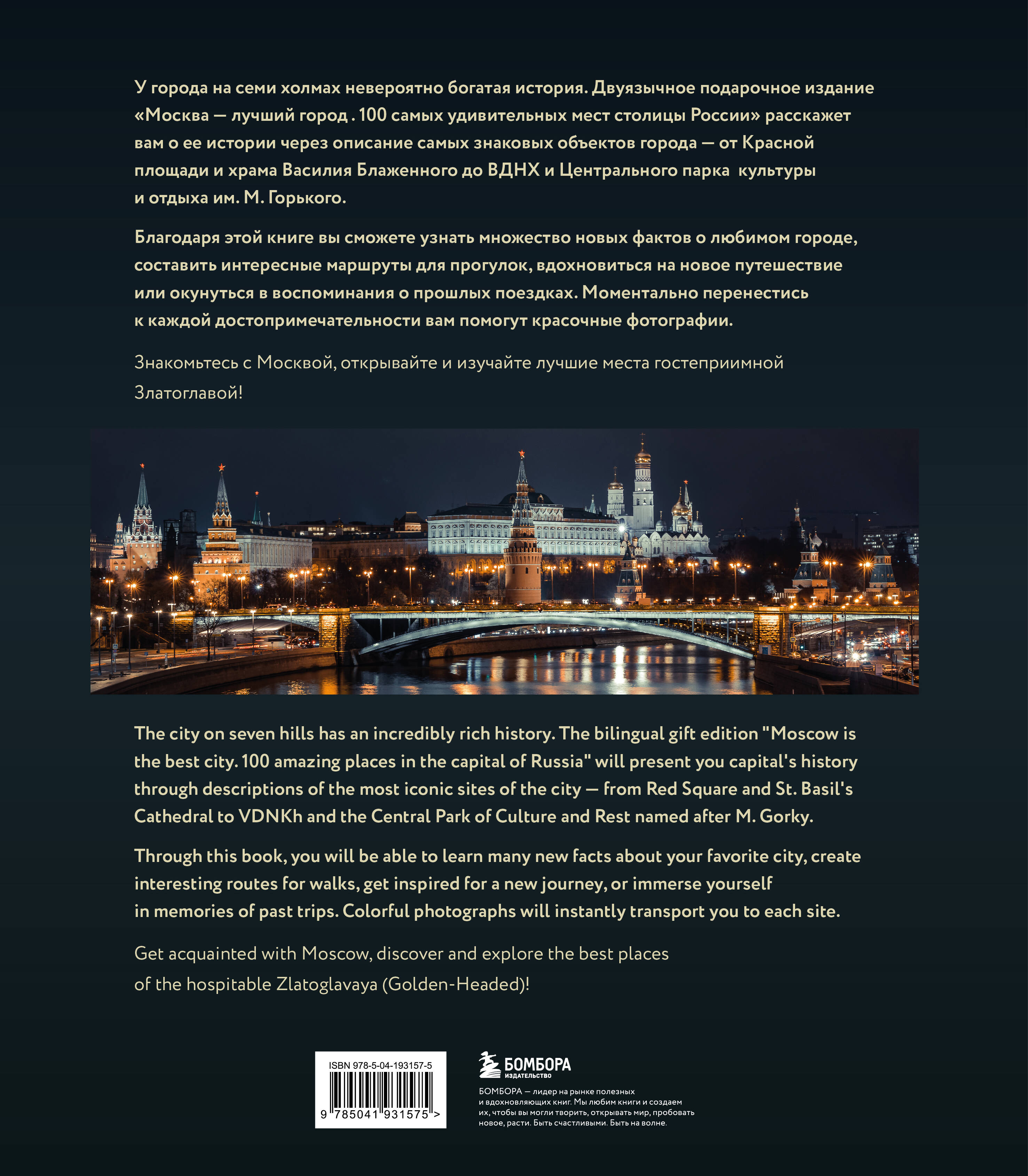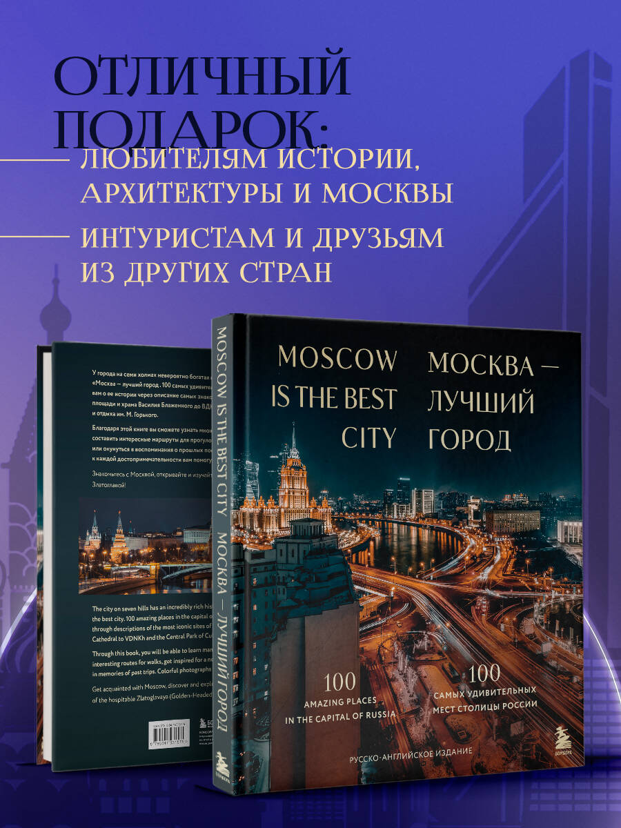 У города на семи холмах невероятно богатая история. Двуязычное подарочное издание «Москва - лучший город. 100 самых удивительных мест столицы России» расскажет вам о ее истории через описание самых знаковых объектов города - от Красной площади и храма Василия Блаженного до ВДНХ и Центрального парка культуры и отдыха им. М. Горького. Благодаря этой книге вы сможете узнать множество новых фактов о любимом городе, составить интересные маршруты для прогулок, вдохновиться на новое путешествие или окунуться в воспоминания о прошлых поездках. Моментально перенестись к каждой достопримечательности вам помогут красочные фотографии. Вы узнаете: • Какая церковь относится к числу самых древних в Москве. • Куда отправиться, чтобы увидеть лучший образец московского модерна. • В каком доме на Мясницкой представлен самый большой выбор чая. • Какую смотровую площадку выбрать, чтобы насладиться удивительной красотой мегаполиса. • Куда поехать летом, чтобы отдохнуть на природе и полюбоваться кувшинками или различными сортами сирени. • В каком парке лучшие экотропы и места для пикника. Знакомьтесь с Москвой, открывайте новые места и изучайте самые знаковые места гостеприимной Златоглавой!| Издательство | ООО "Издательство "Эксмо" |