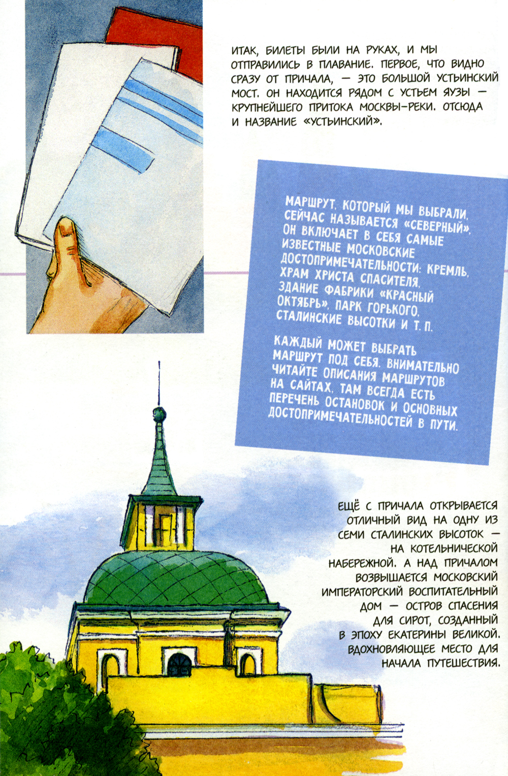 Согласитесь, магия любого путешествия в том, что оно уже никогда не повторится! Вы можете каждое лето отправляться в отпуск в излюбленное местечко, но каждый раз вы по-новому откроете его. Путешествия дарят нам яркие впечатления на всю жизнь, новые знакомства и новые знания. Варя Леднёва, автор творческого проекта «Дневник путешествий по России в рисунках», делится в своей серии путеводителей идеями, куда можно отправиться самостоятельно или в компании близких людей, будь то просто выходной день или летний отпуск. Обязательное условие - хорошее наароение и любознательность! Всё остальное вы узнаете из её графических репортажей из самых красивых уголков нашей страны. На этот раз предлагаем экскурсию по Москве-реке: готовы поспорить, что, даже если вы житель столицы, вы давненько не любовались городом с реки!