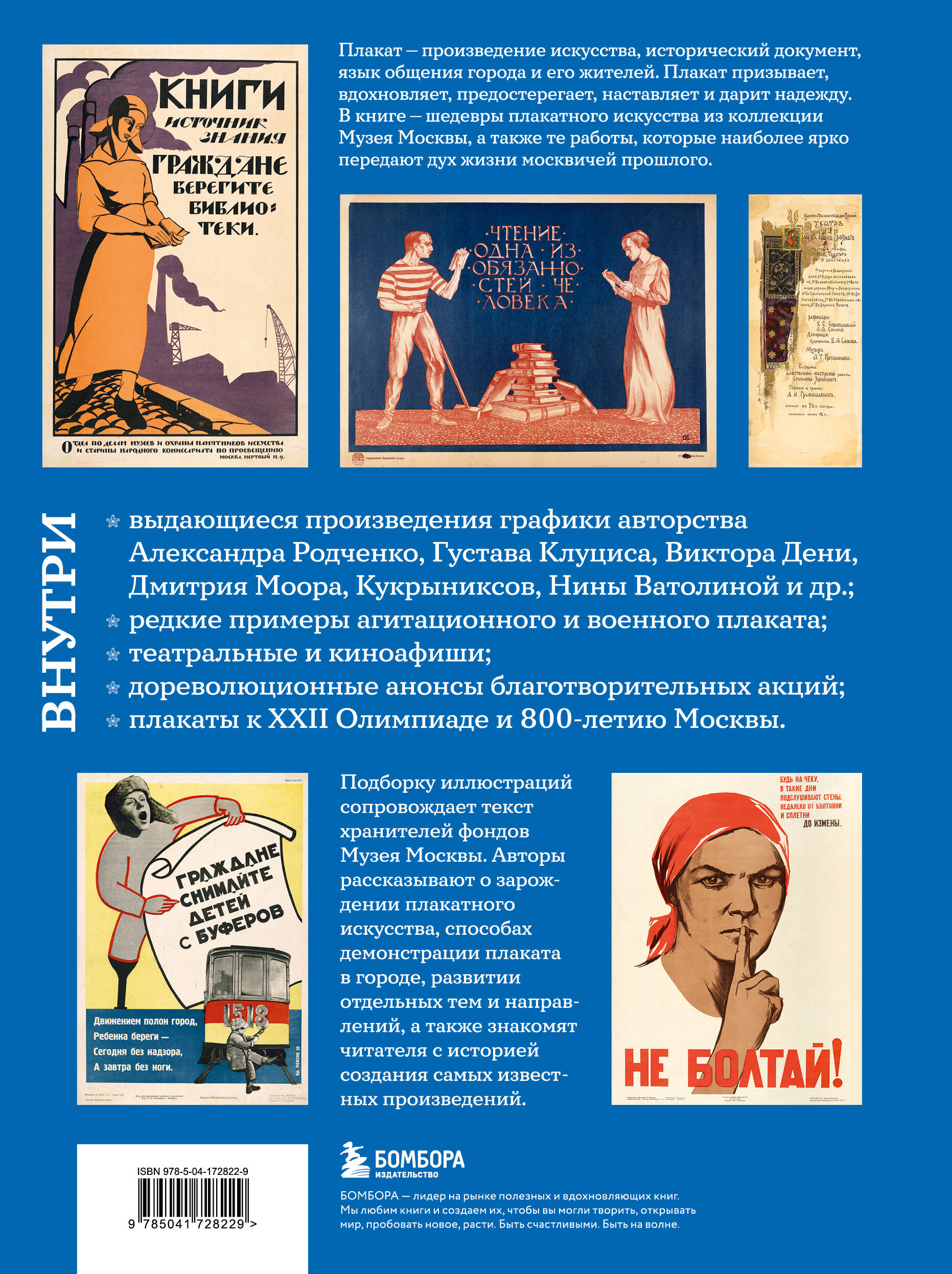 Плакат - и плод труда художника, и свидетельство прошлого. Листая эту книгу, можно проследить, как один стиль приходил на смену другому, наиболее ярко проявляясь порой именно в массовом искусстве плаката. В издание вошли работы Дм. Моора, В. Дени, Н. Ватолиной, А. Родченко, Г. Клуциса и других мастеров графики, отобранные из обширной коллекции Музея Москвы. Эти плакаты - возможность посмотреть на Москву прошлого, приобщиться к духу прошедших десятилетий: посочувствовать транспортным проблемам 1930-х годов, разделить восторг от запуска метро и асфальтирования улиц, ощутить радостное предвкушение открытия Олимпийских игр и Всемирного фестиваля молодежи и студентов. В книгу вошли более 170 плакатов и фотографий.| Издательство | ООО "Издательство "Эксмо" |