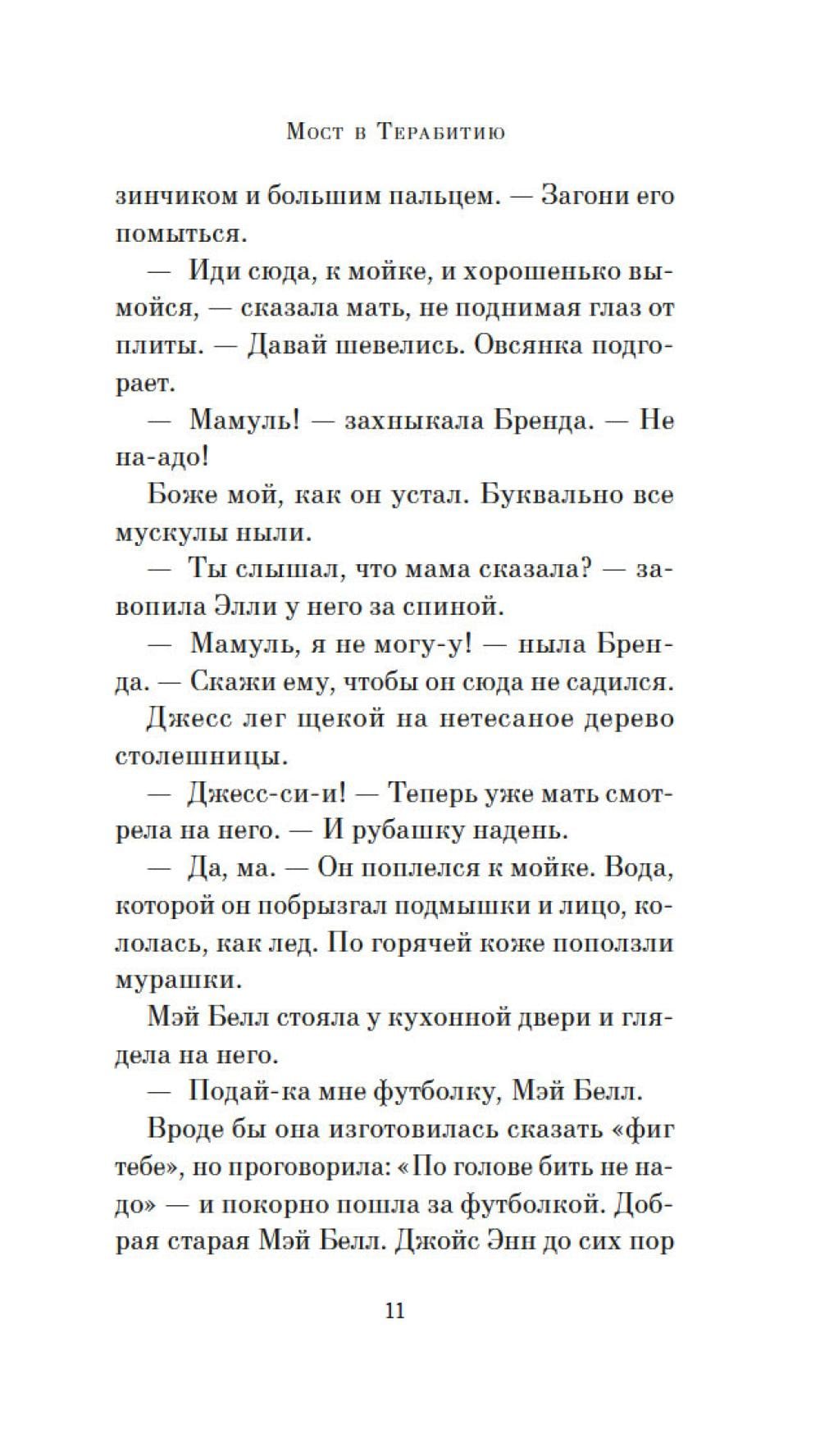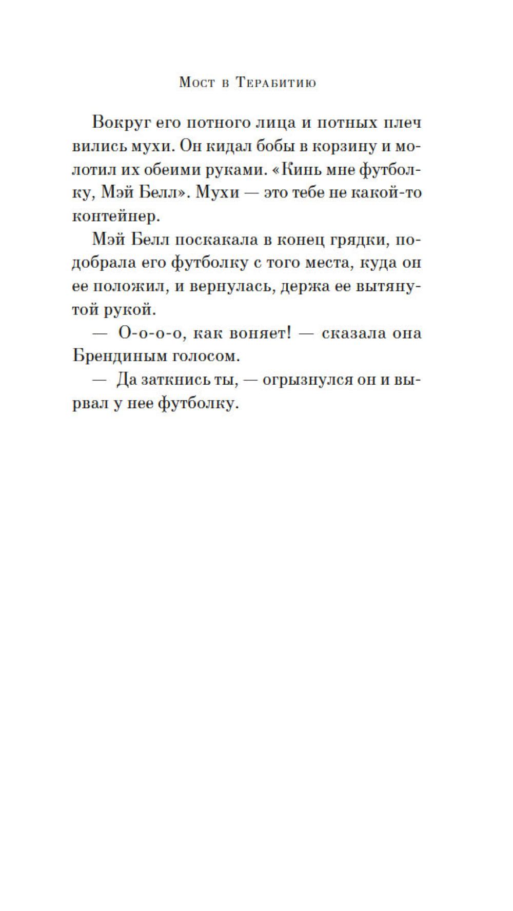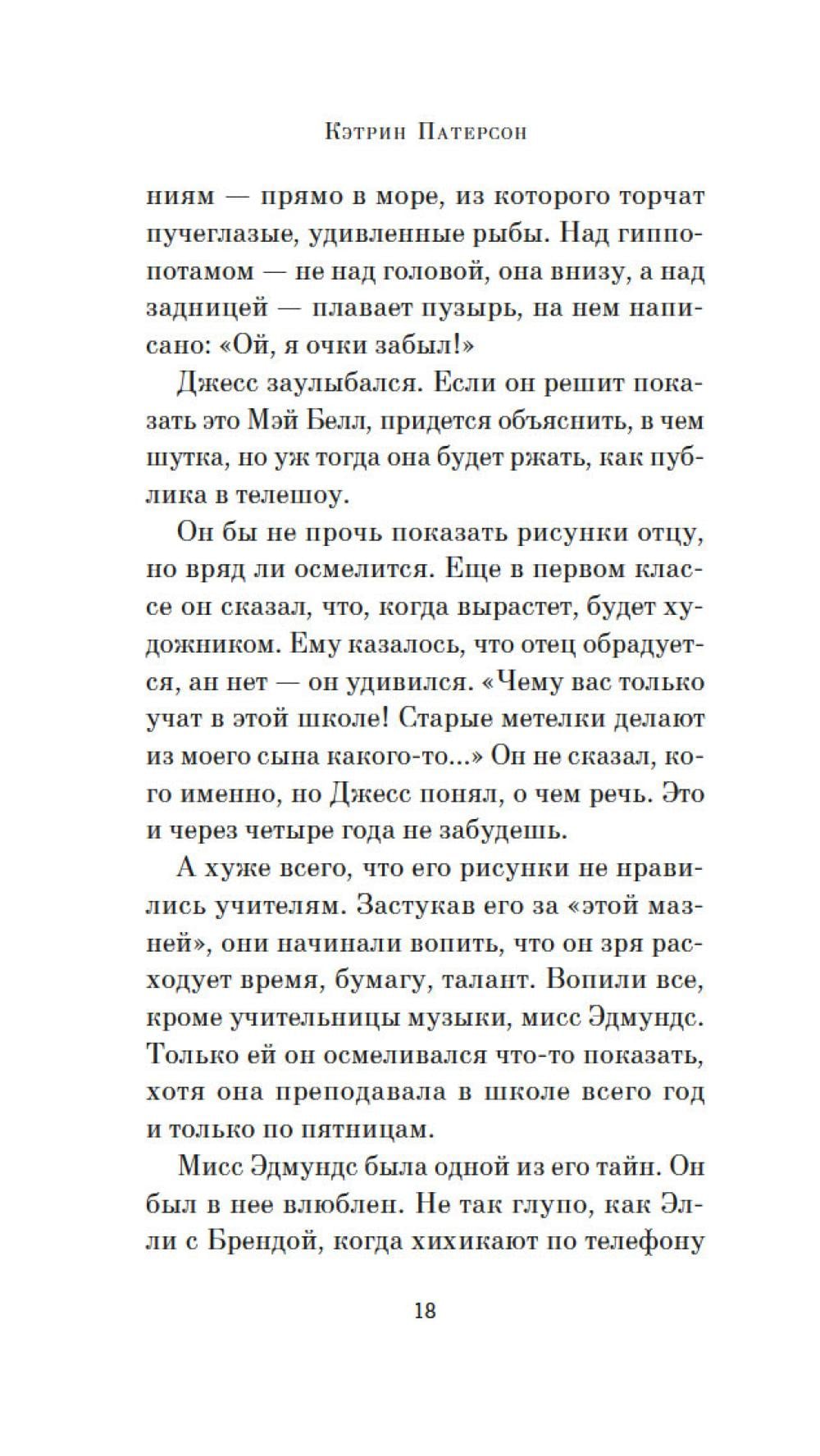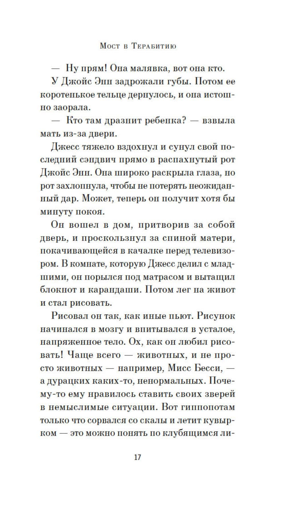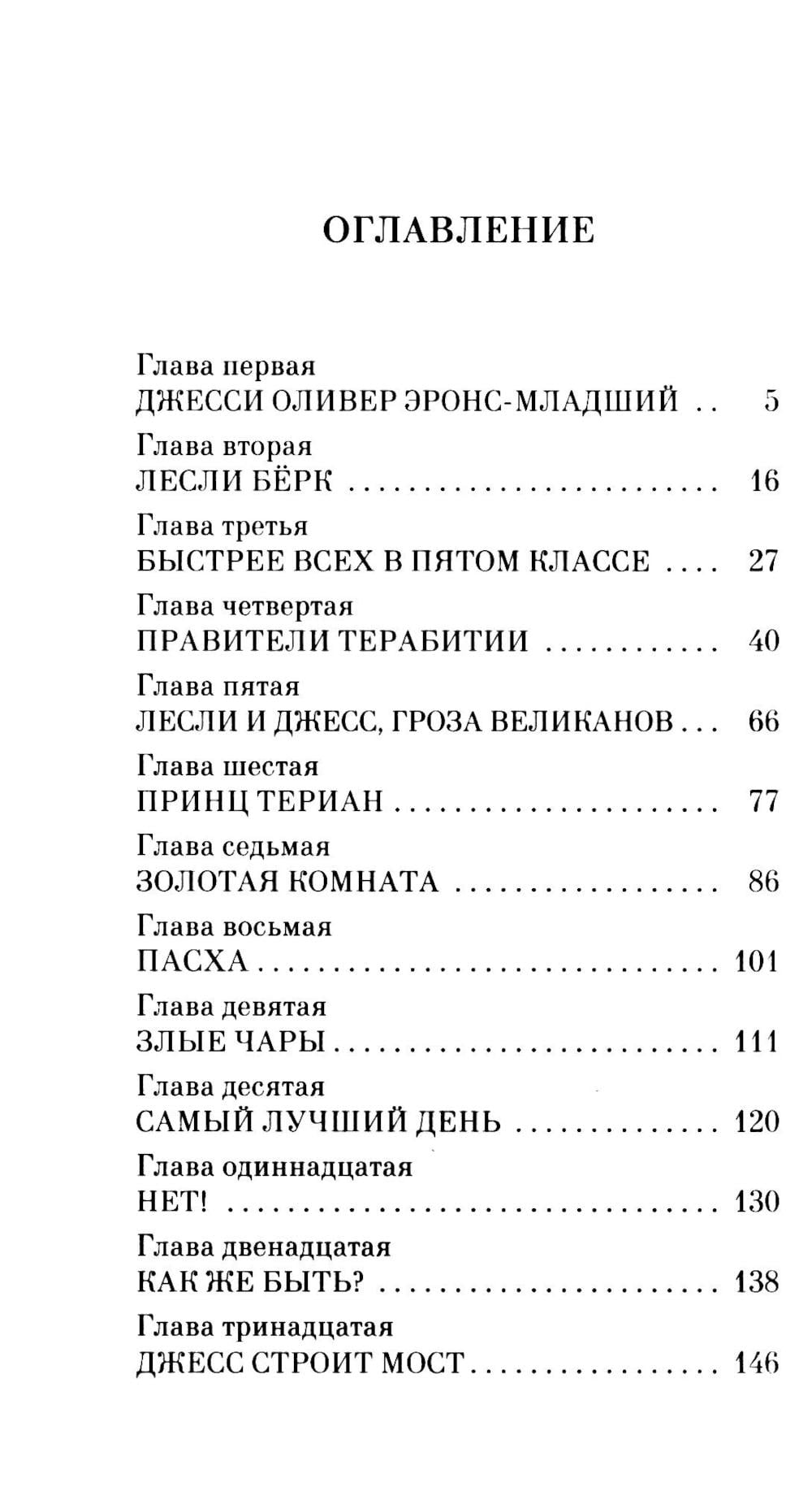 Десятилетний Джесси Эронс здорово рисует, только мало кто об этом знает. Родители едва сводят концы с концами - им не до фантазий сына, а сестры вечно донимают насмешками, так что с ними он и подавно не стал бы это обсуждать. Но вот однажды у Джесси появляется новая соседка - его сверстница Лесли Бёрк. Она совсем не такая, как другие его одноклассники: и одета странно, и телевизора у нее нет. Зато она знает уйму разных историй и с ней можно разговаривать о чем угодно. И даже вместе отправиться в Терабитию, страну, где Джесси - великий король, а Лесли - королева. Страну, которая в буквальном смысле находится по ту сторону реки… В этой пронзительной книге речь идет о мужестве быть самим собой и о том, как тяжелая утрата помогает стать сильнее и обрести собственный путь. И вот уже почти пятьдесят лет история о правителях Терабитии вновь и вновь разбивает читательские сердца.| Издательство | Азбука |