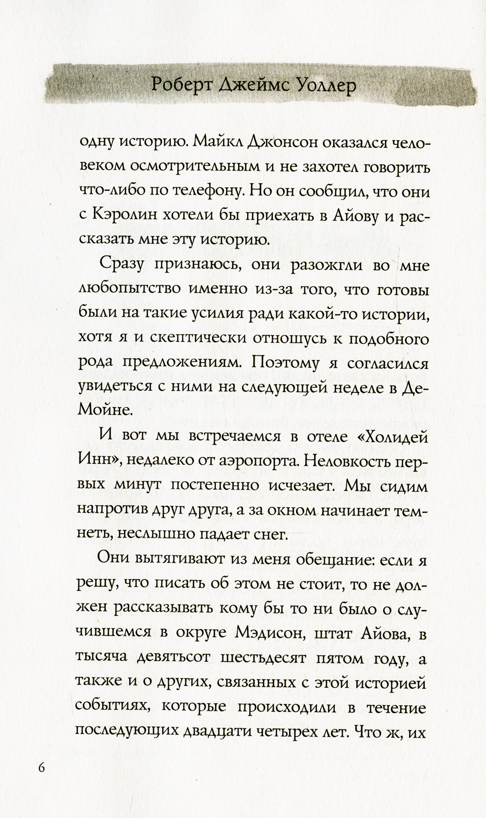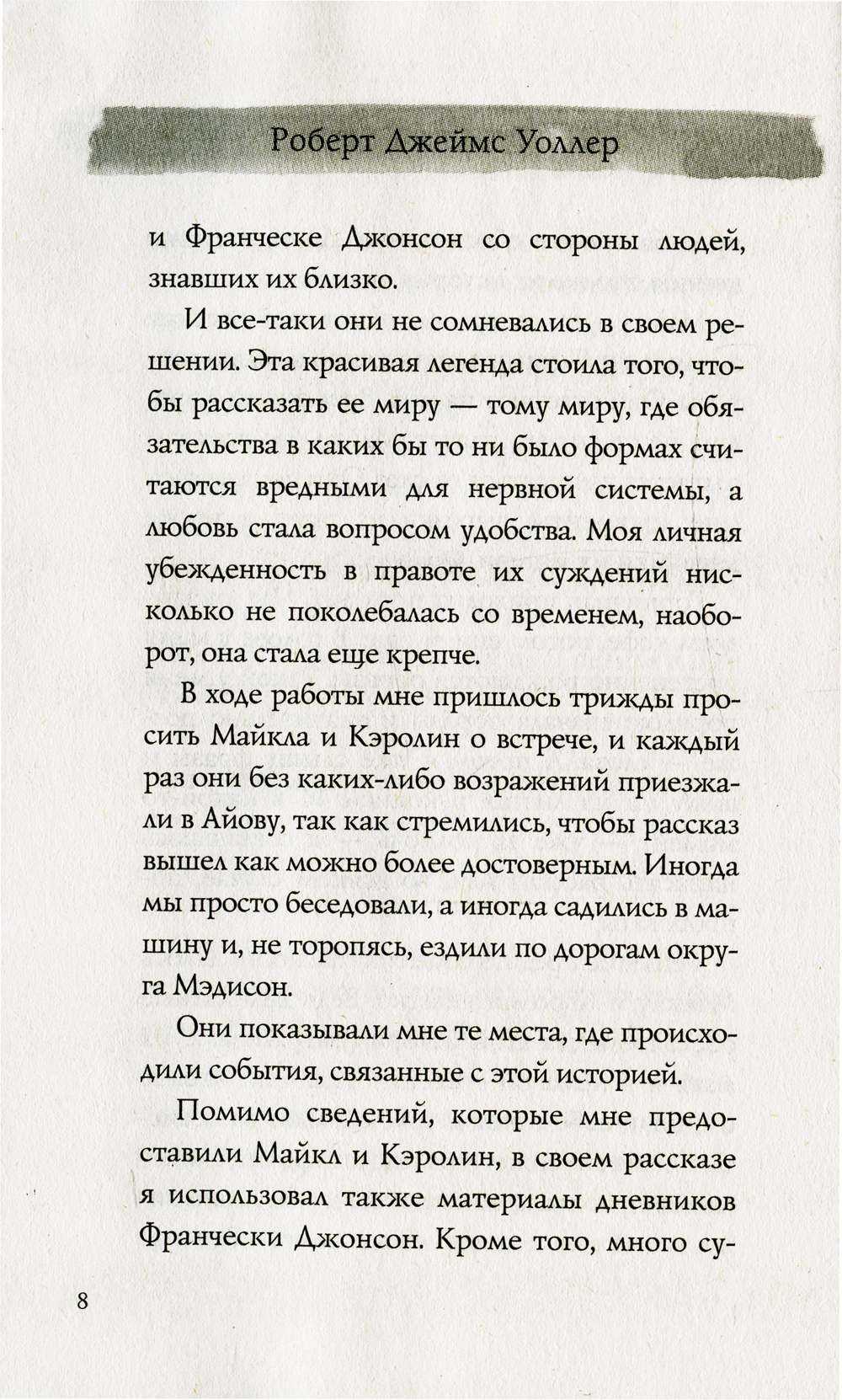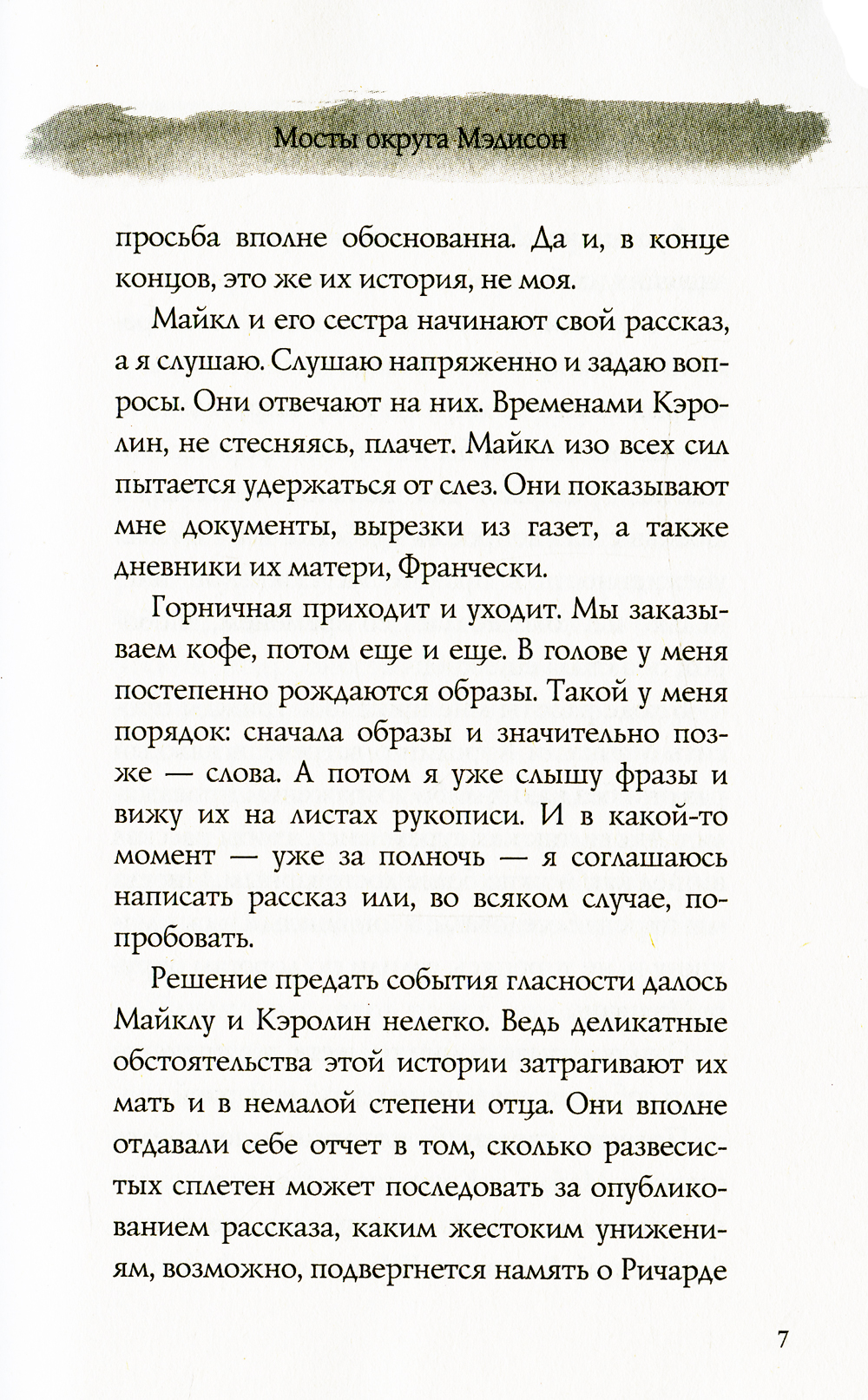 Эта книга - крупнейший литературный феномен Америки, который находился в списке бестселлеров крупнейших газет страны более 90 недель, по праву стал безоговорочным победителем премии ЭББИ. Только в США первый тираж романа тогда никому не известного автора, профессора из Айовы, составил семь миллионов экземпляров. "Мосты округа Мэдисон" - это роман, который пишут только раз в жизни, роман о любви и потере.