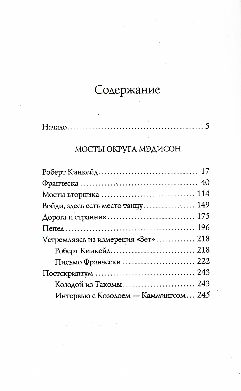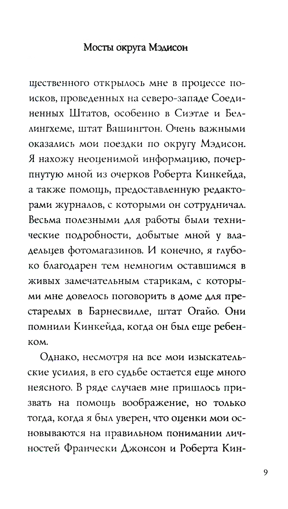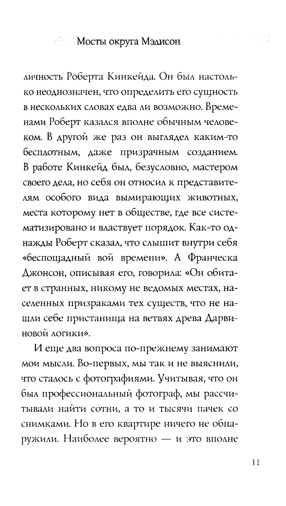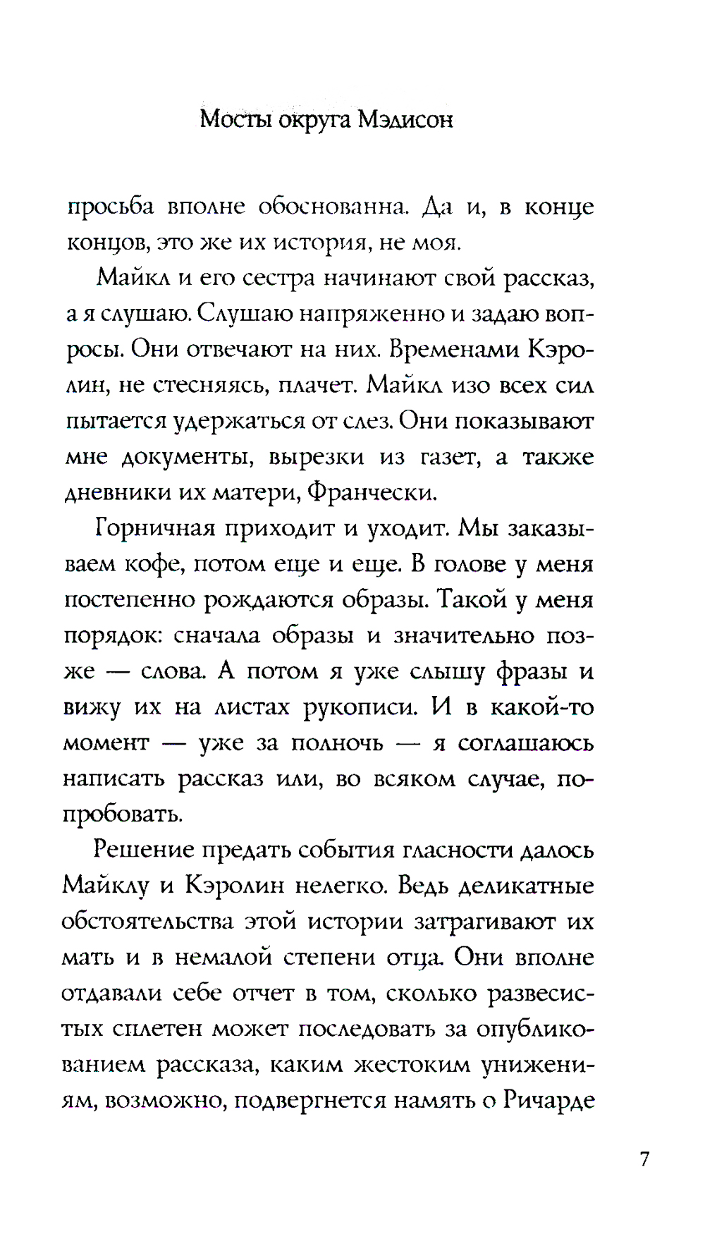 Эта книга - крупнейший литературный феномен Америки, который находился в списке бестселлеров крупнейших газет страны более 90 недель, по праву стал безоговорочным победителем премии ЭББИ. Только в США первый тираж романа тогда никому не известного автора, профессора из Айовы, составил семь миллионов экземпляров. «Мосты округа Мэдисон» - это роман, который пишут только раз в жизни, роман о любви и потере.| Издательство | Рипол Классик |