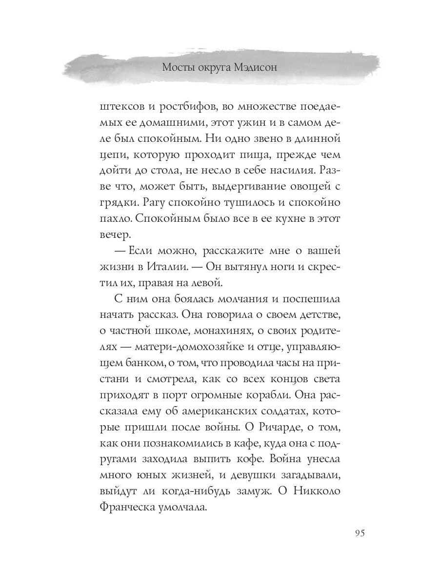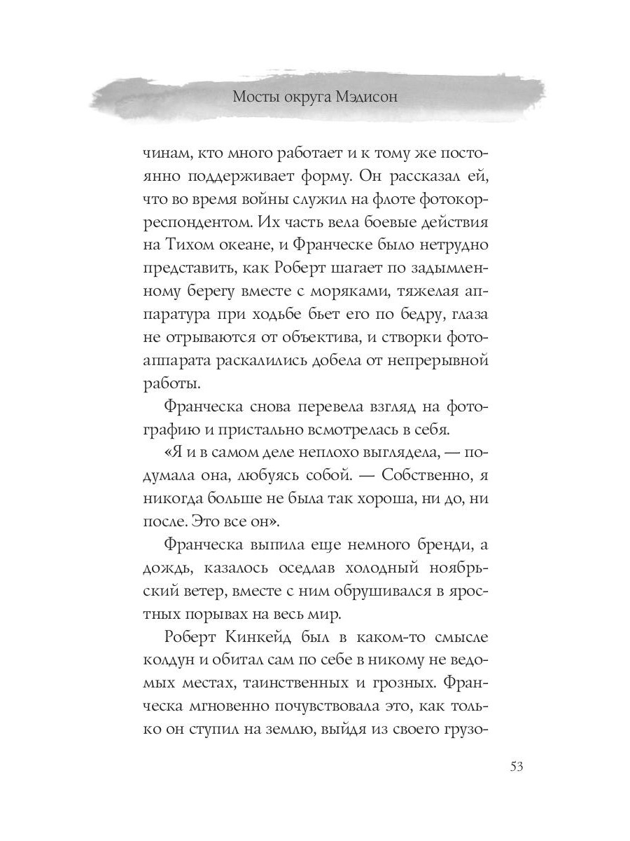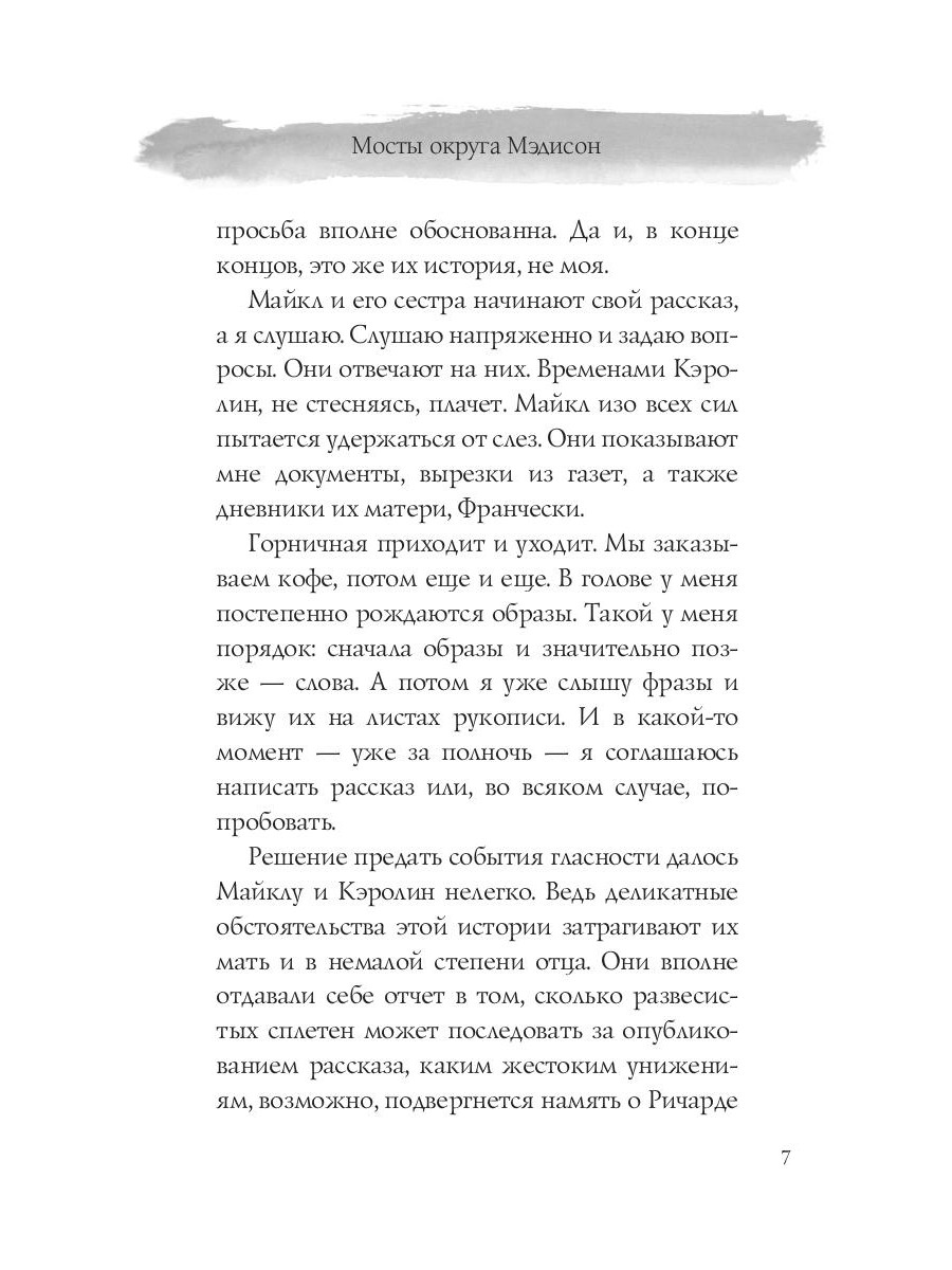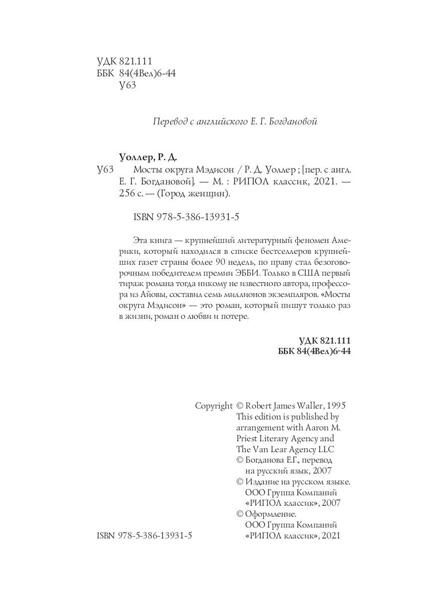 Эта книга - крупнейший литературный феномен Америки, который находился в списке бестселлеров крупнейших газет страны более 90 недель, по праву стал безоговорочным победителем премии ЭББИ. Только в США первый тираж романа тогда никому не известного автора, профессора из Айовы, составил семь миллионов экземпляров. «Мосты округа Мэдисон» - это роман, который пишут только раз в жизни, роман о любви и потере.| Издательство | Рипол Классик |