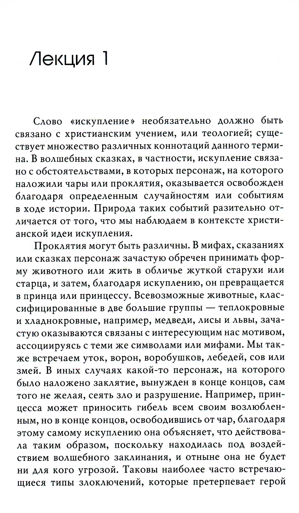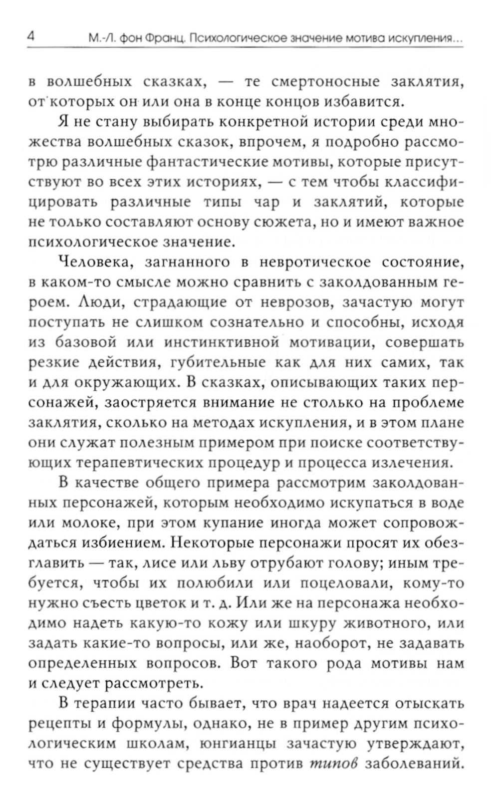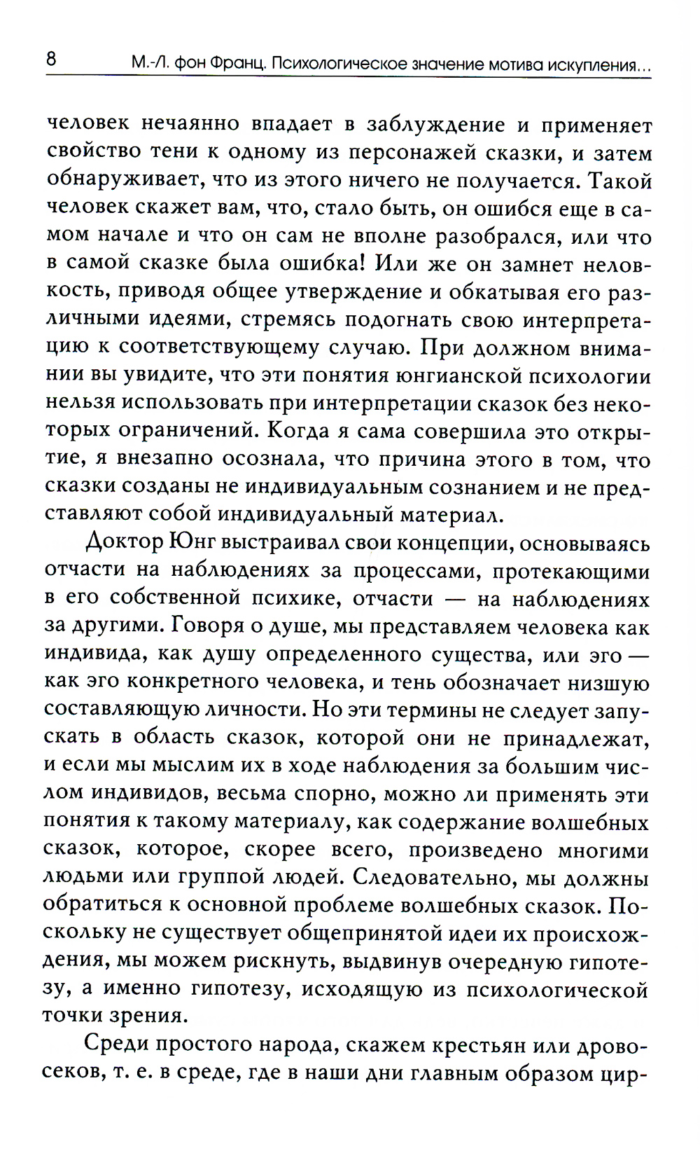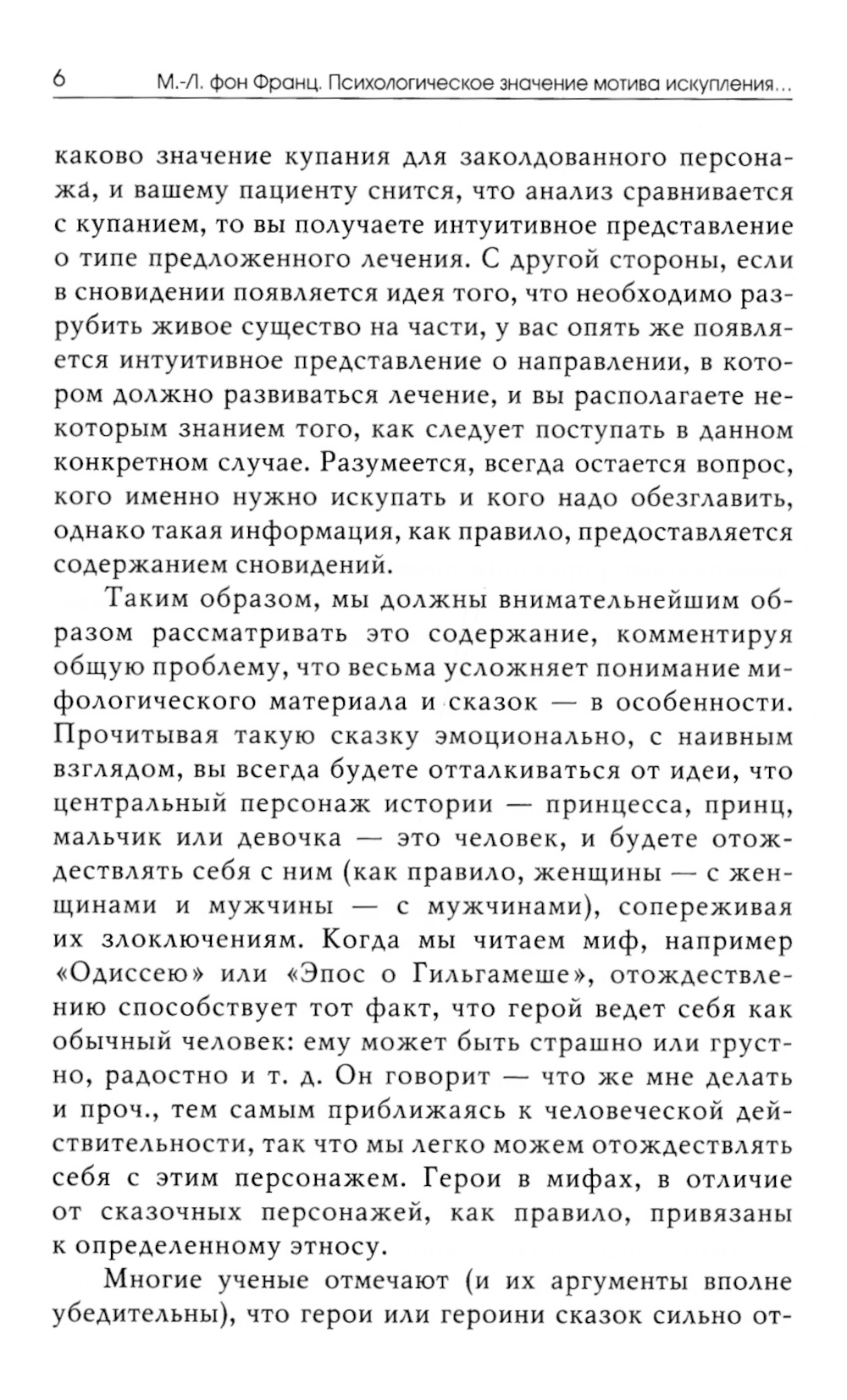 Книга «Мотив искупления в волшебных сказках: психологическое значение» швейцарского психоаналитика, последовательницы Юнга М.-Л. фон Франц, прославленной своими исследованиями в области фольклора и мифологии, впервые вышла в свет в 1980 г. Как в случае со многими другими работами этого автора, в основе этой книги лежит материал курса лекций, прочитанного фон Франц в 1956 г. в Институте им. К.Г. Юнга в Цюрихе. Исходя из основной идеи юнгианского психоанализа, связанной с понятием коллективного бессознательного и населяющих его архетипов, автор приводит богатый материал сказок и мифов различных народов мира, рассматривая его в качестве результата творчества коллективного бессознательного, с тем чтобы через него попытаться осмыслить проблемы индивидуальной психики и отыскать возможные пути их решения. Книга будет интересна не только для специалистов и студентов, изучающих психологию, но также и для широкой аудитории.| Издательство | Академический проект |