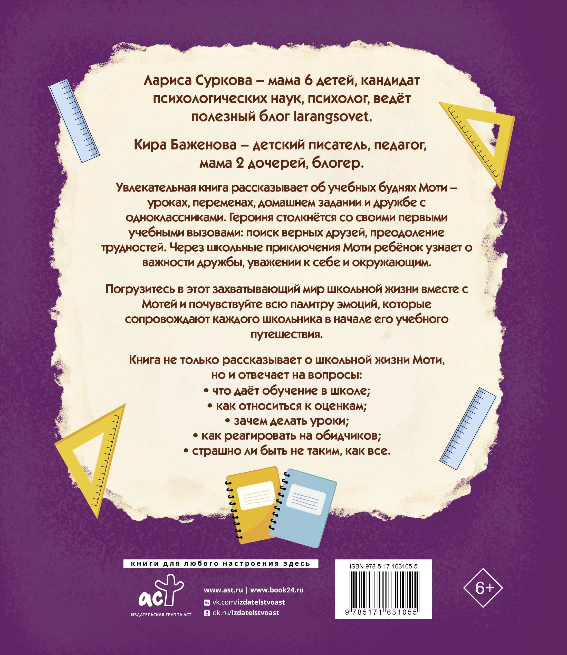 Лариса Суркова - мама 7 детей, кандидат психологических наук, психолог, ведёт полезный блог larangsovet. Кира Баженова - детский писатель, педагог, мама 2 дочерей, блогер. Увлекательная книга рассказывает об учебных буднях девочки Моти − уроках, переменах, домашнем задании и дружбе с одноклассниками. Героиня столкнётся со своими первыми учебными вызовами: поиск верных друзей, преодоление трудностей. Через школьные приключения Моти ребёнок узнает о важности дружбы, уважении к себе и окружающим. Погрузитесь в этот захватывающий мир школьной жизни вместе с Мотей и почувствуйте всю палитру эмоций, которые сопровождают каждого школьника в его начале учебного путешествия. Книга не только рассказывает о школьной жизни Моти, но и отвечает на вопросы: • что даёт обучение в школе; • как относиться к оценкам; • зачем делать уроки; • как реагировать на обидчиков; • страшно ли быть не таким, как все.| Издательство | Издательство "АСТ" |