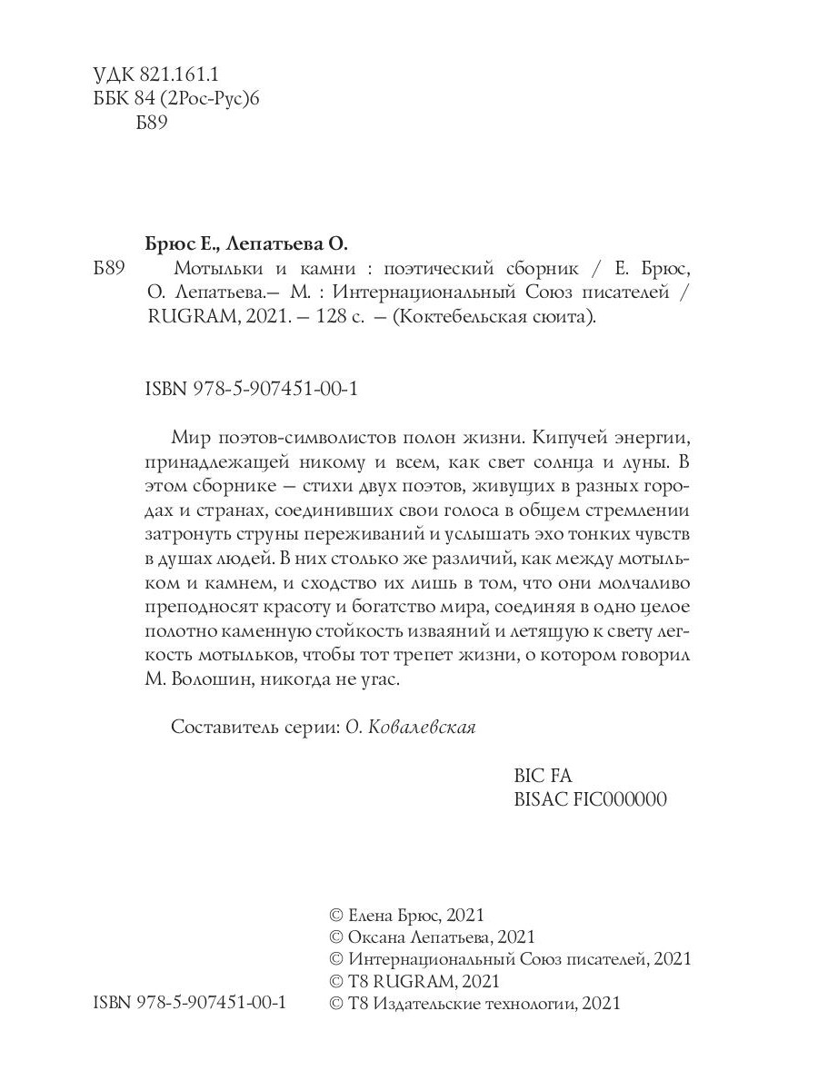 Мир поэтов-символистов полон жизни. Кипучей энергии, принадлежащей никому и всем, как свет солнца и луны. В этом сборнике - стихи двух поэтов, живущих в разных городах и странах, соединивших свои голоса в общем стремлении затронуть струны переживаний и услышать эхо тонких чувств в душах людей. В них столько же различий, как между мотыльком и камнем, и сходство их лишь в том, что они молчаливо преподносят красоту и богатство мира, соединяя в одно целое полотно каменную стойкость изваяний и летящую к свету легкость мотыльков, чтобы тот трепет жизни, о котором говорил М. Волошин, никогда не угас.| Издательство | Т8 RUGRAM |