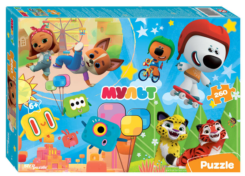 На картинке этого пазла дети увидят персонажей из четырёх современных мультфильмов: "Четверо в кубе", "Лео и Тига", "Ми-Ми-Мишек" и "Кошечек и собачек". Пазл состоит из 260 деталей. Характеристики пазла: - стандартные детали пазла (2×1,7 см); - размер собранного изображения - 24*34,5 см; - материал - картон; - качественное изображение; - экологически чистые, нетоксичные материалы (компания Step Puzzle гарантирует высокое качество пазла и точность подгонки). Для кого? Пазл подходит для детей от 6 лет. Его наверняка оценят любители ярких мультфильмов. Рекомендуем приобрести специальный клей для пазлов, чтобы скрепить детали мозаики между собой и получить цельную картину.| Издательство | Степ Пазл ЗАО |