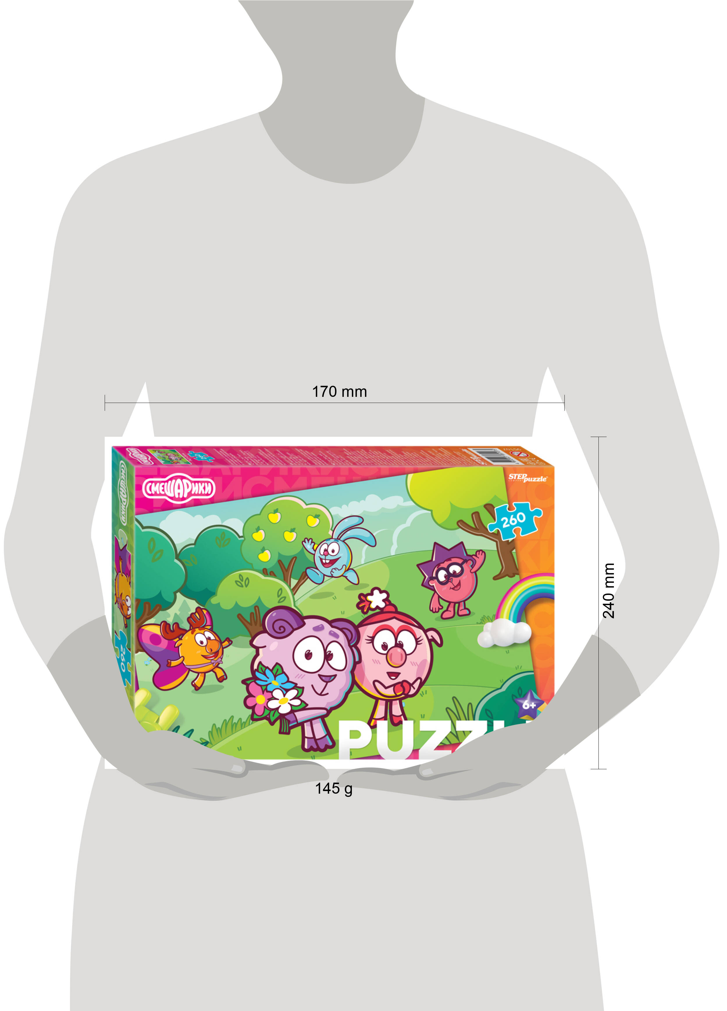 Пазл "Смешарики" состоит из 260 деталей. На его картинке мы видим пятерых героев мультфильма - они гуляют по лесной опушке, играют и веселятся. Характеристики пазла: - стандартные детали пазла (2×1,7 см); - размер собранного изображения - 24*34,5 см; - материал - картон; - качественное изображение; - экологически чистые, нетоксичные материалы (компания Step Puzzle гарантирует высокое качество пазла и точность подгонки). Для кого? Пазл подходит для детей от 6 лет. Пазл "Смешарики" оценят и взрослые, и дети. Для комфортной сборки пазла советуем приобрести специальный коврик. Рекомендуем приобрести специальный клей для пазлов, чтобы скрепить детали мозаики между собой и получить цельную картину.