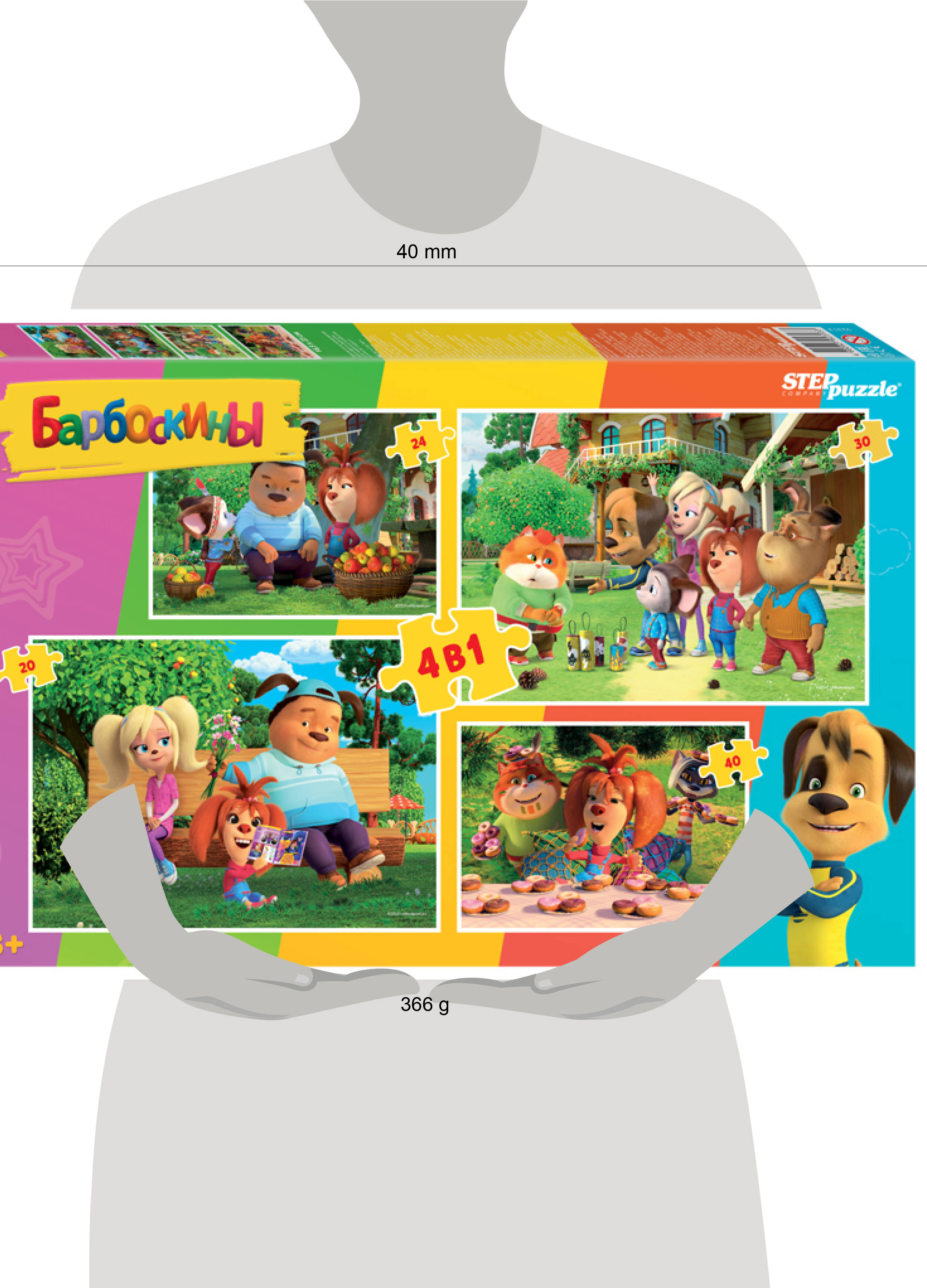 Развивающий набор пазлов 4в1 "Барбоскины" содержит 4 пазла с разным количеством элементов. Развивает воображение и фантазию ребёнка, восприятие цвета и формы. Совершенствует скоординированную работу рук. Тренирует пространственное мышление, глазомер. Учит различать формы деталей. Пазлы из наборов 4 в 1 можно собирать без опоры на картинку, с обратной стороны. Метод "слепой сборки" возможен благодаря уникальному штампу. Каждая деталь имеет свою форму и встает только на свое место. Состав игры: 4 пазла с разным количеством элементов; пазл 20 элементов (крупные детали: ~ 4,5 х 4,5 см.); пазл 24 элемента (крупные детали: ~ 4 х 5 см.) ; пазл 30 элементов (крупные детали: ~ 4 х 5 см.); пазл 40 элементов (крупные детали: ~ 4 х 5 см.). Материал. Картон. Количество игроков. От 1 до 4 игроков. Возраст игроков. Игра подходит для детей от 3 лет.| Издательство | Степ Пазл ЗАО |