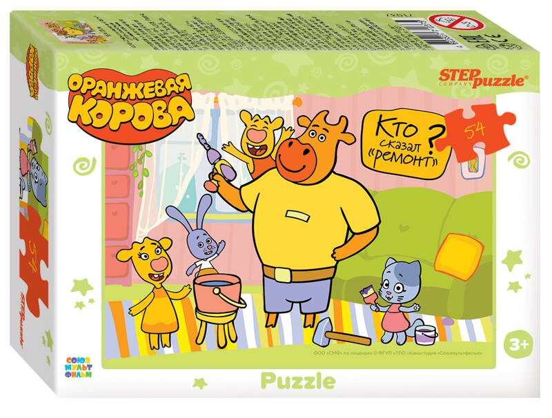 Пазл "Оранжевая корова" состоит из 54 элементов. "Я - бычок, и ты - бычок. Разожми свой кулачок! Перестань копытом бить, снова будем мы дружить" - отрывок мирилки из популярного среди детей и взрослых мультфильма. Главные герои - семья из папы Быка, мамы Коровы, брата и сестры. Самые маленькие члены семьи, несмотря на свою дружелюбность, только изучают мир, и, иногда сталкиваются с ситуациями, в которых бывают неправы. В такие моменты мирилка нужна как никогда. В новой серии пазлов сразу пять картинок. Пазломаны смогут окунуться в атмосферу, где вся семья отдыхает, гуляет в лесу, делает ремонт, или спешит продегустировать мамин пирог. Характеристики пазла: - стандартные детали пазла (2×1,8 см); - размер собранного изображения - 18*13 см; - материал - картон; - качественное изображение; - экологически чистые, нетоксичные материалы (компания Step Puzzle гарантирует высокое качество пазла и точность подгонки). Для кого? Пазл подходит для взрослых и детей от 3 лет. Пазл "Оранжевая корова" станет прекрасным подарком для любителей приключений. Рекомендуем приобрести специальный клей для пазлов, чтобы скрепить детали мозаики между собой и получить цельную картину. Также с этим пазлом покупают специальный коврик для комфортной сборки пазла.| Издательство | Степ Пазл ЗАО |