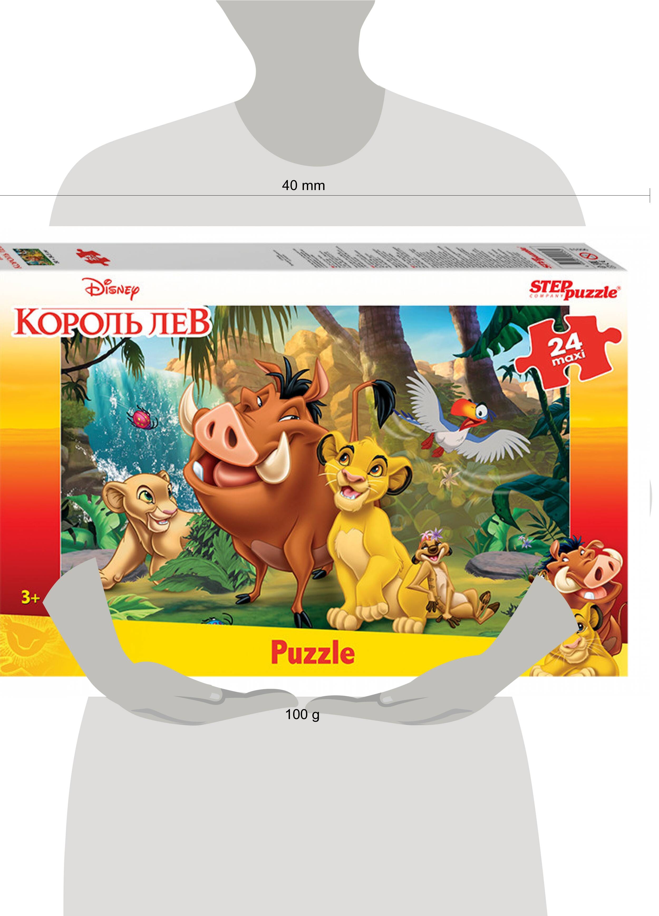 Пазл "Король Лев" выпущен по мотивам многими любимого мультфильма корпорации Disney. На картинке представлены любимцы взрослых и детей - львята Симба и его подружка Нала, неразлучные друзья Тимон и Пумба, а также тукан Дэн. Пазл состоит из 24 крупных деталей, размер одного элемента сопоставим с ладонью взрослого человека. Ребенку будет легко с ними играть и составлять картинку, также большие детали будет сложно потерять. Характеристики пазла: - крупные детали пазла (8×8,5 см); - размер собранного изображения - 50*34,5 см; - материал - картон; - качественное изображение; - экологически чистые, нетоксичные материалы (компания Step Puzzle гарантирует высокое качество пазла и точность подгонки). Для кого? Пазл подходит для детей от 3 лет. Яркий пазл "Король Лев" точно понравится детям. А там и мультфильм можно пересмотреть. Рекомендуем приобрести специальный клей для пазлов, чтобы скрепить детали мозаики между собой и получить цельную картину.| Издательство | Степ Пазл ЗАО |